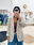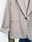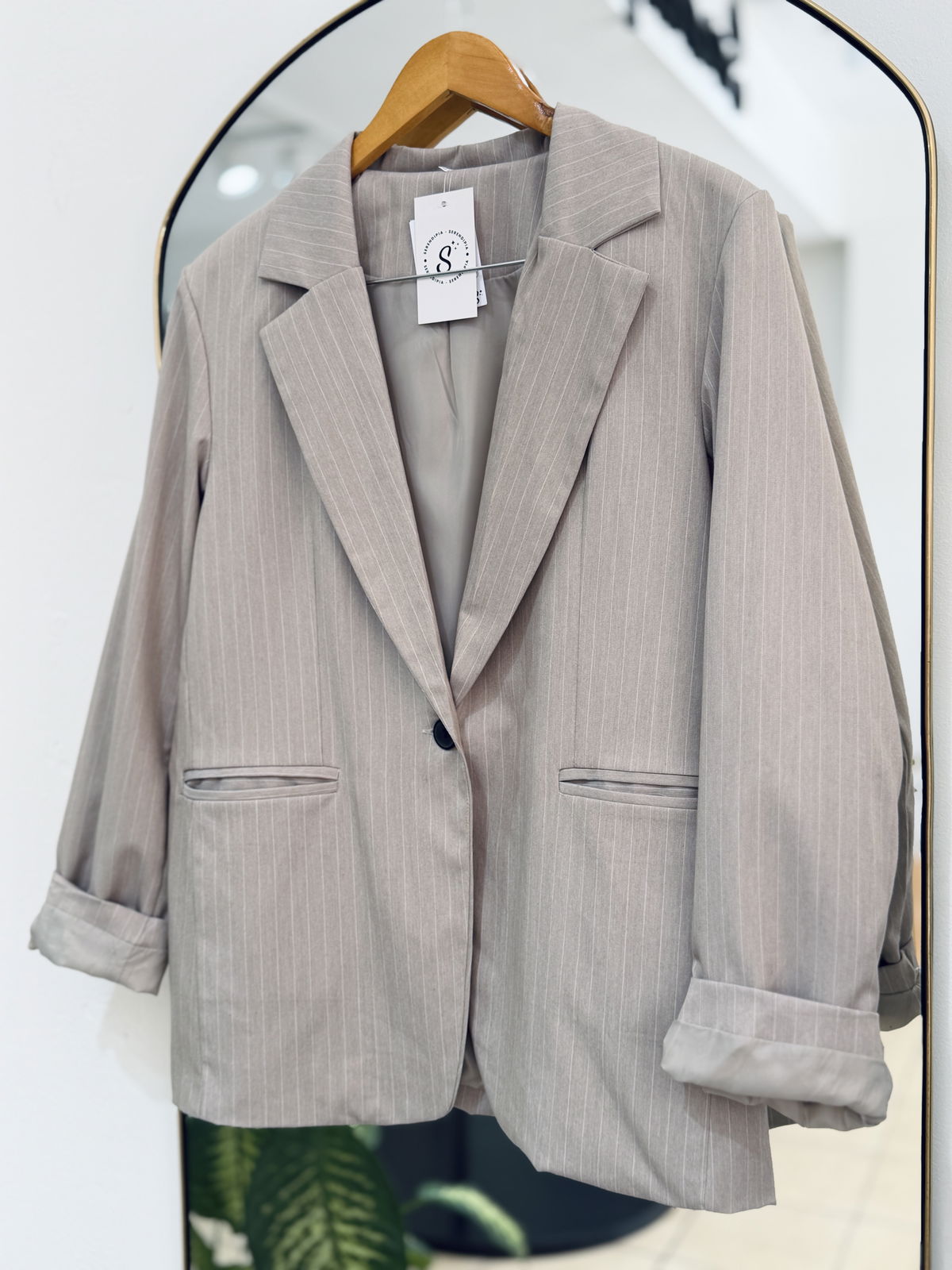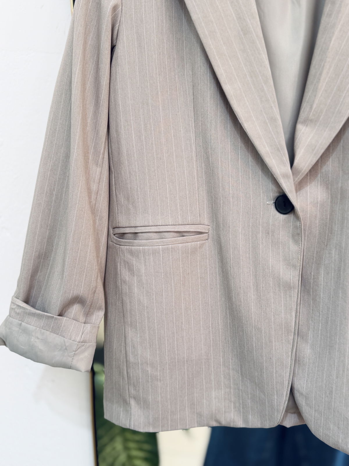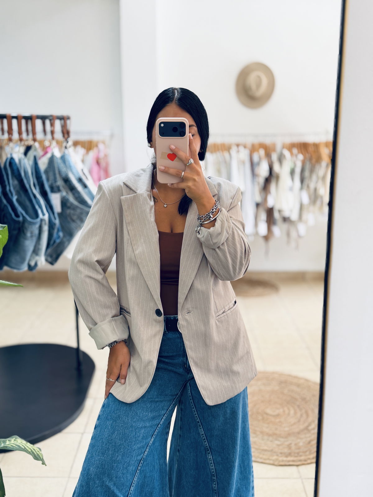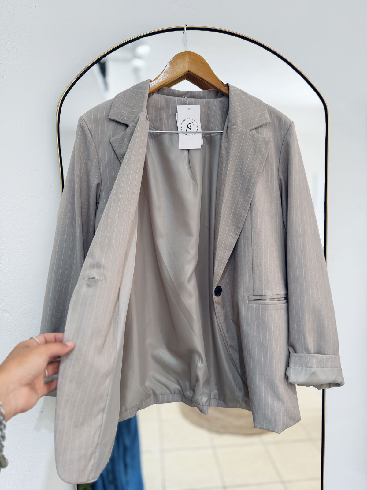 Blazer sastrero rayado con hombreras, forrado y bolsillos laterales con solapa. Toño visón con líneas en blanco modelo oversize, Lau está usando talle 1