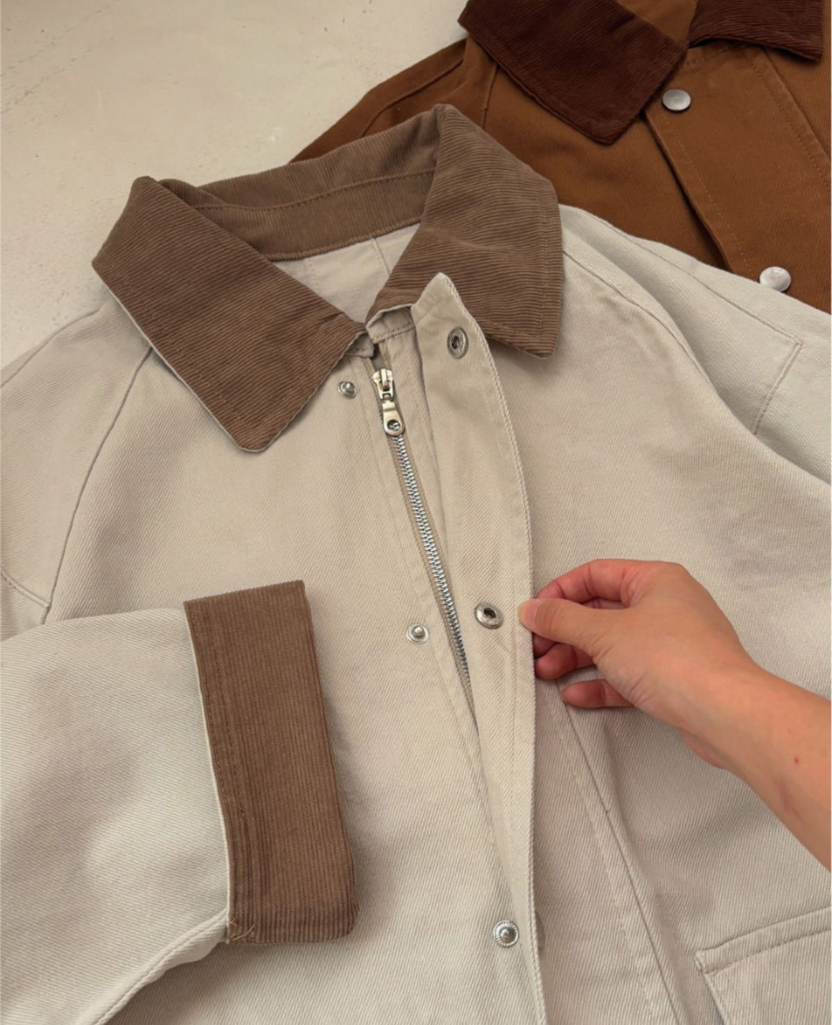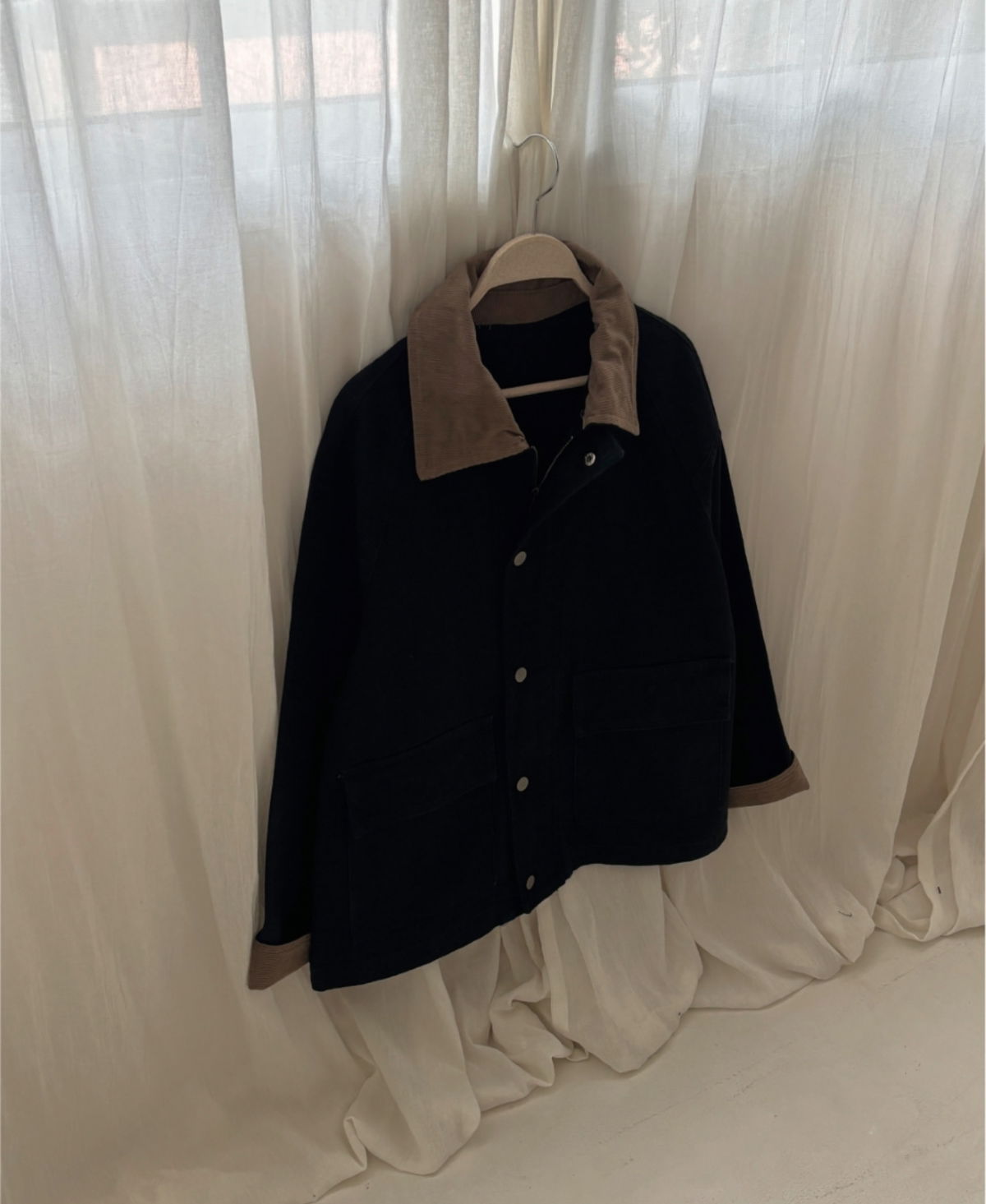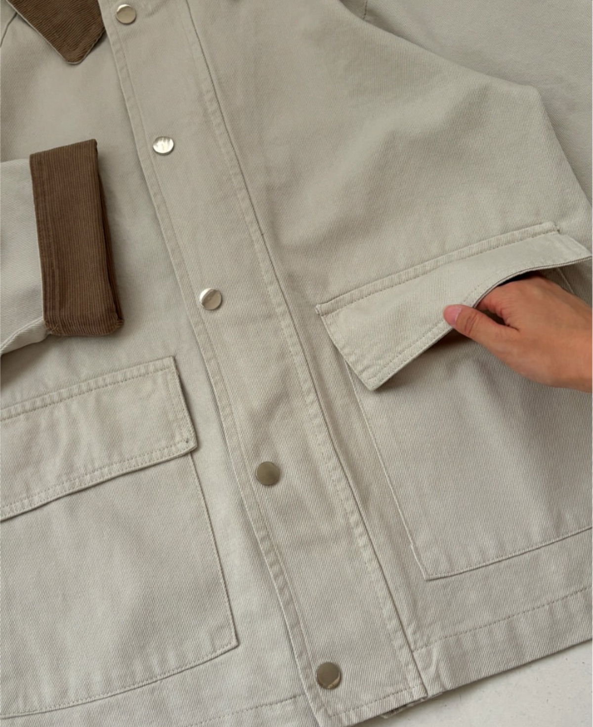 Campera de gabardina con diseño clásico y detalles en contraste que aportan carácter y estilo. Su cuello y puños de corderoy suman textura y un aire sofisticado, mientras que el cierre frontal combina broches metálicos con cierre interno para mayor abrigo. Los bolsillos delanteros amplios la hacen práctica y funcional. Una prenda versátil que eleva cualquier look de temporada.