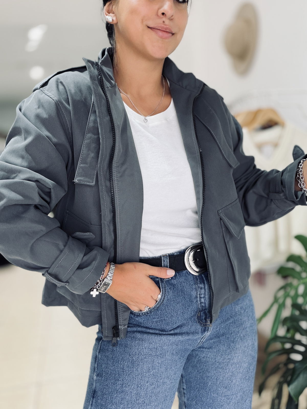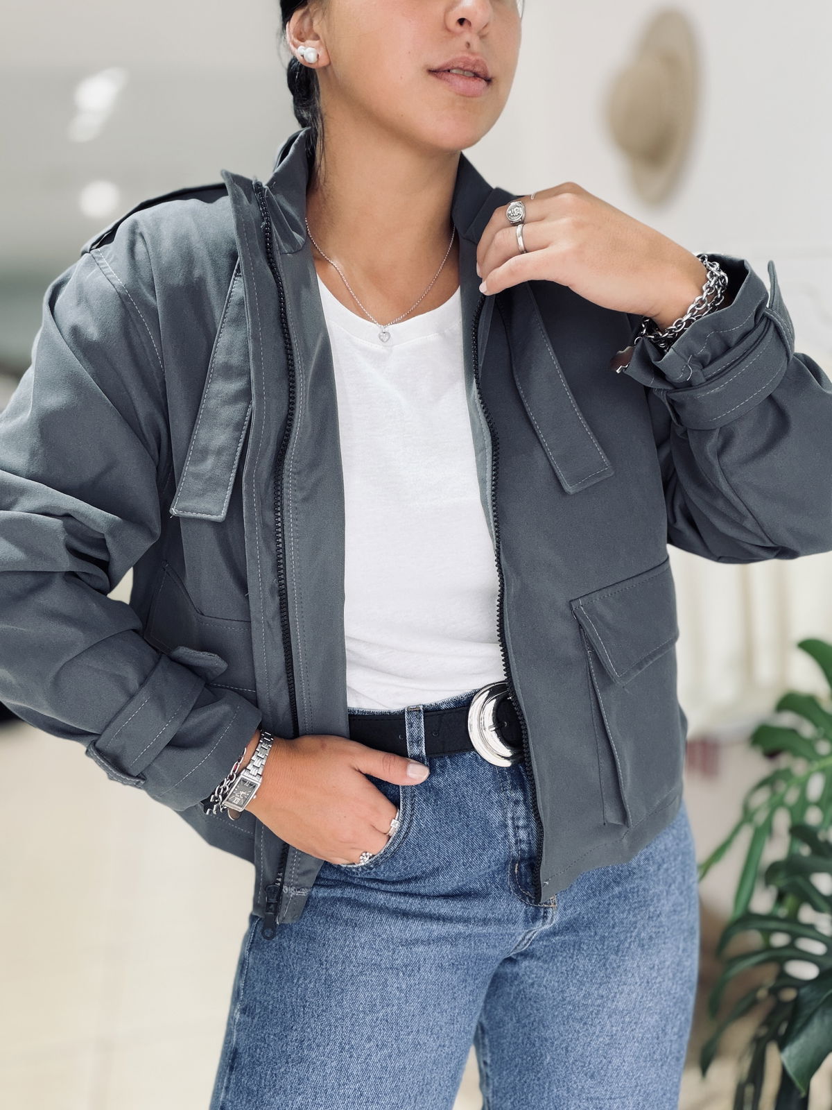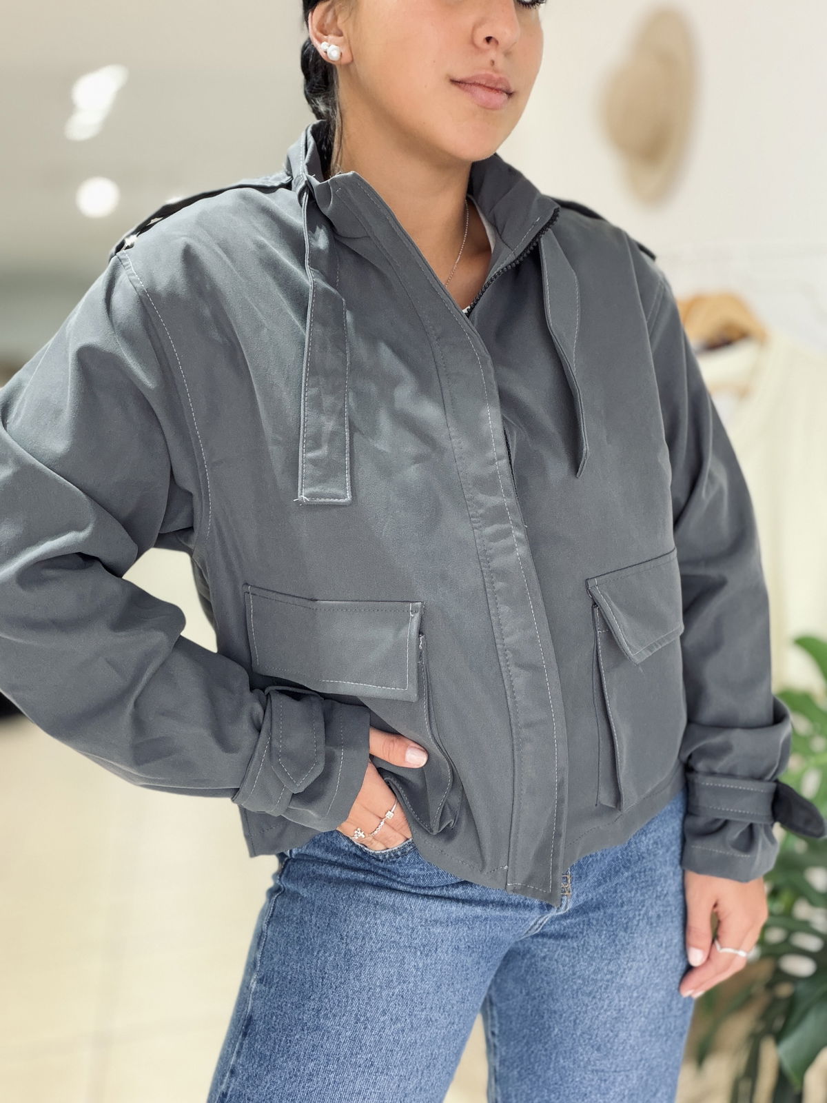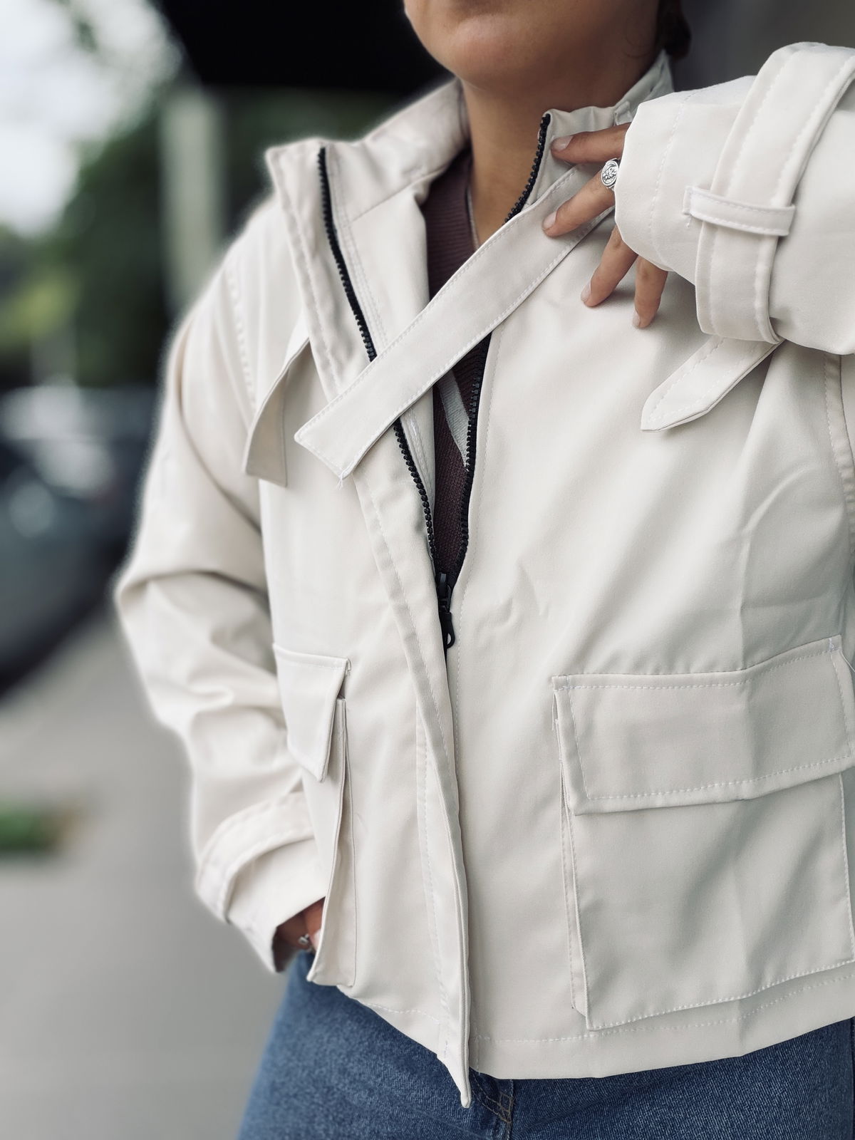 Campera estilo utility de corte cropped, con diseño moderno y funcional. Cuenta con cierre frontal, bolsillos cargo con tapa y detalles de tiras que le aportan un toque distintivo. Su calce relajado y estructura liviana la hacen ideal para media estación. Disponible en verde grisáceo y crudo.