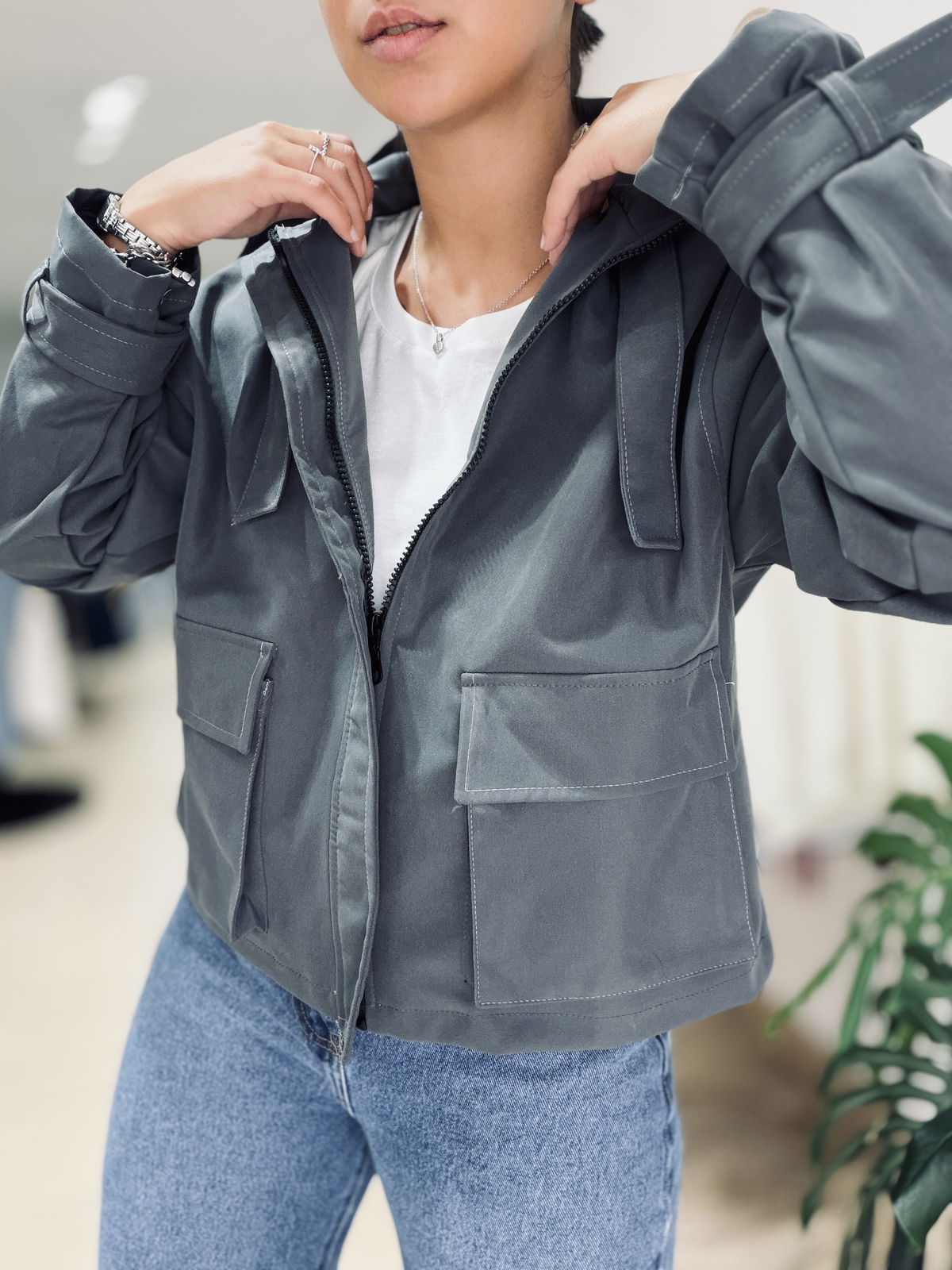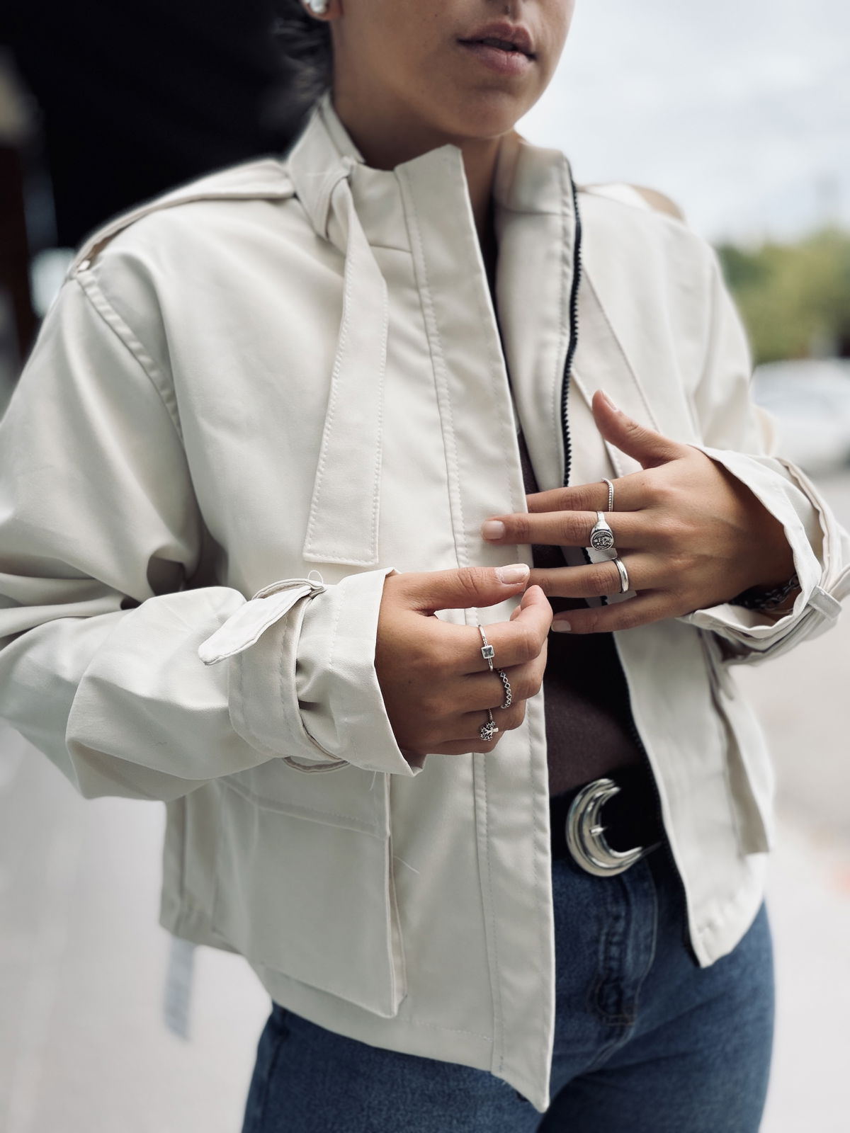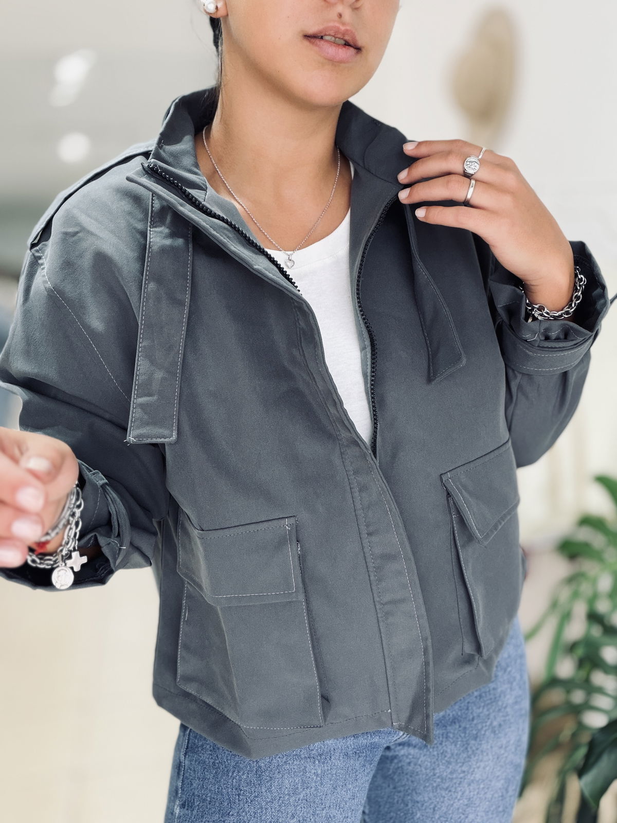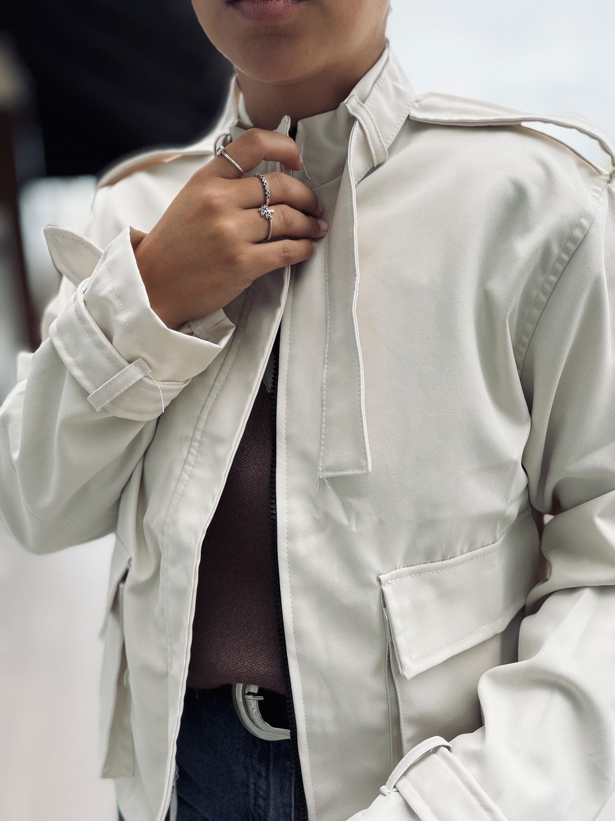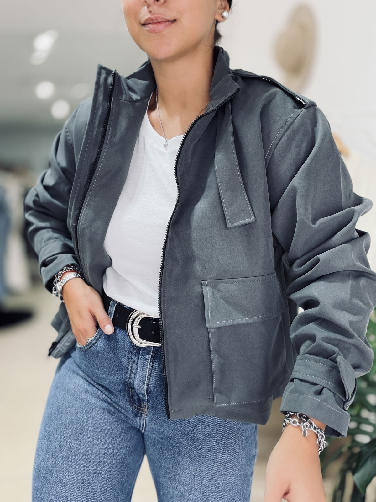 Campera estilo utility de corte cropped, con diseño moderno y funcional. Cuenta con cierre frontal, bolsillos cargo con tapa y detalles de tiras que le aportan un toque distintivo. Su calce relajado y estructura liviana la hacen ideal para media estación. Disponible en verde grisáceo y crudo.