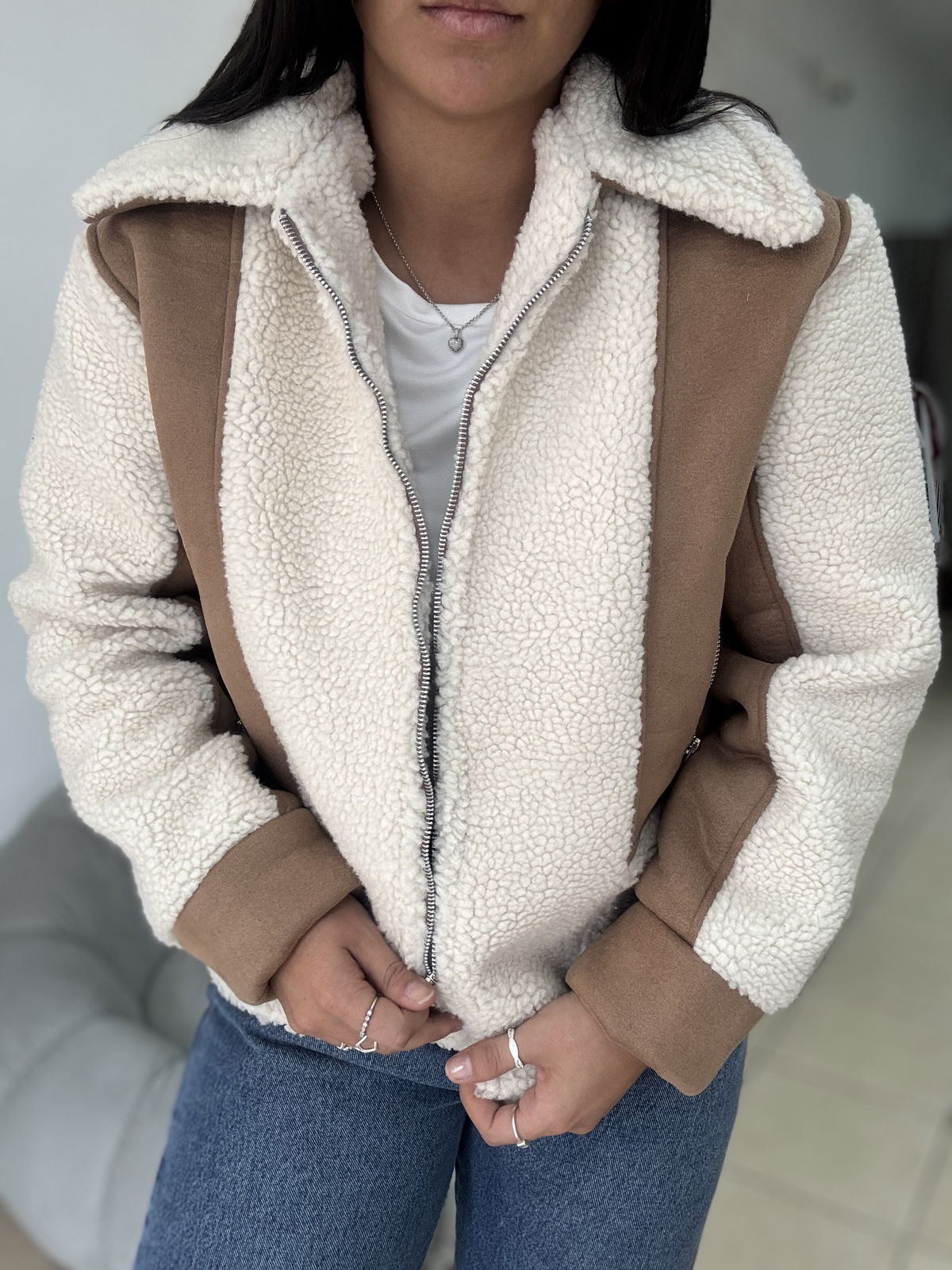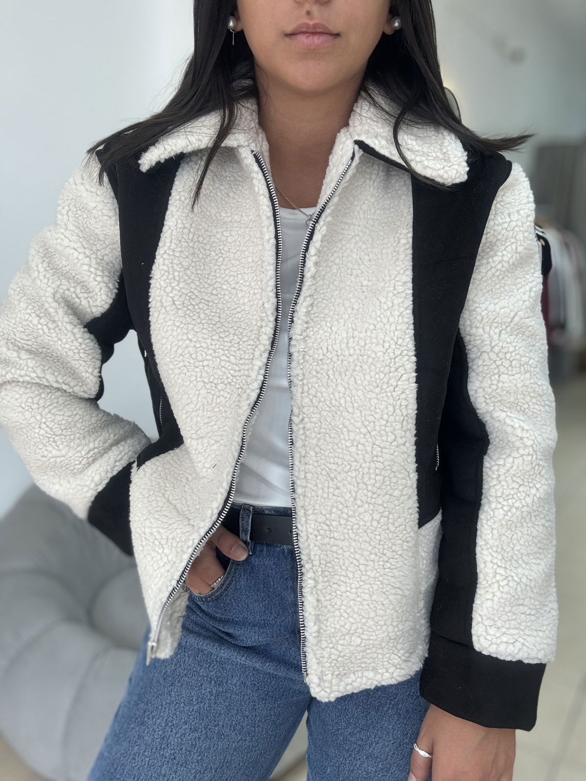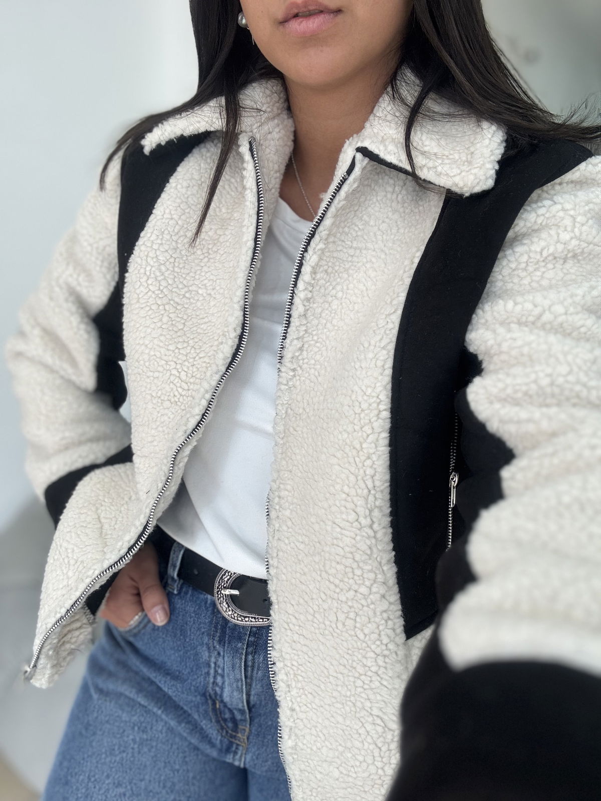 Campera de corderito y gamuza, con cierre frontal y en bolsillos.