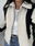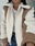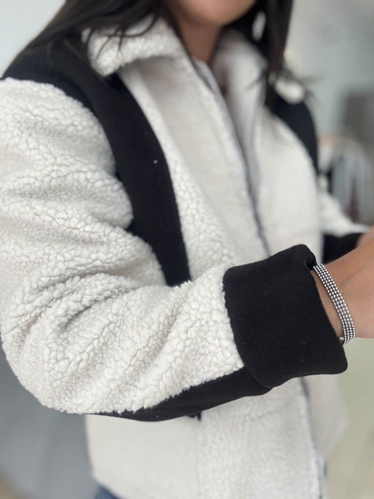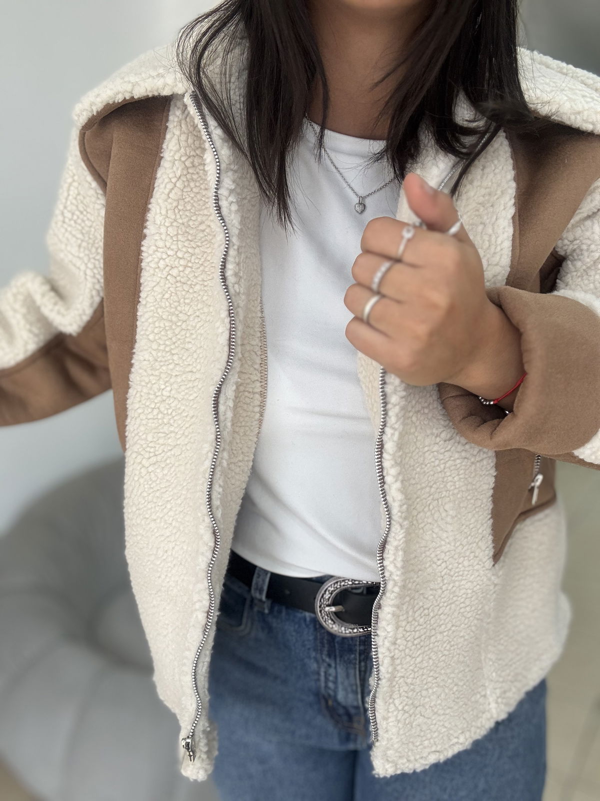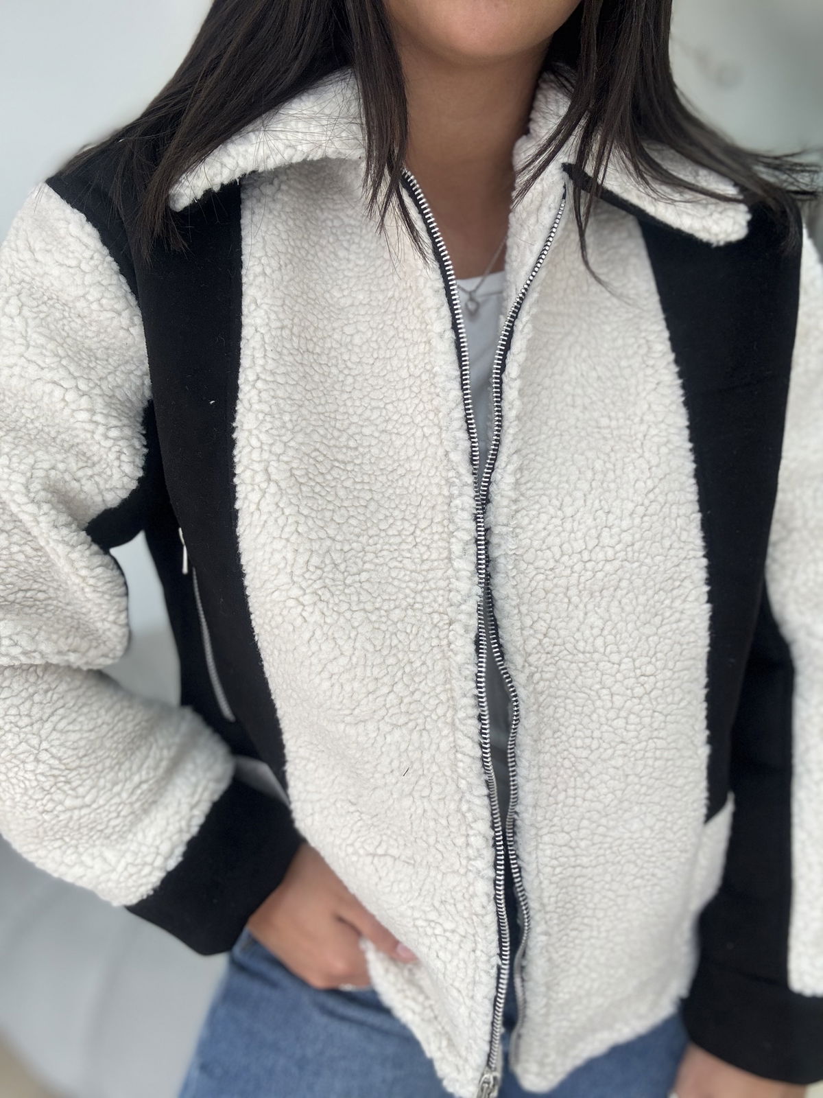 Campera de corderito y gamuza, con cierre frontal y en bolsillos.