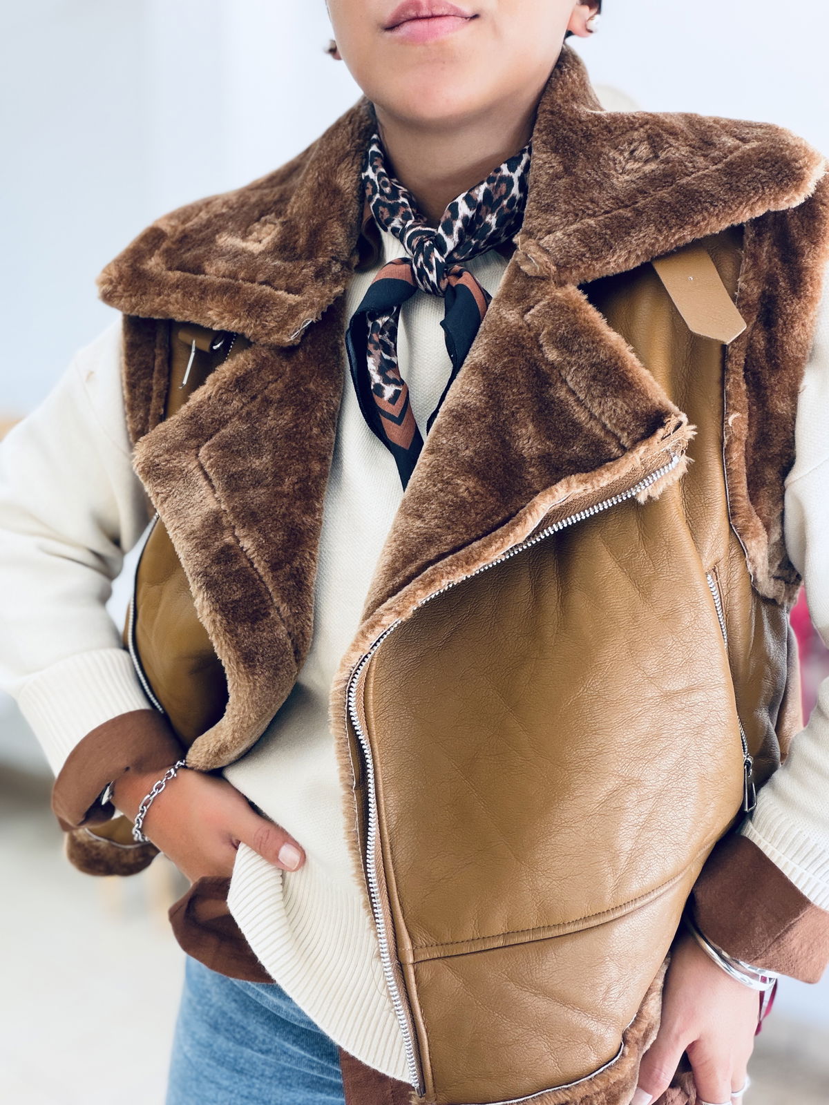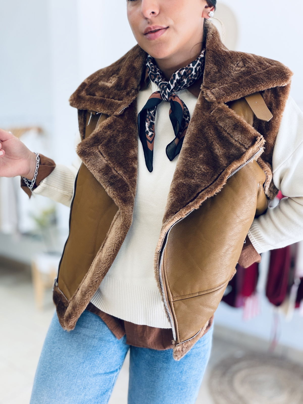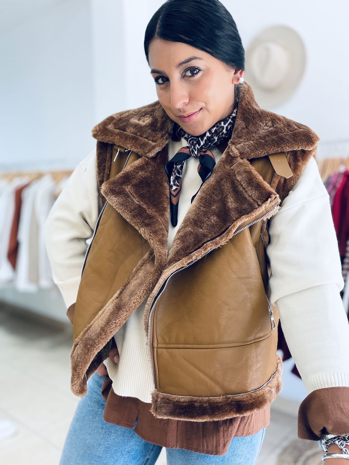 Chaleco tipo gamulan en tono camel con interior y terminaciones en piel sintética suave. Su diseño con cierre diagonal y cuello amplio aporta abrigo y estilo, convirtiéndolo en una prenda ideal para sumar capas en los días fríos. Perfecto para combinar con sweaters, camisas o básicos y también porque no para la noche!