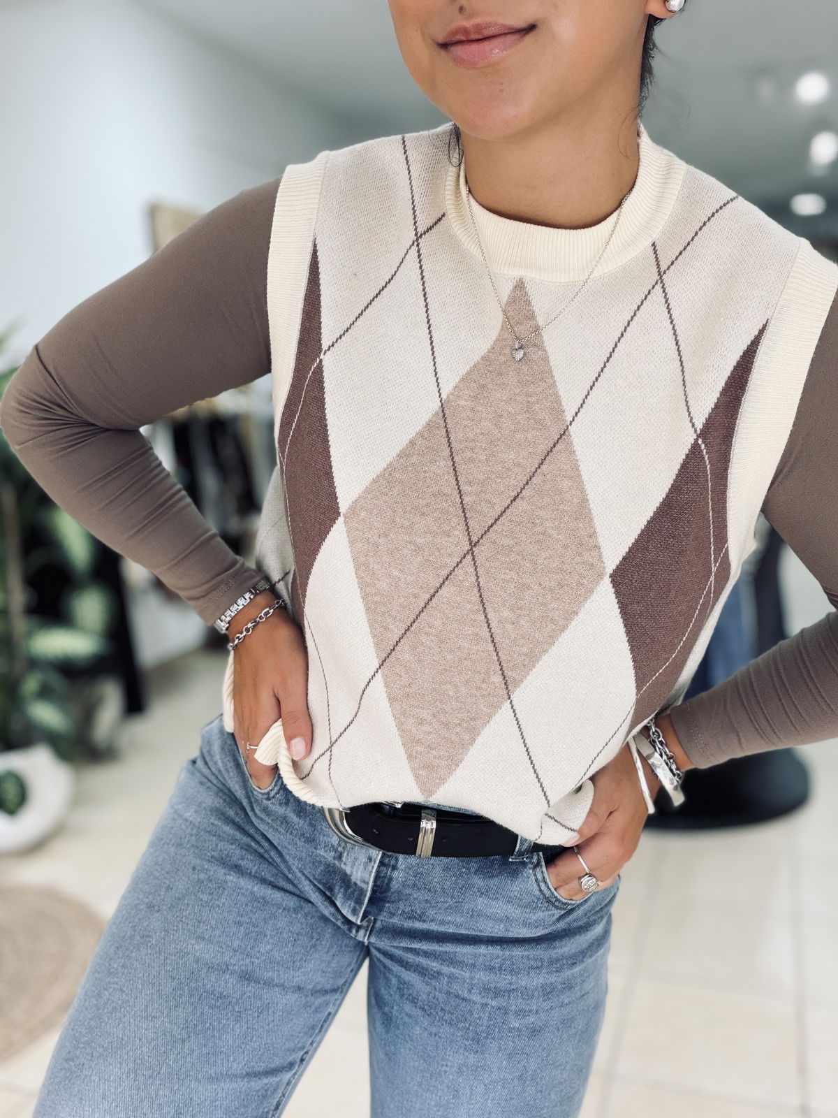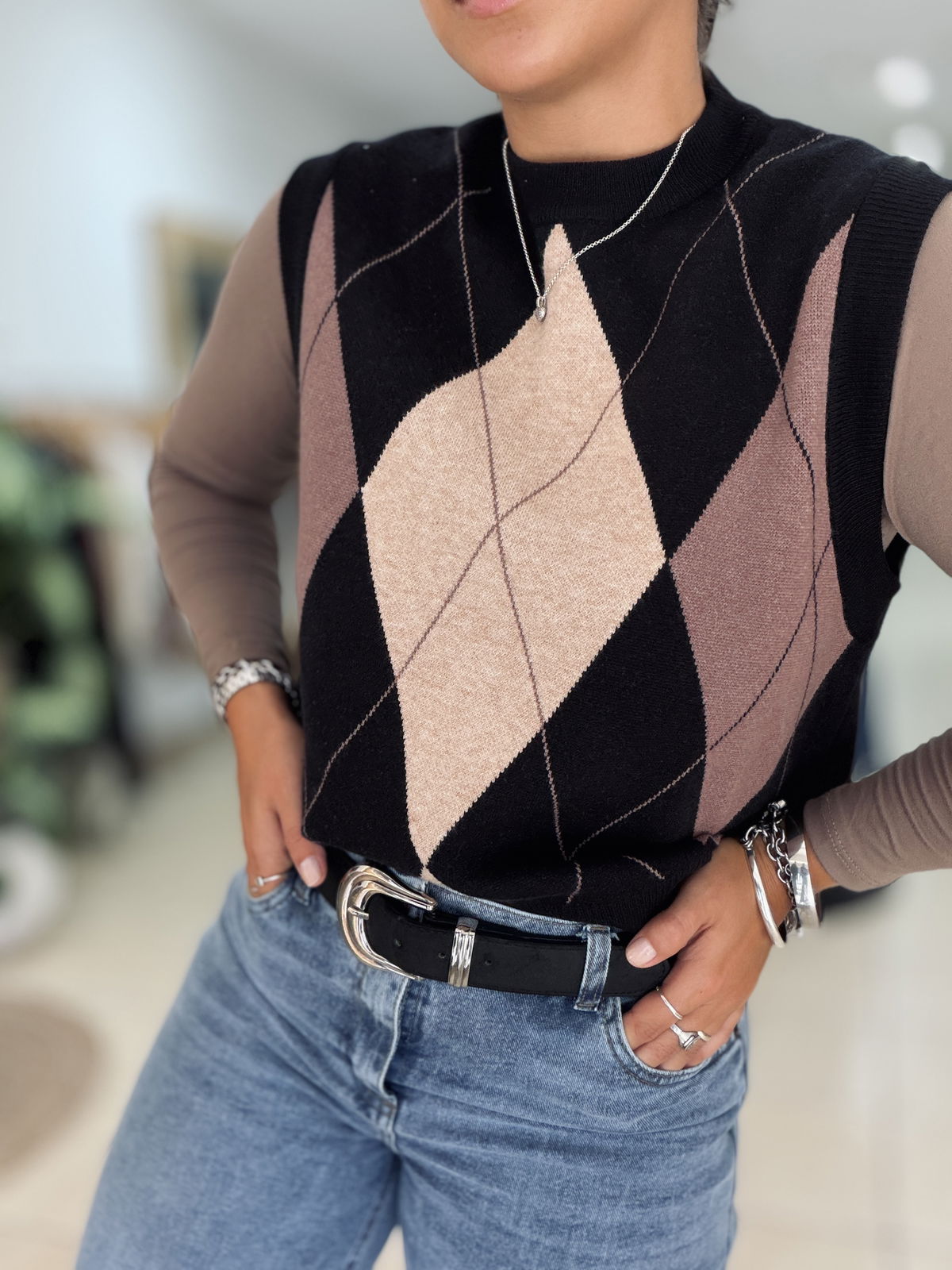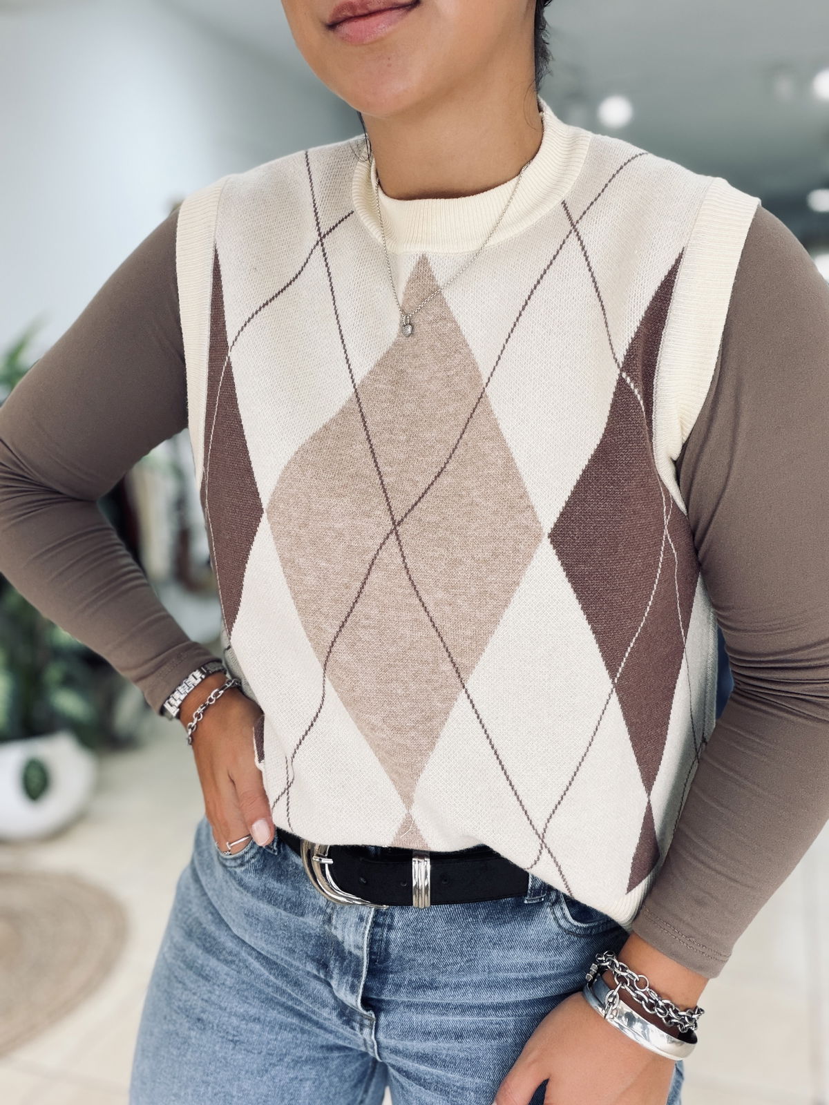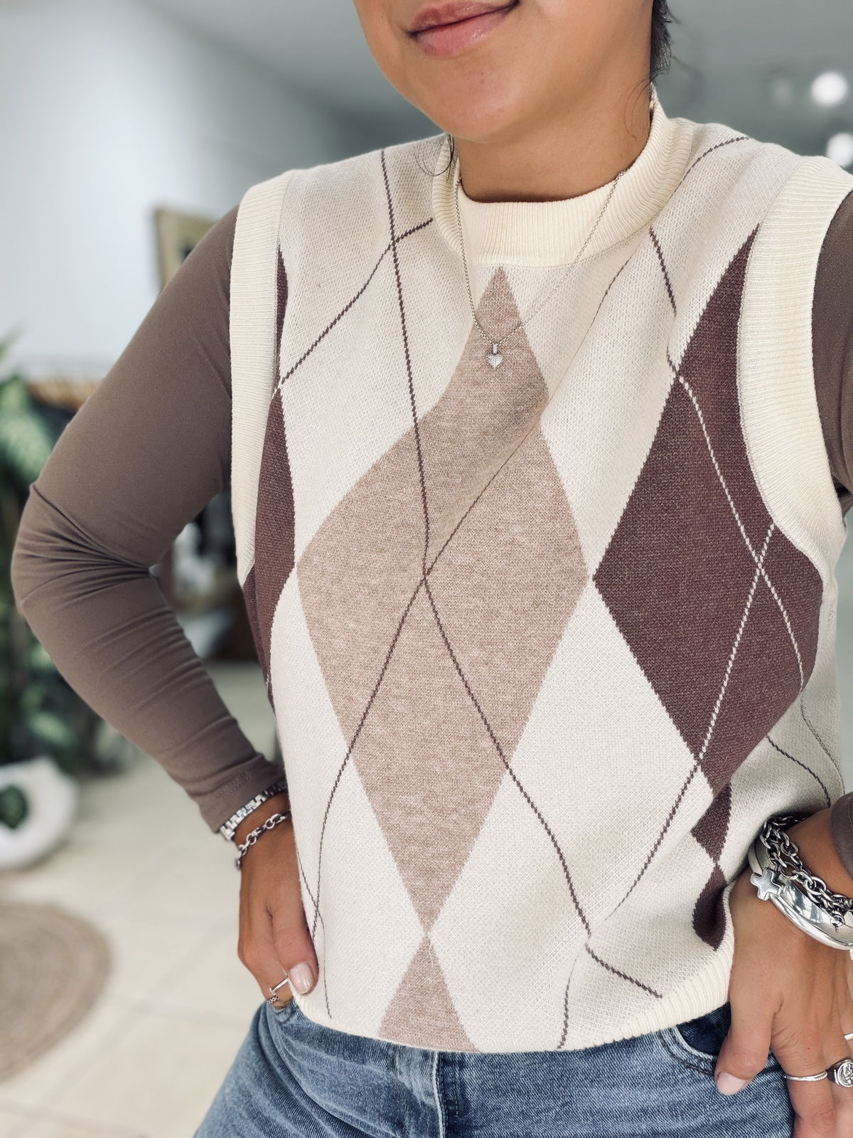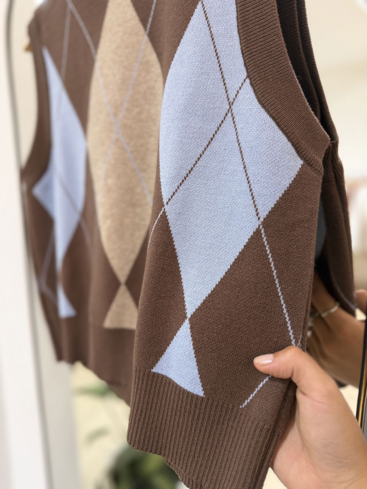 Chaleco tejido con diseño rombos en tonos neutros, ideal para sumar textura y estilo a tus looks de temporada. Su calce cómodo y cuello alto lo convierten en una prenda versátil, perfecta para usar sobre camisas, poleras o remeras básicas.