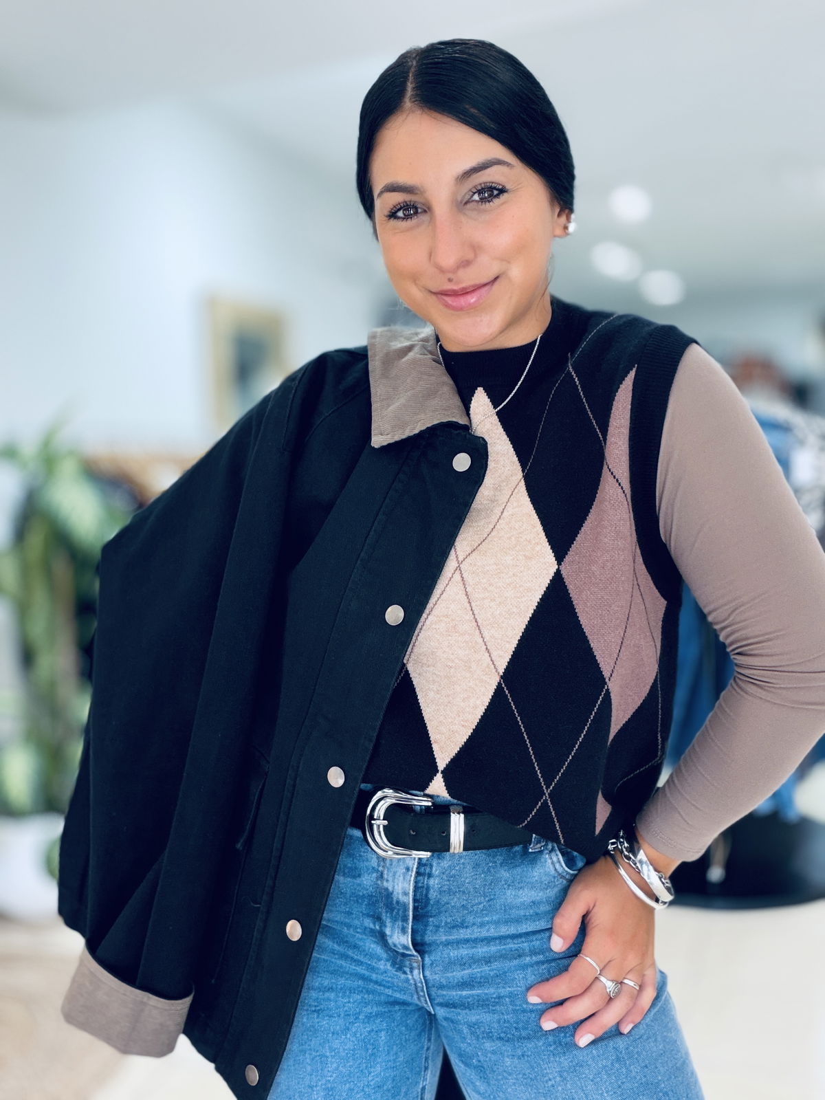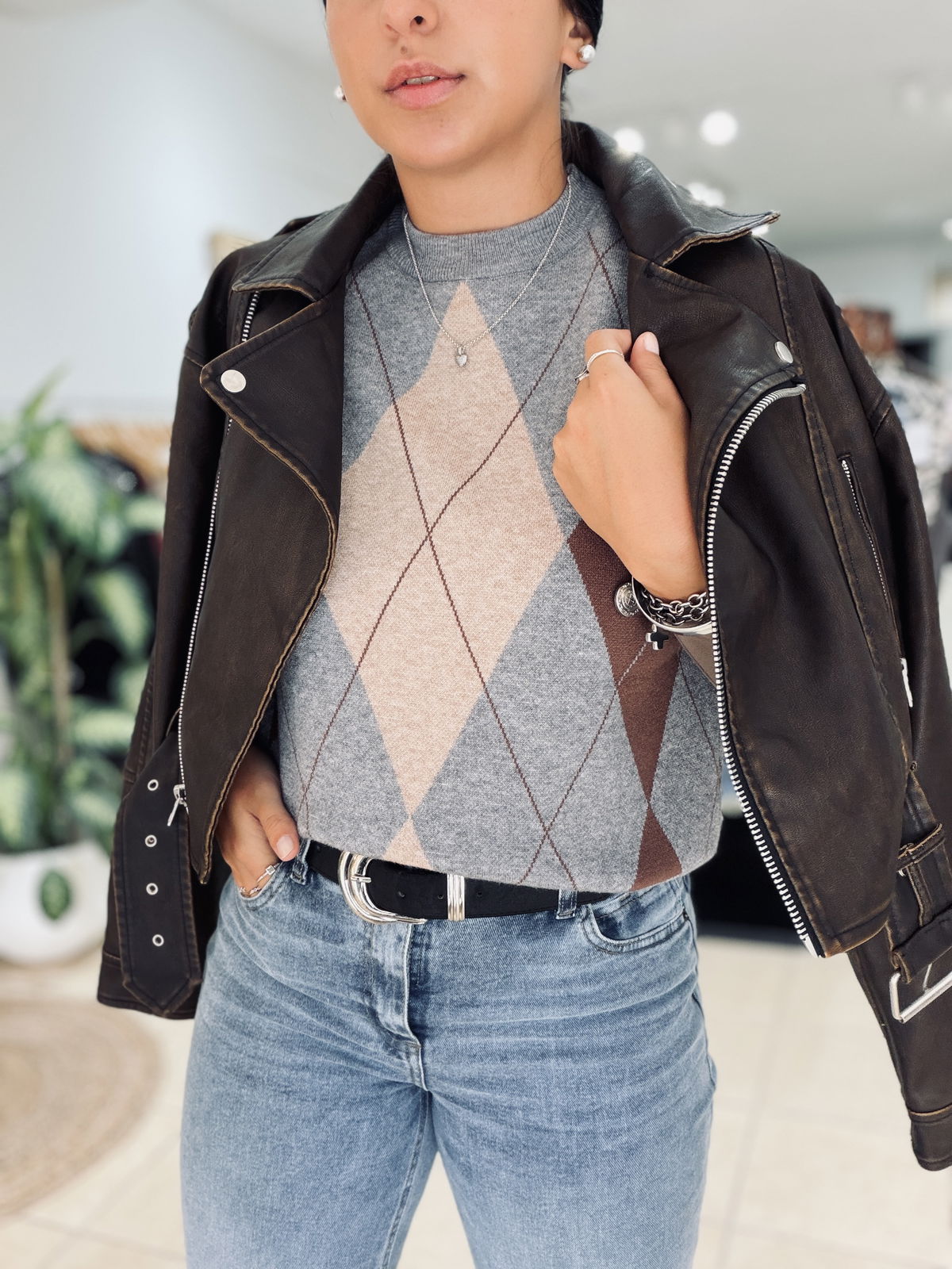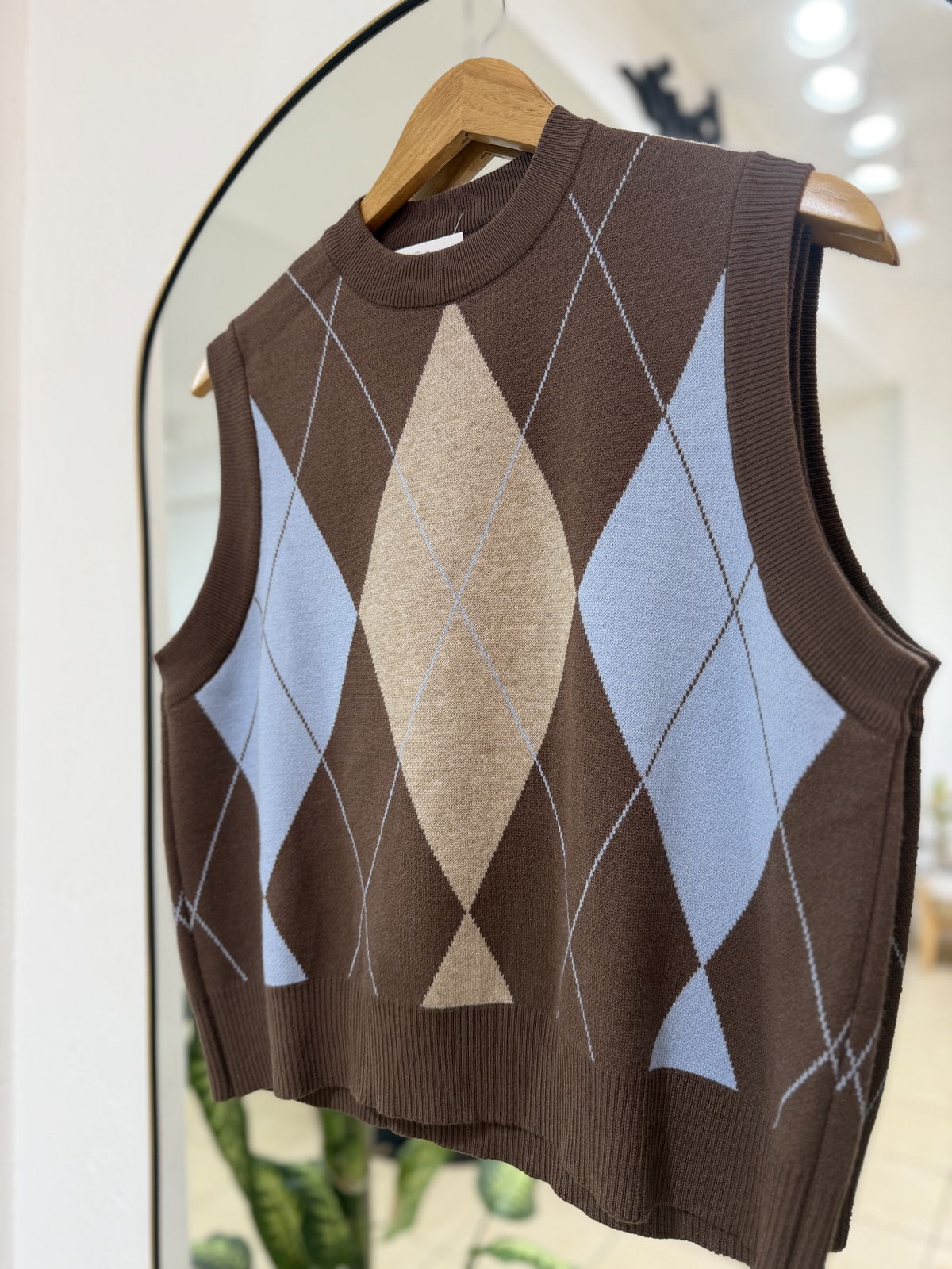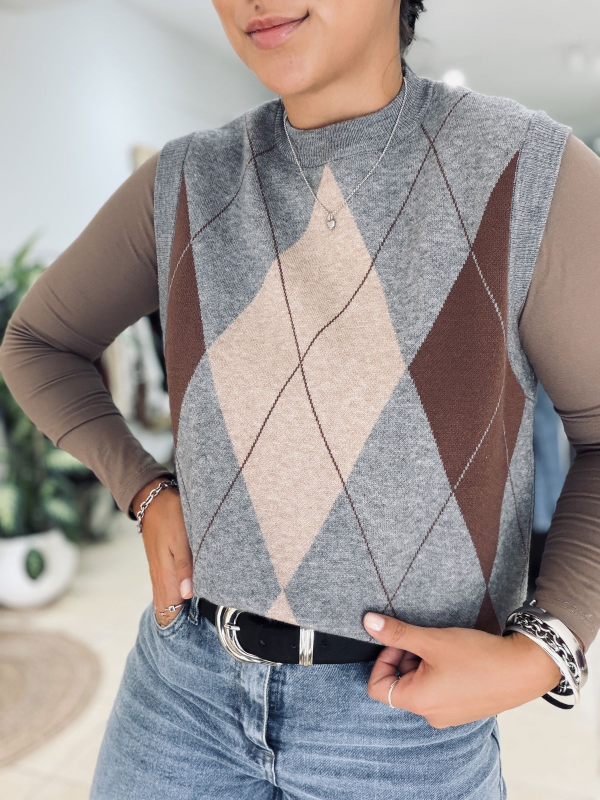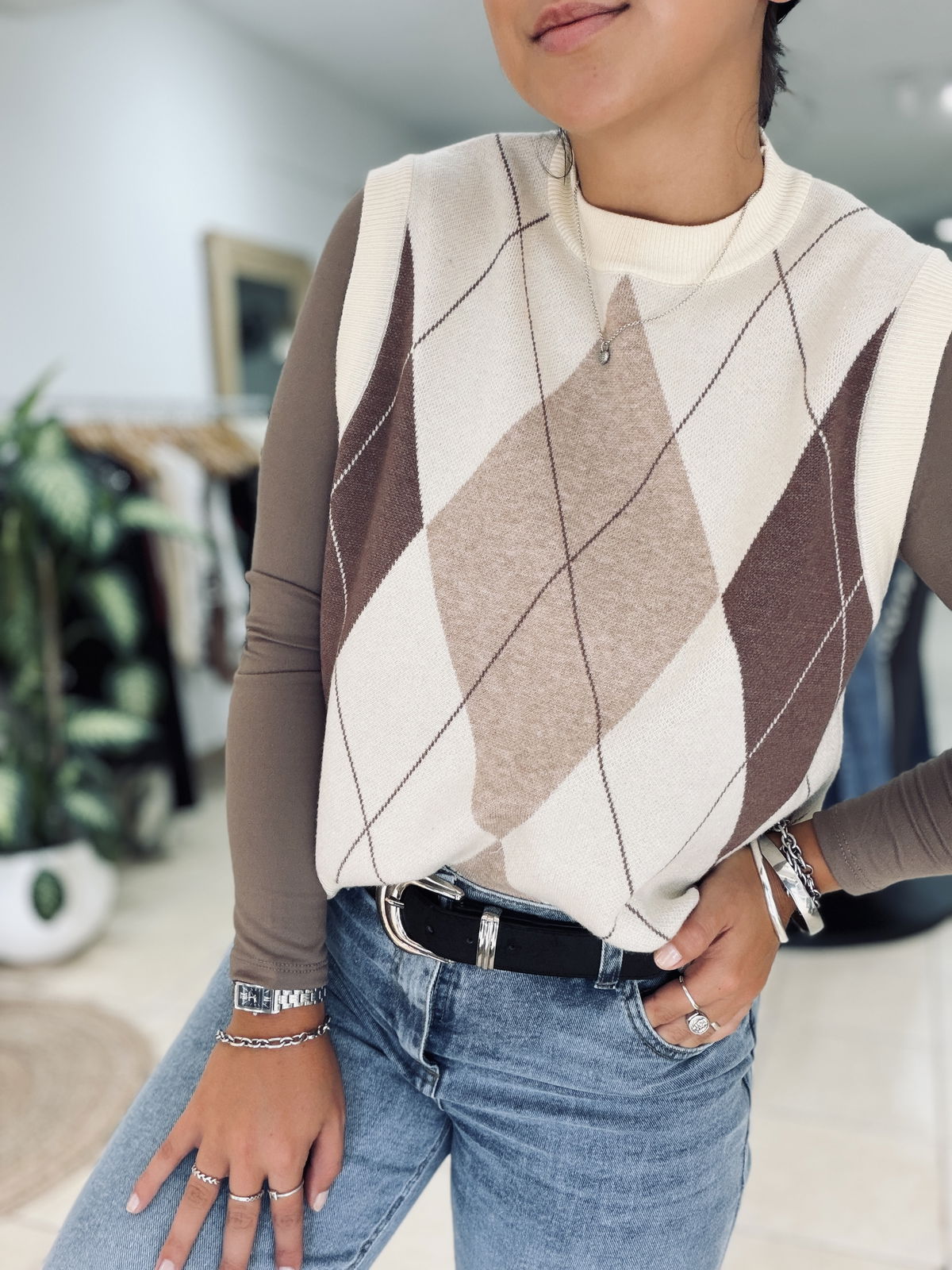Chaleco tejido con diseño rombos en tonos neutros, ideal para sumar textura y estilo a tus looks de temporada. Su calce cómodo y cuello alto lo convierten en una prenda versátil, perfecta para usar sobre camisas, poleras o remeras básicas.
