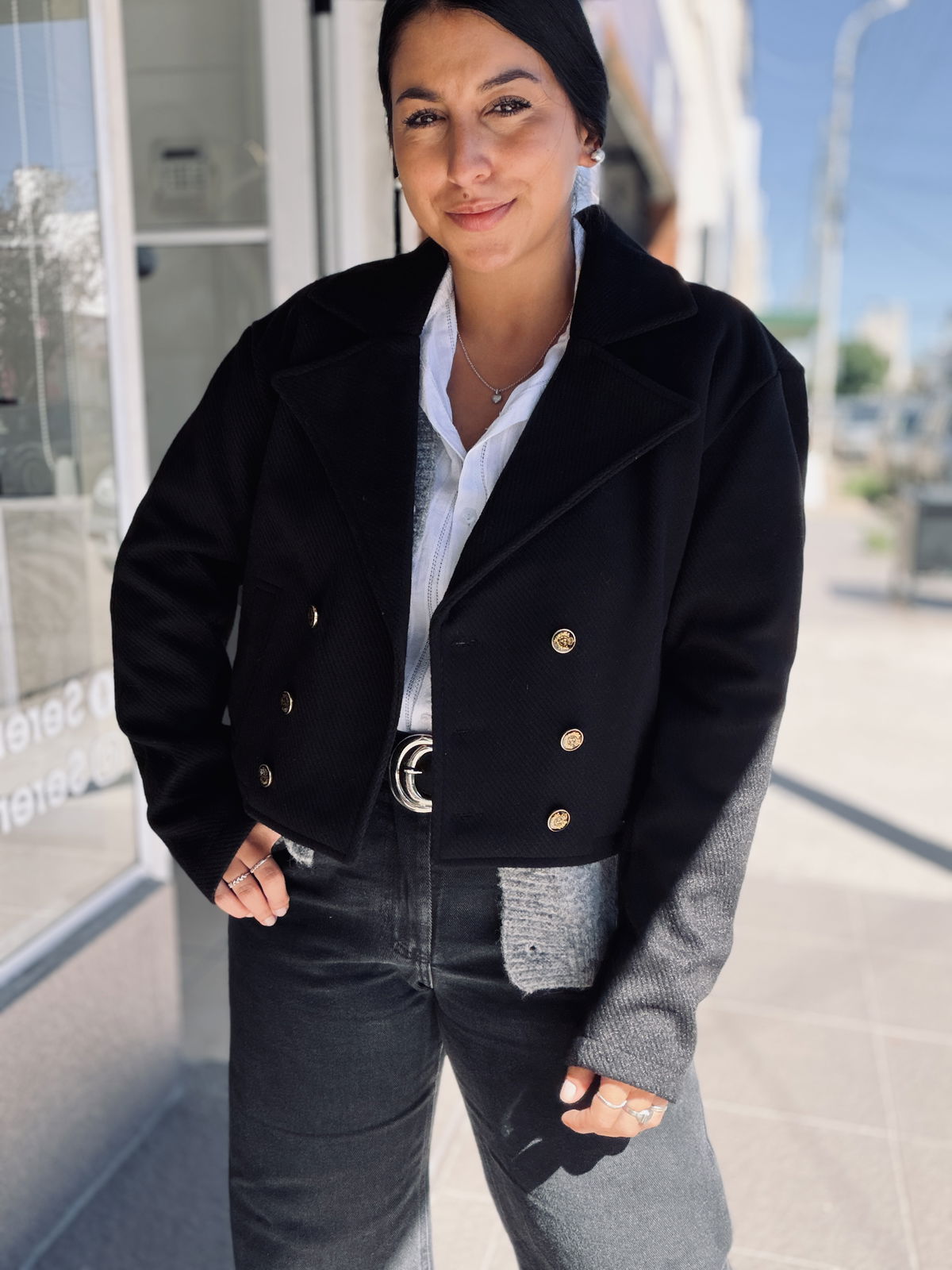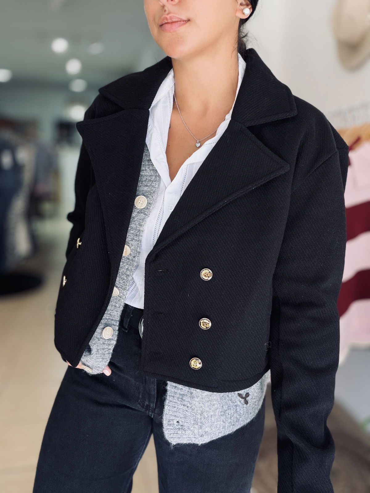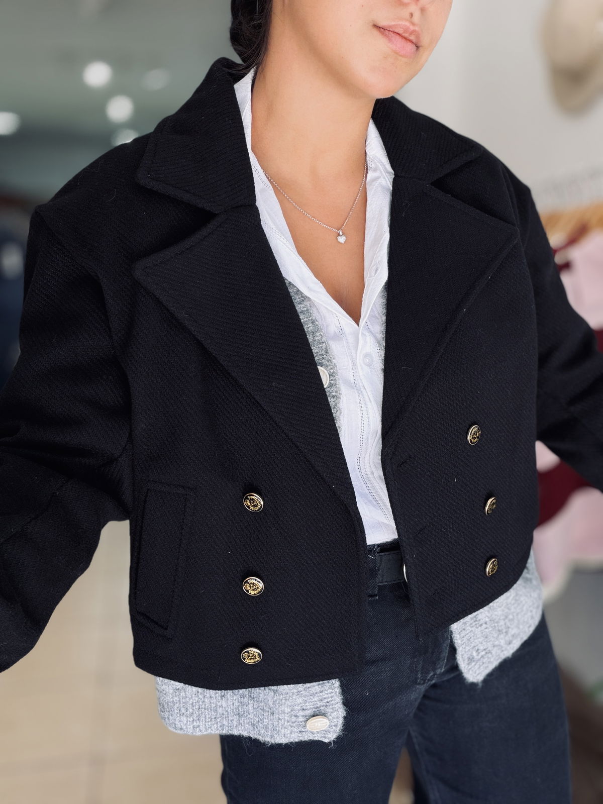 Chaqueta corta de diseño elegante y estructurado, confeccionada en tela con textura. Con solapa amplia y cierre frontal con botones metálicos dorados que aportan un detalle sofisticado. Su corte cropped realza la silueta y la convierte en una prenda versátil para combinar tanto con looks formales como casuales. Ideal para sumar estilo y personalidad a cualquier outfit.