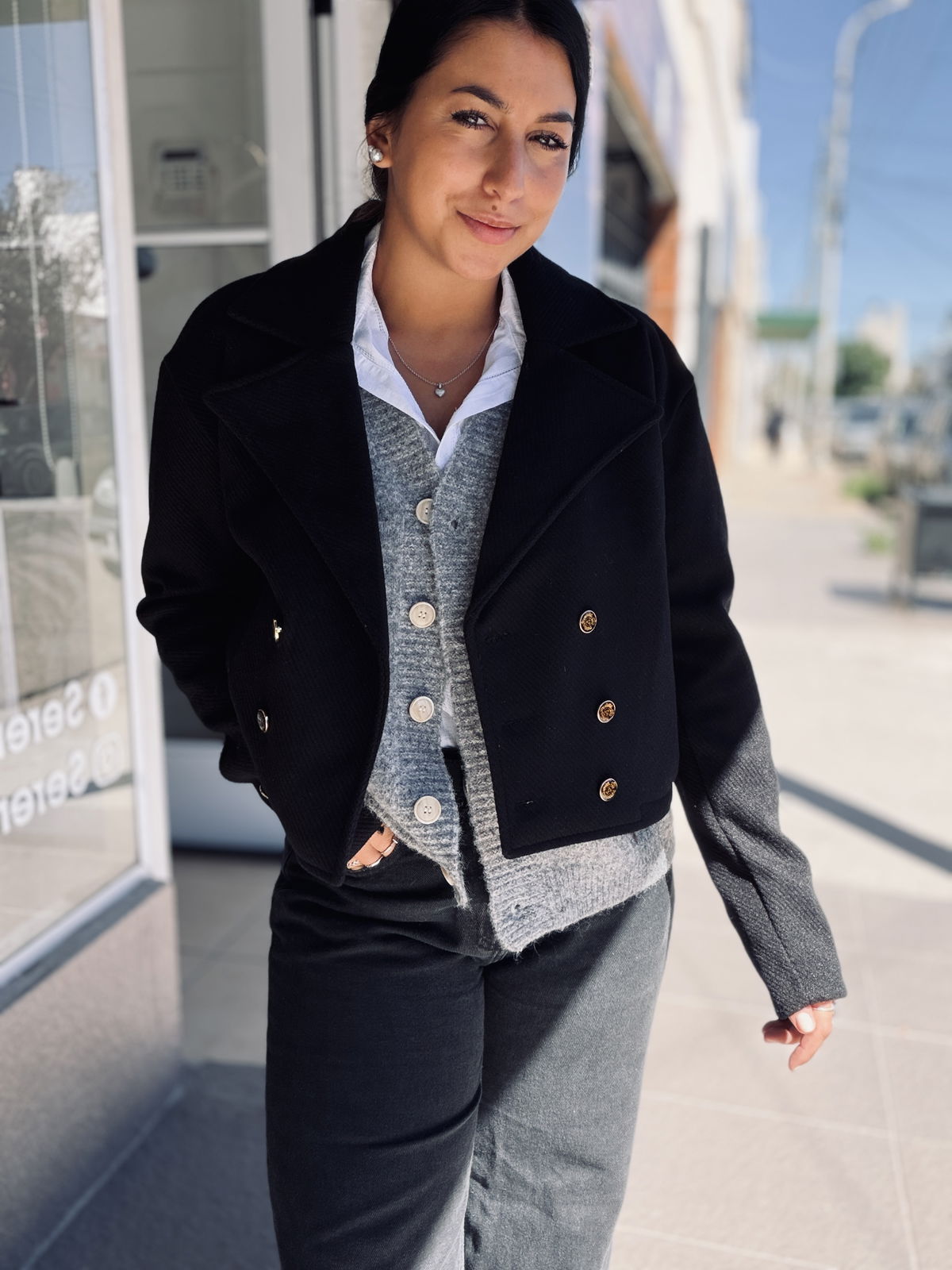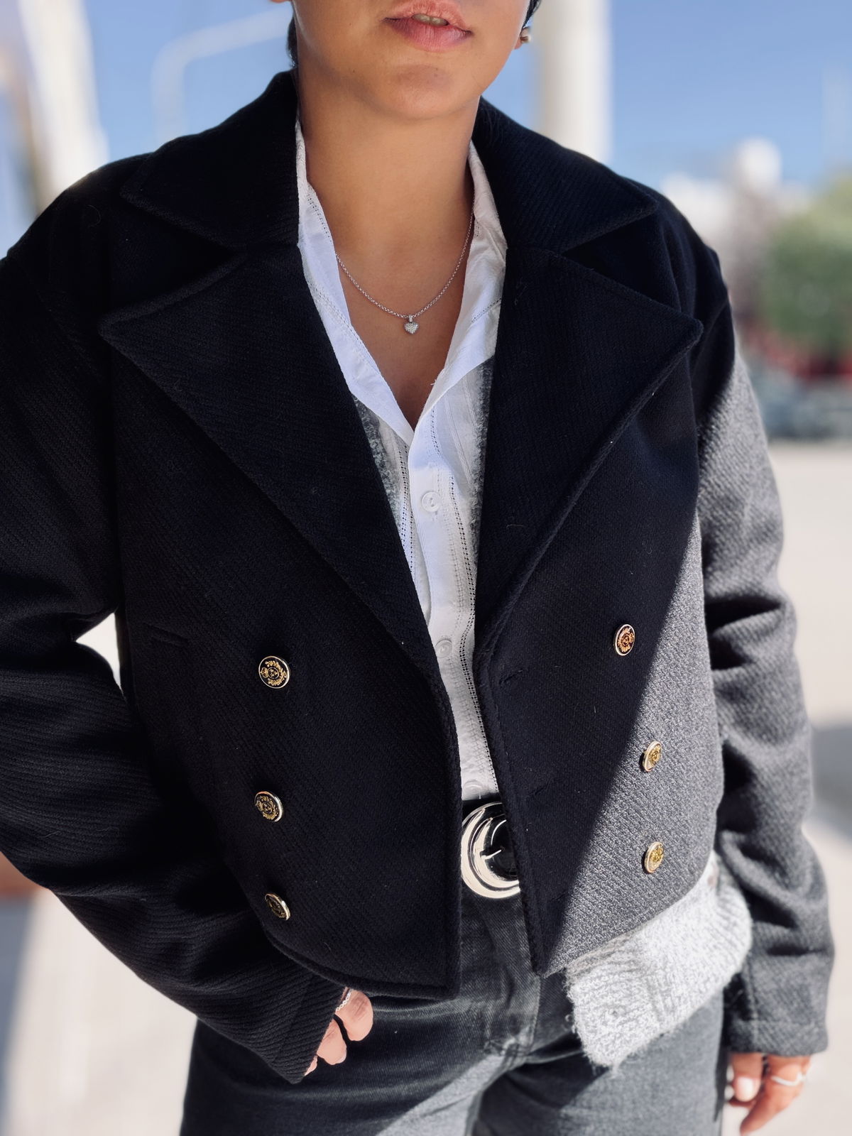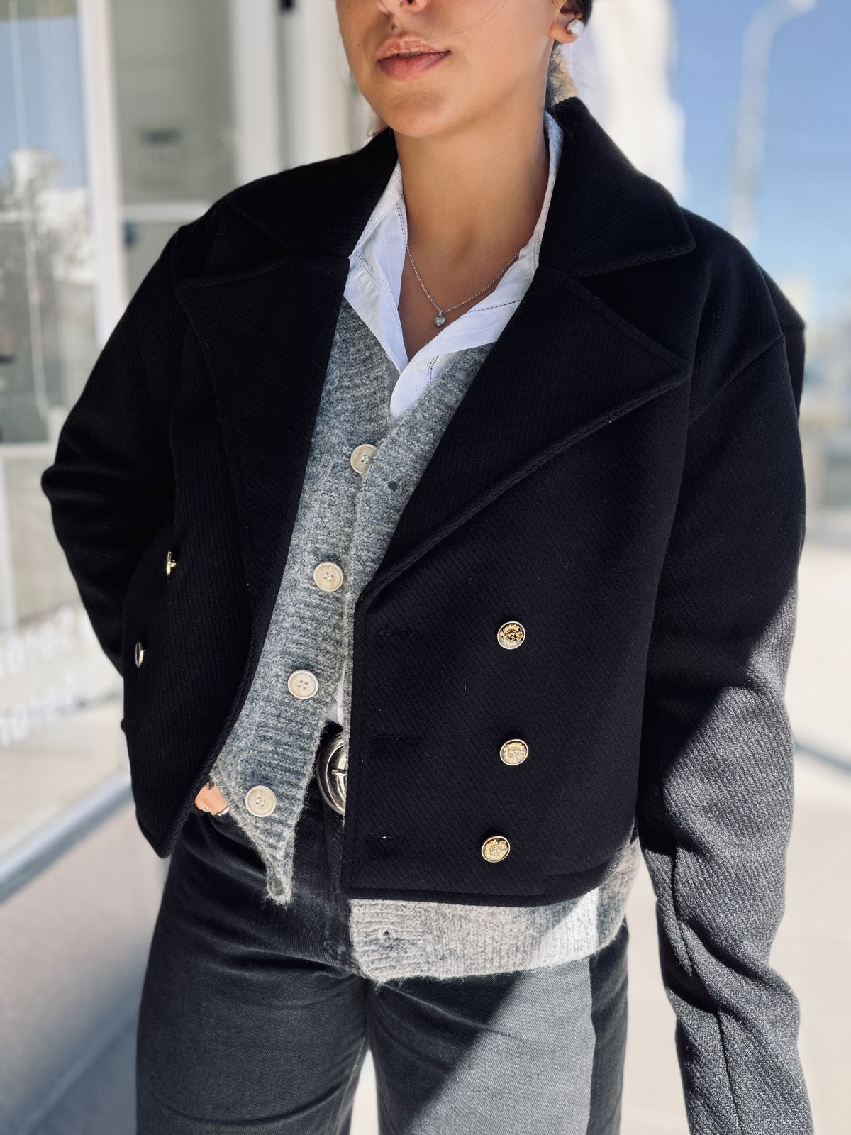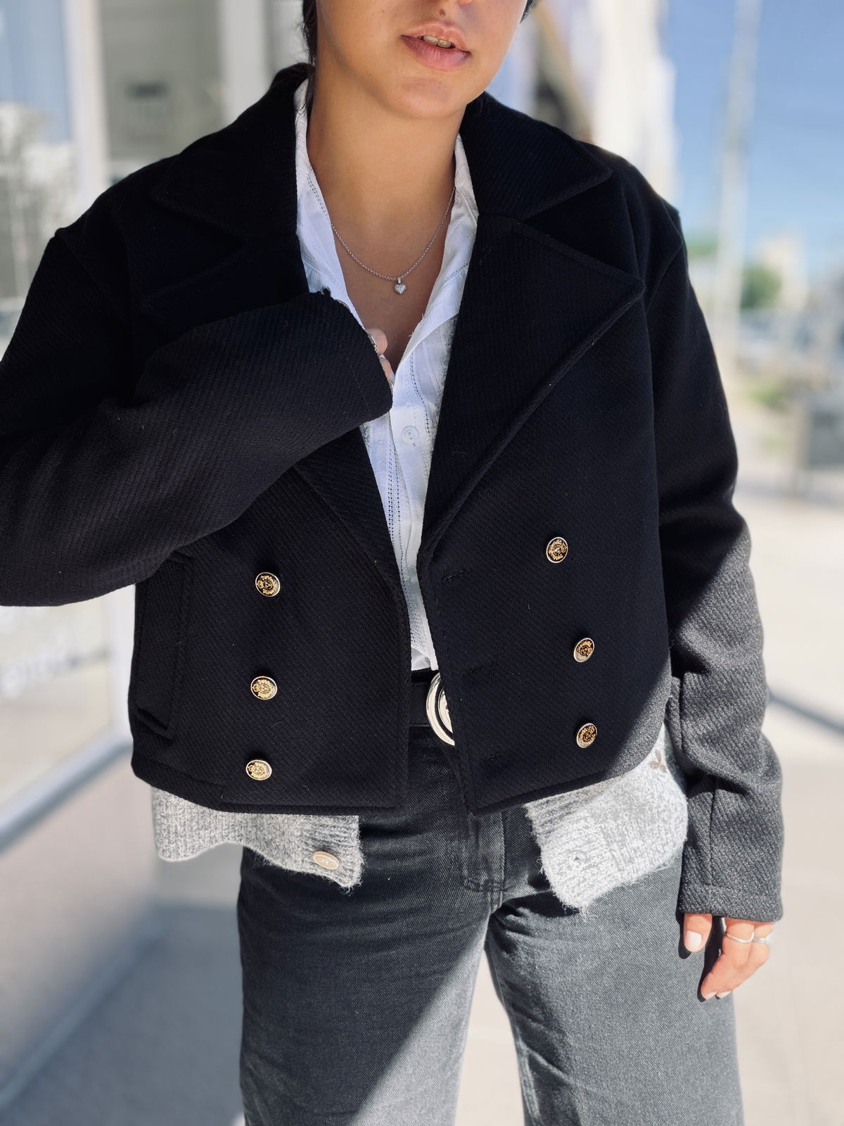 Chaqueta corta de diseño elegante y estructurado, confeccionada en tela con textura. Con solapa amplia y cierre frontal con botones metálicos dorados que aportan un detalle sofisticado. Su corte cropped realza la silueta y la convierte en una prenda versátil para combinar tanto con looks formales como casuales. Ideal para sumar estilo y personalidad a cualquier outfit.