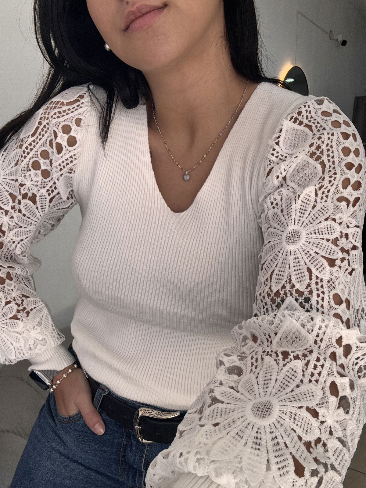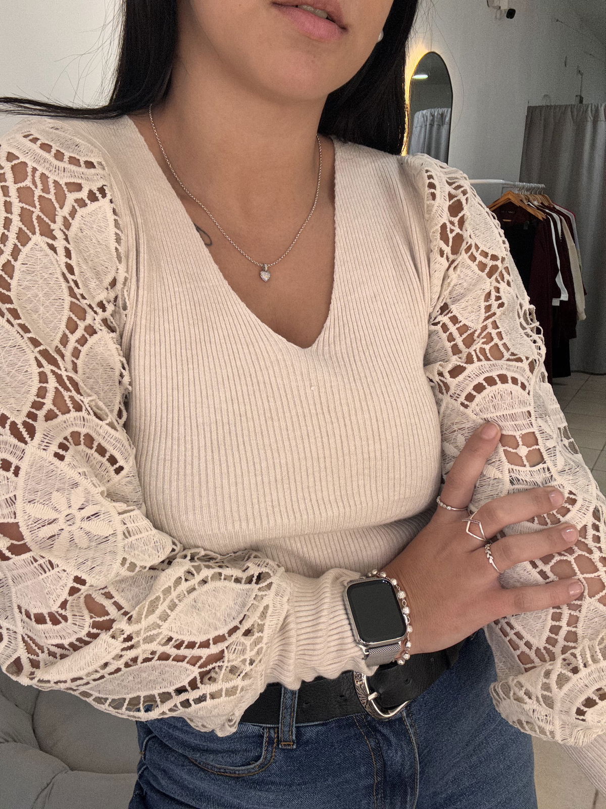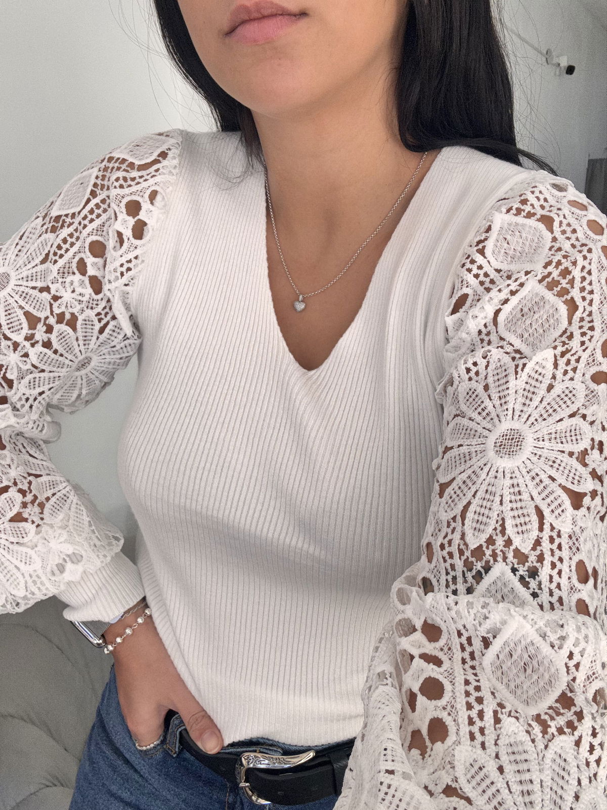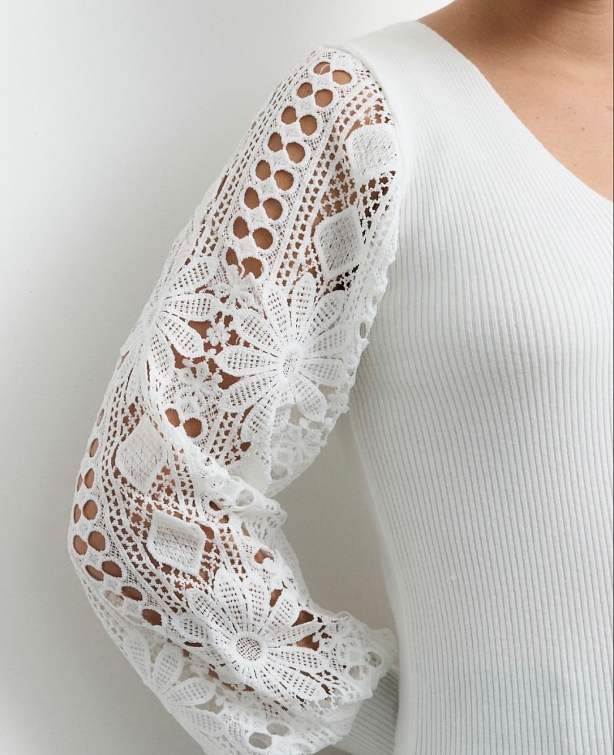 Sweater de bremer con broderie en manga. Tiene mucho spandex y abarca aproximadamente hasta un talle 4, es un sweater super delicado, liviano, muy canchero para una salida o un evento