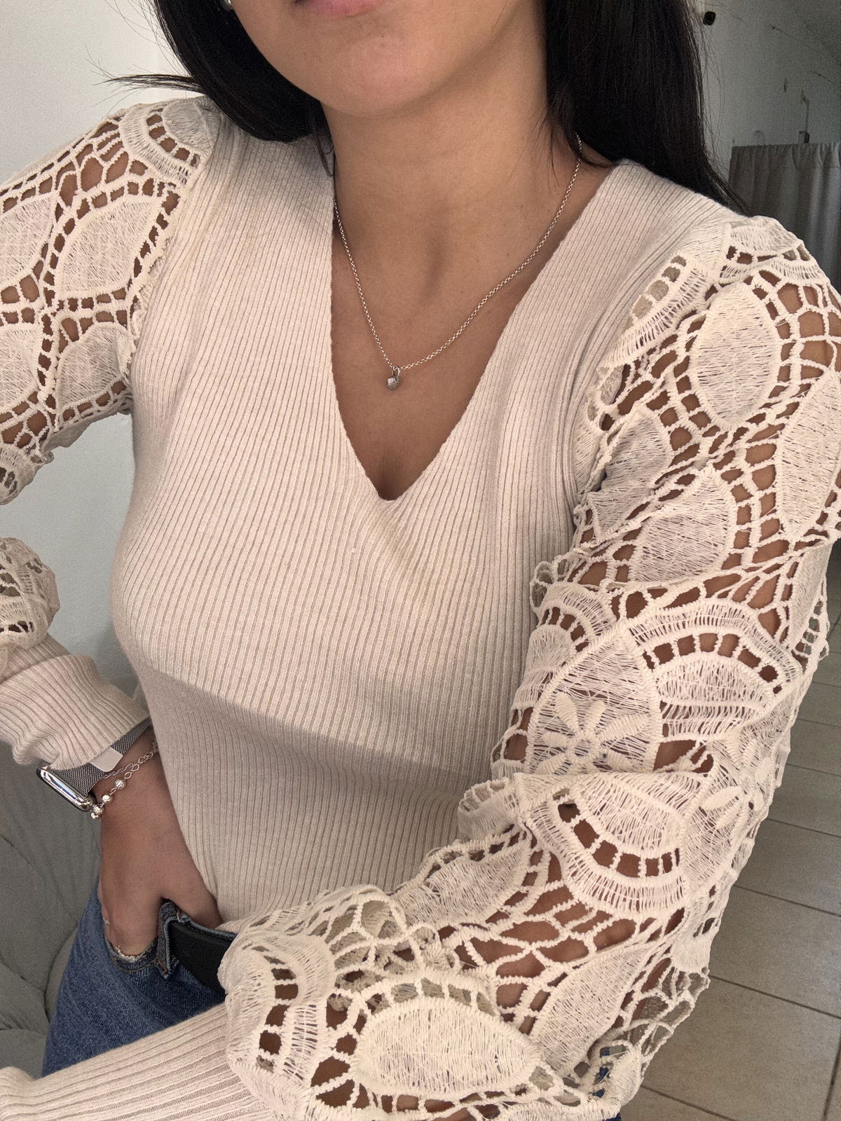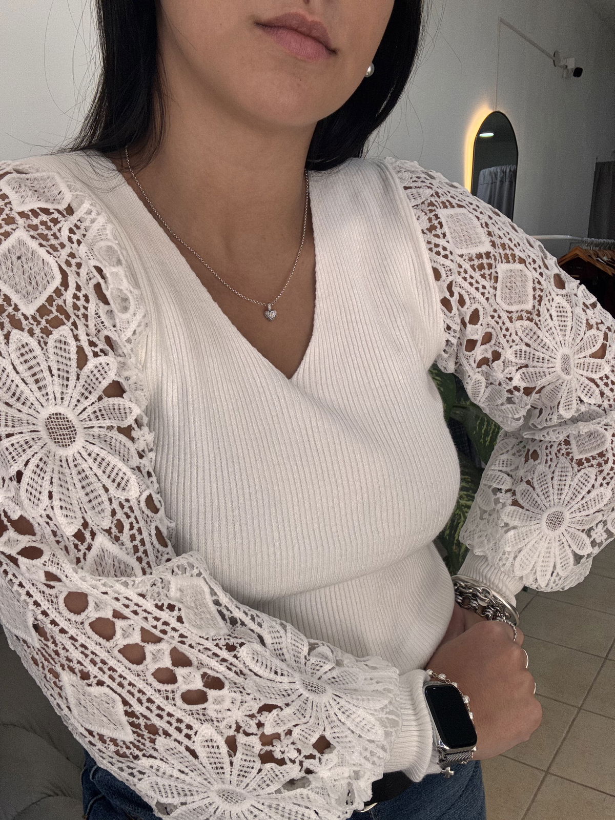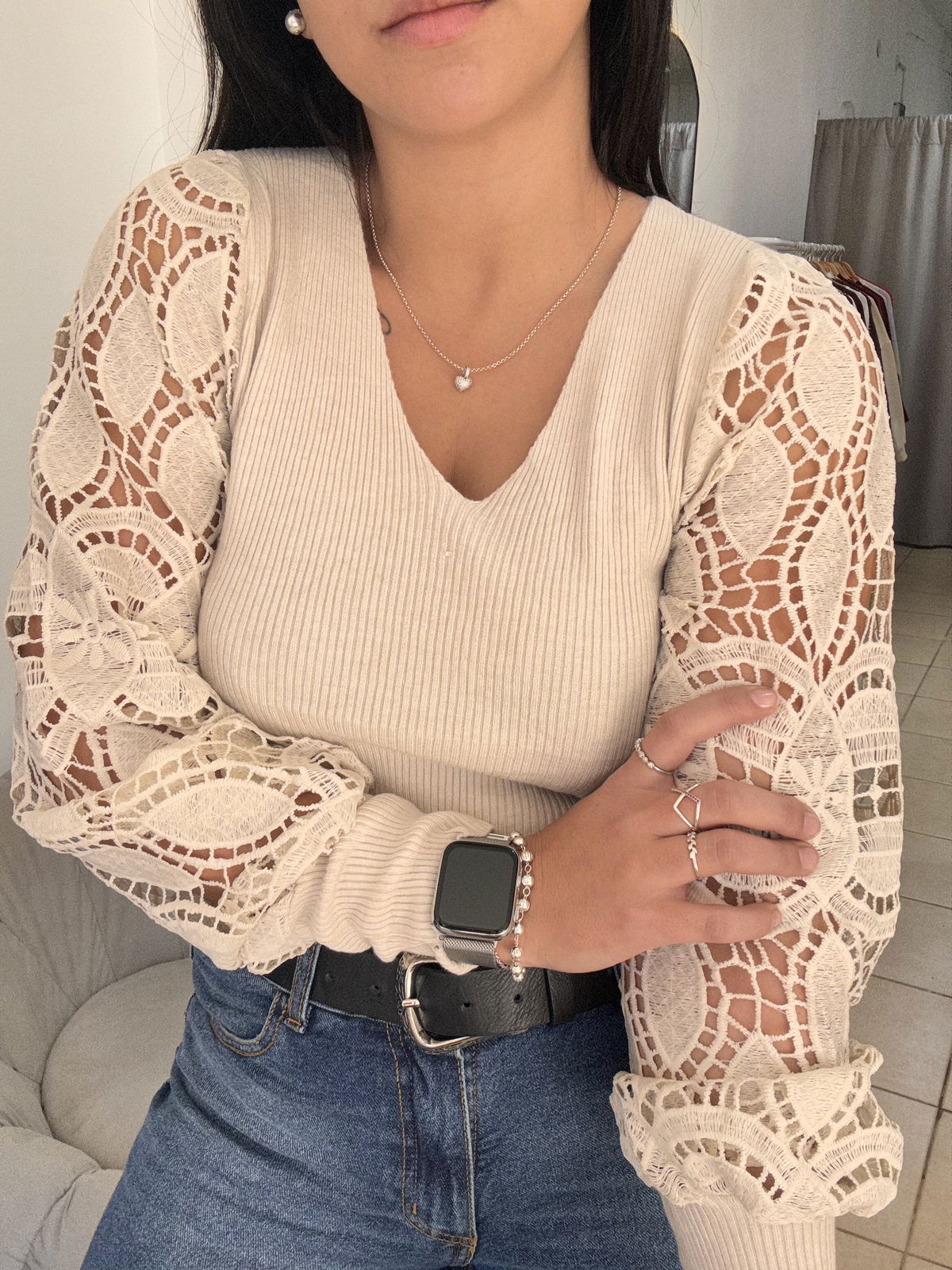 Sweater de bremer con broderie en manga. Tiene mucho spandex y abarca aproximadamente hasta un talle 4, es un sweater super delicado, liviano, muy canchero para una salida o un evento