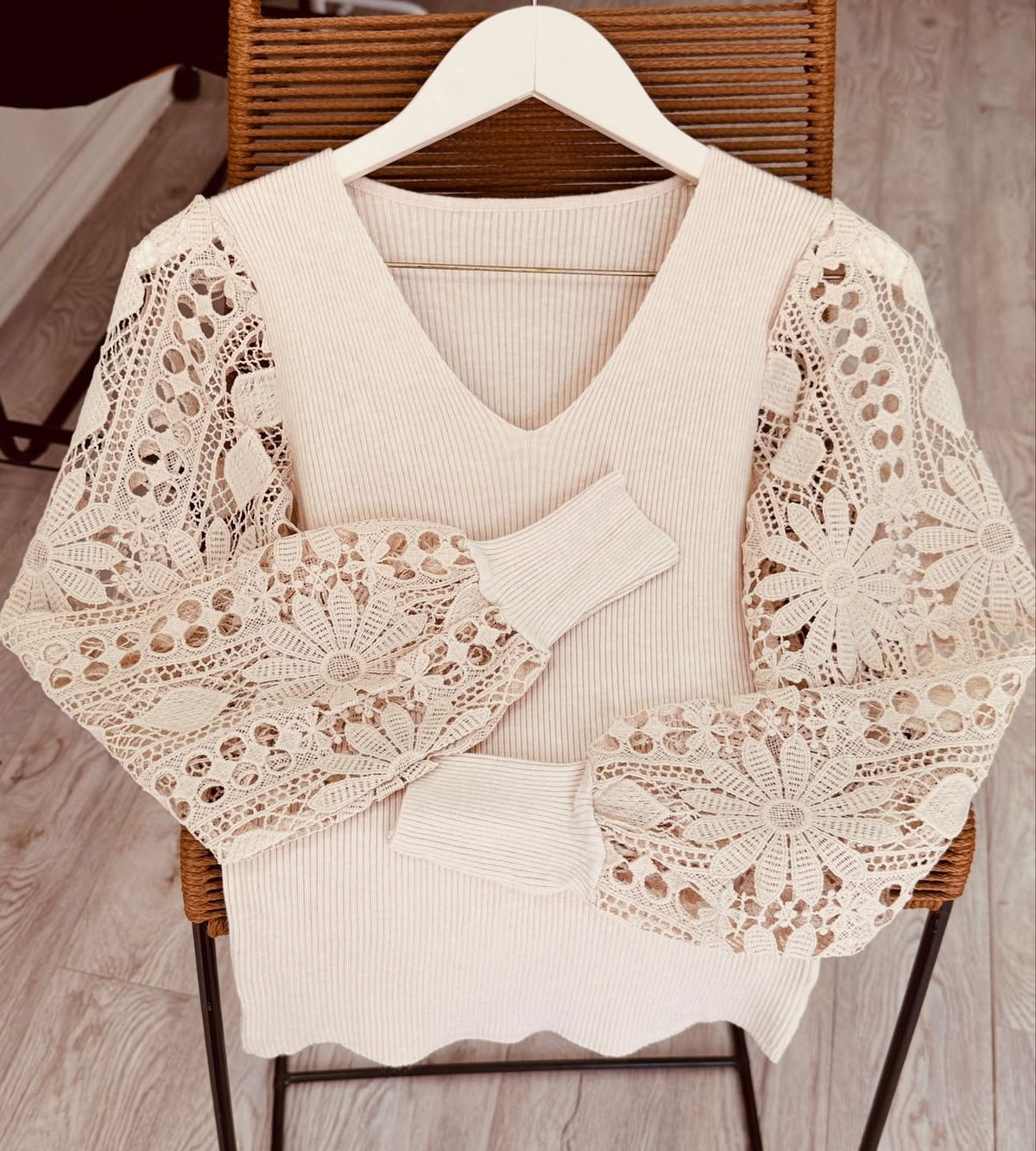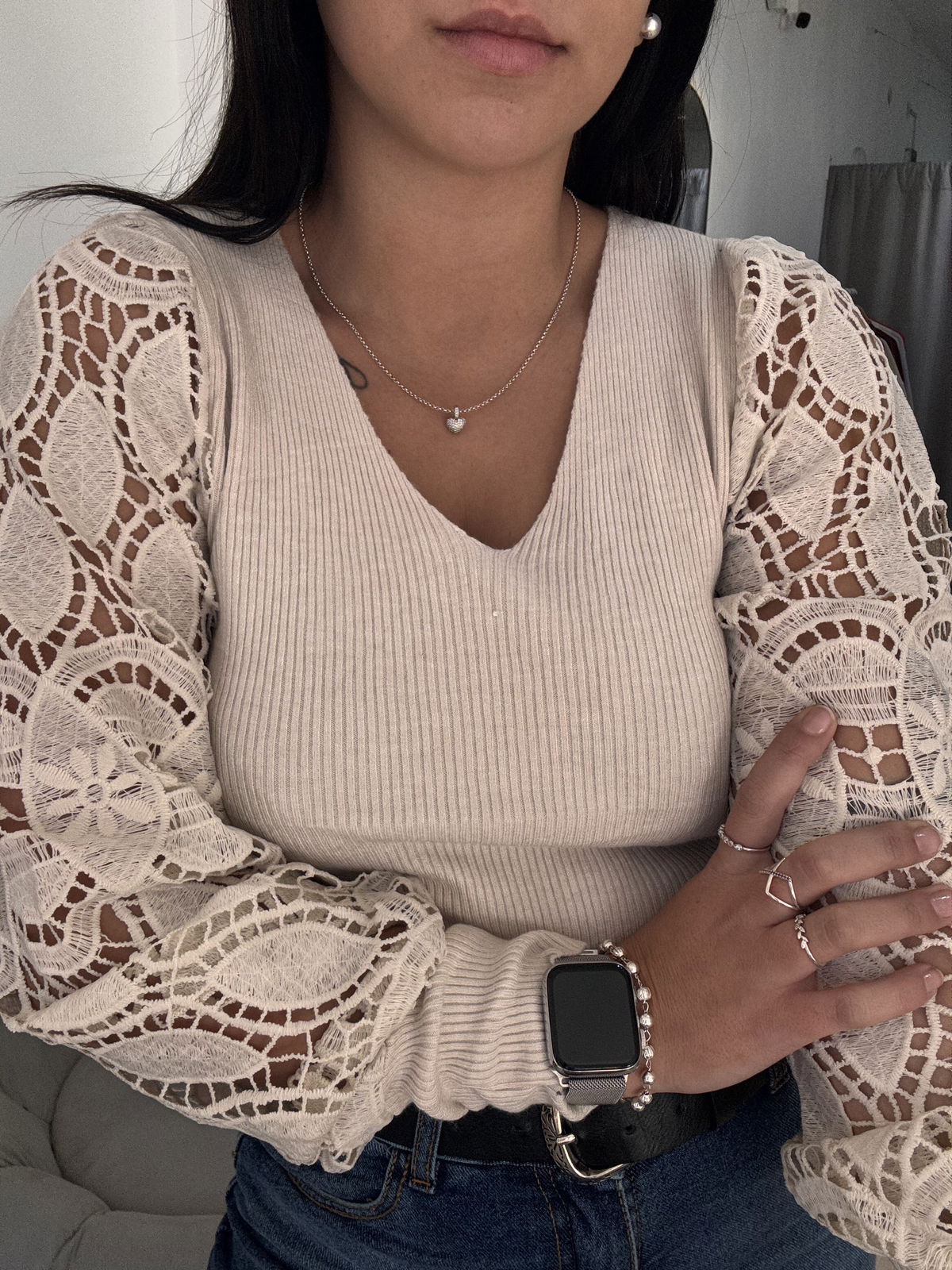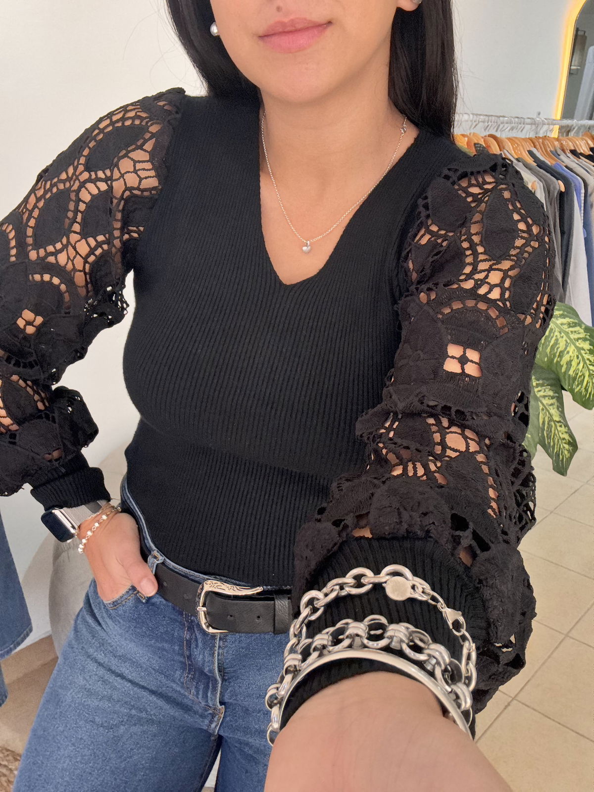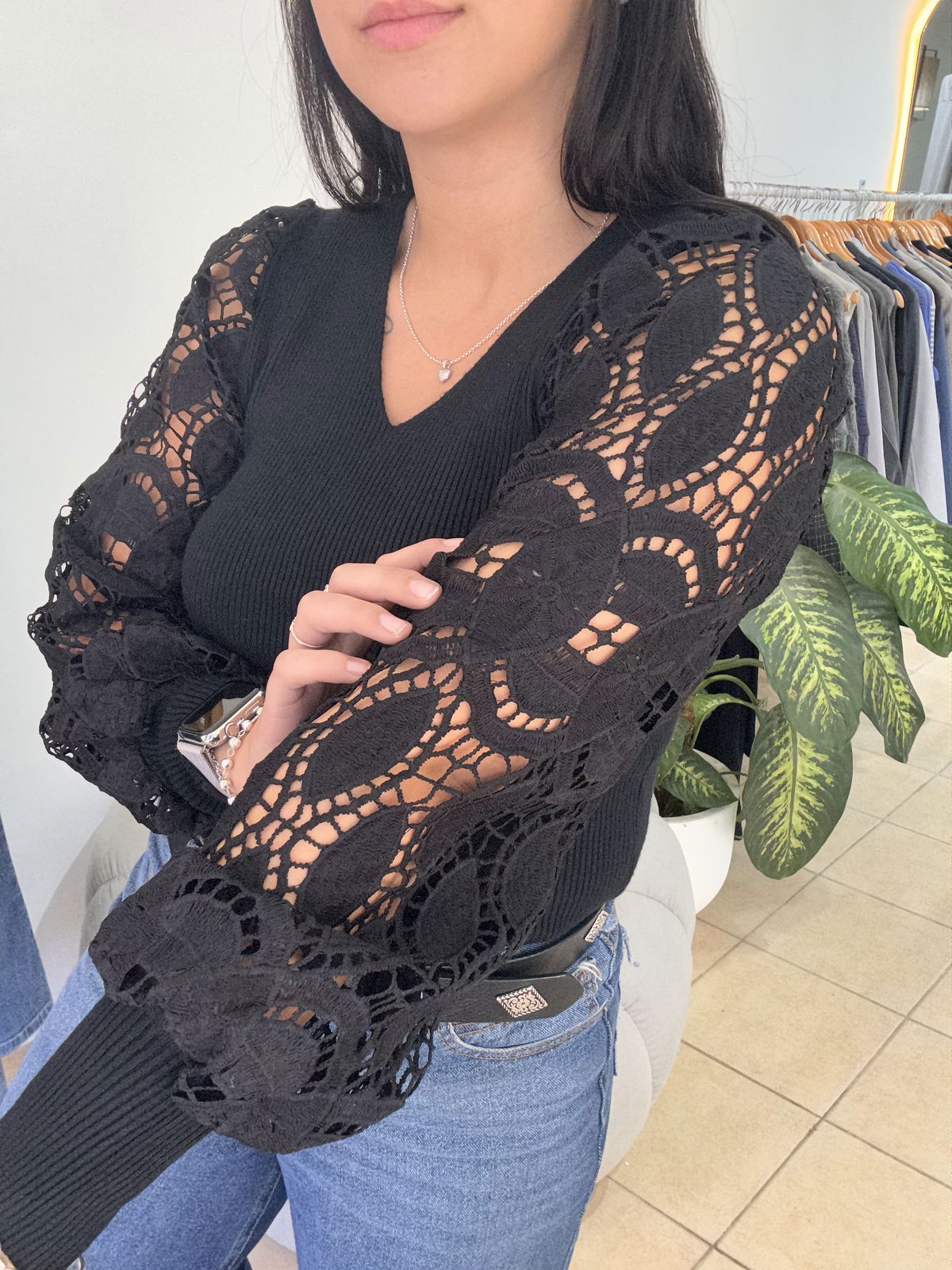Sweater de bremer con broderie en manga. Tiene mucho spandex y abarca aproximadamente hasta un talle 4, es un sweater super delicado, liviano, muy canchero para una salida o un evento