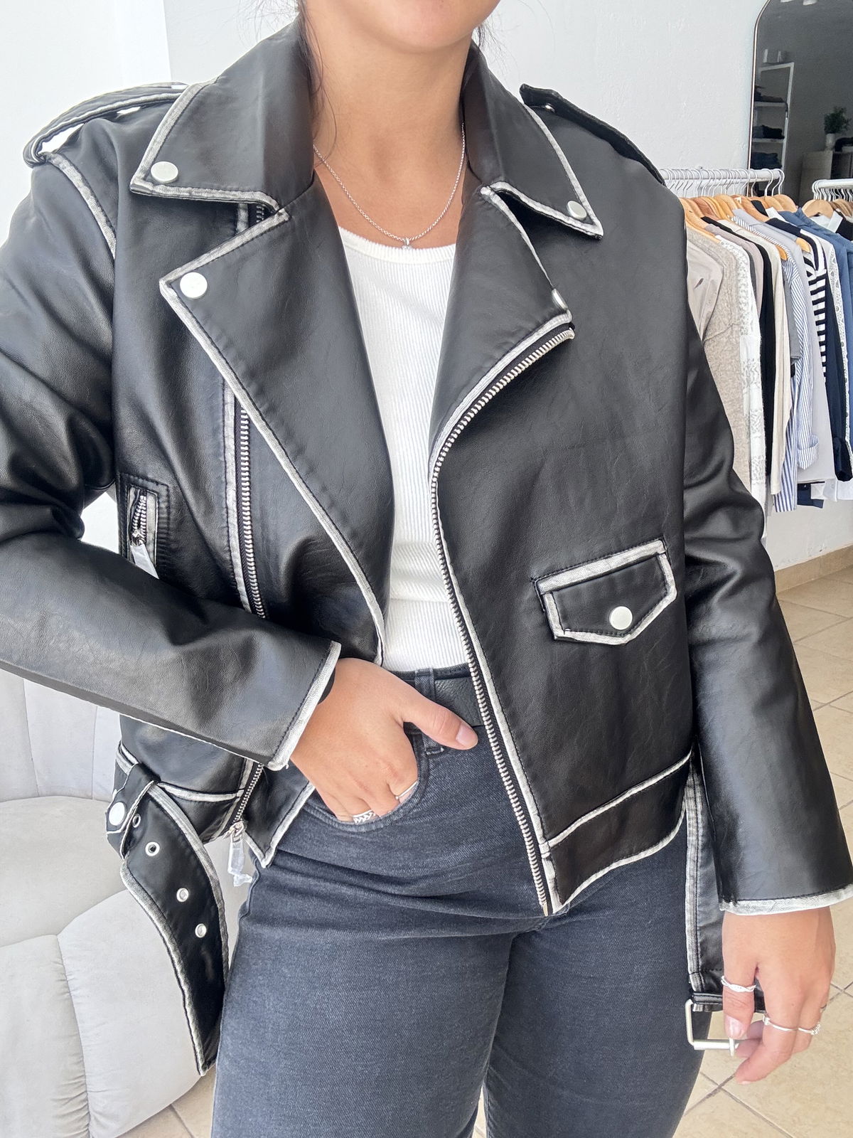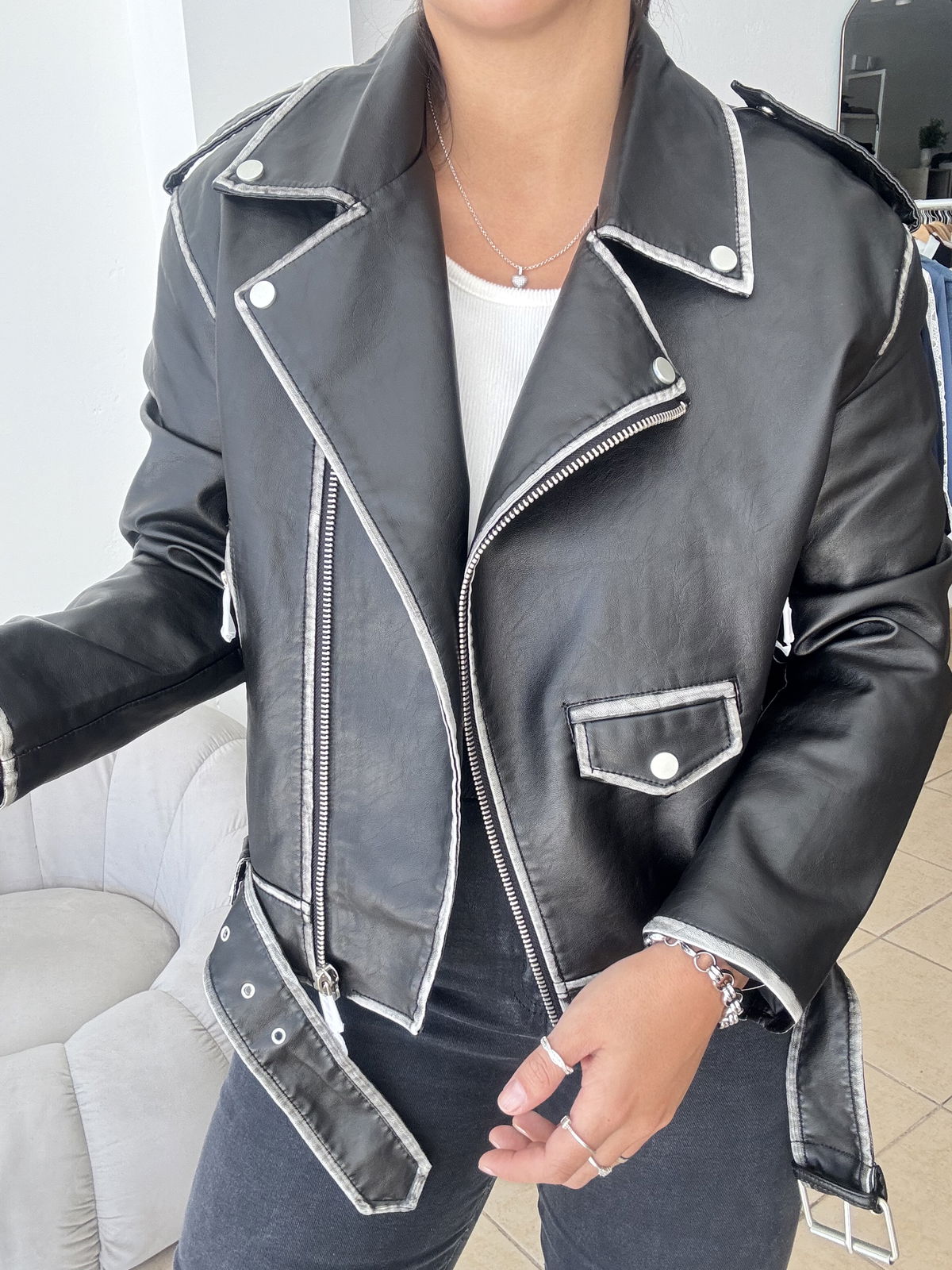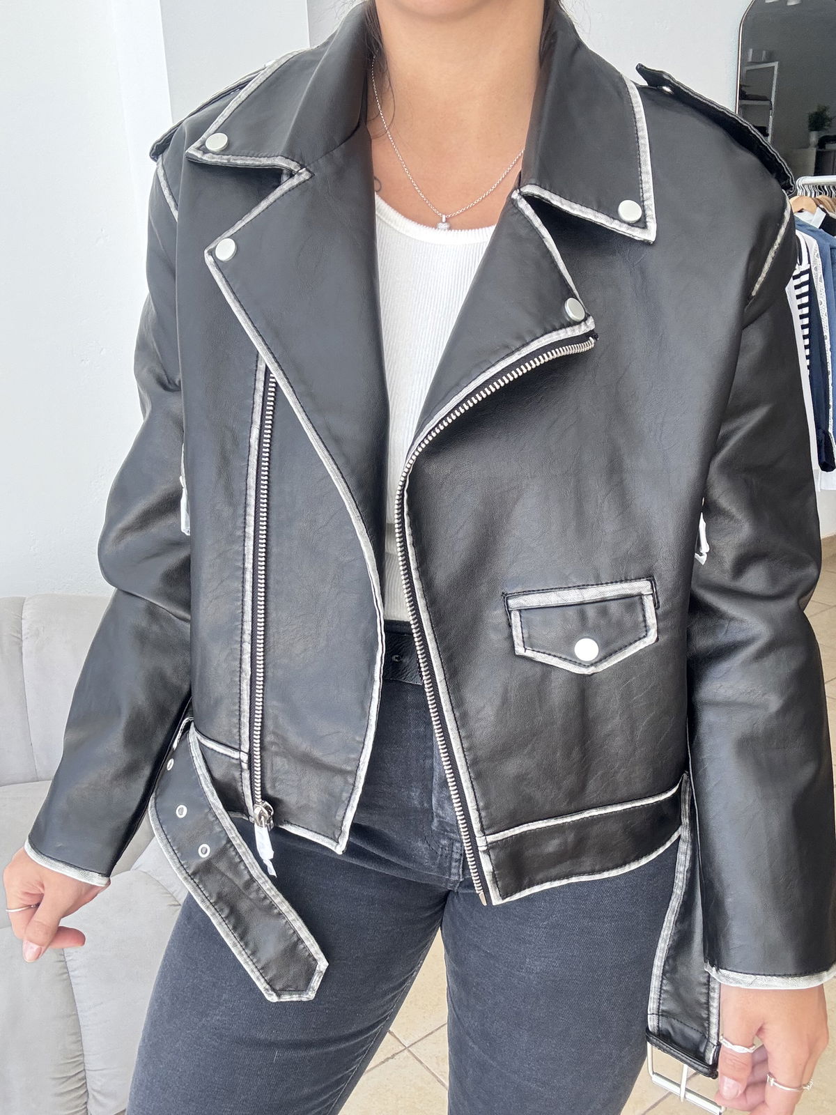 Campera eco cuero con detalle en gris, con cinto y forreria por dentro. La modelo tiene puesto talle 2