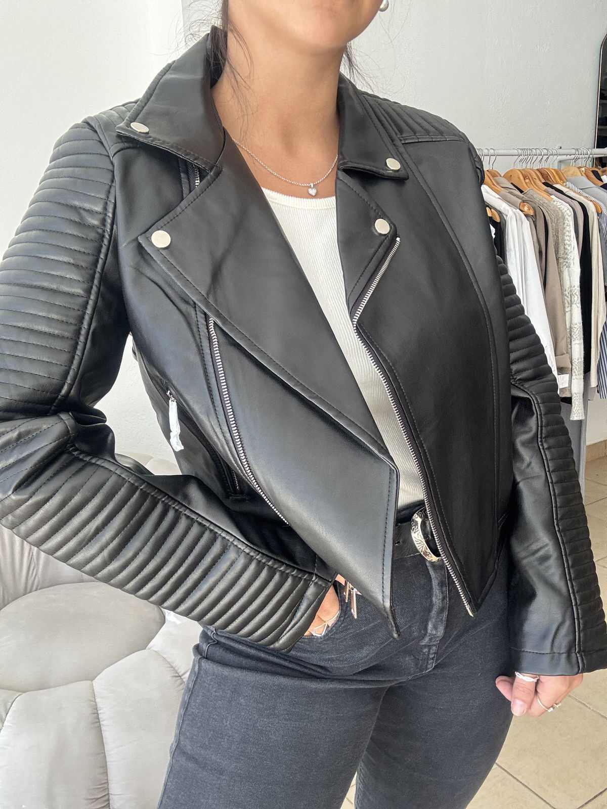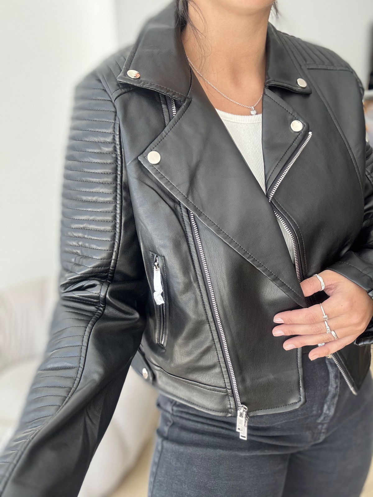 Campera eco cuero con detalle en brazos, 4 cierres.