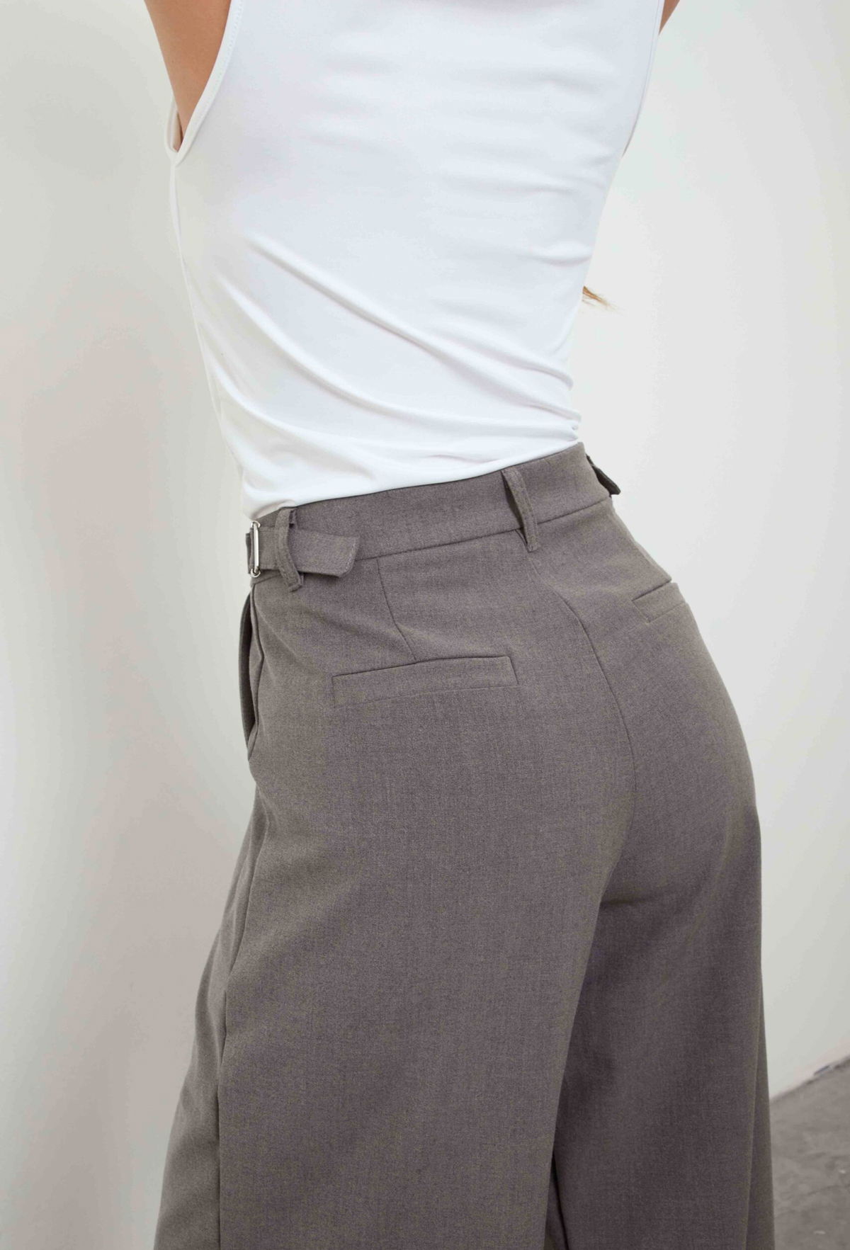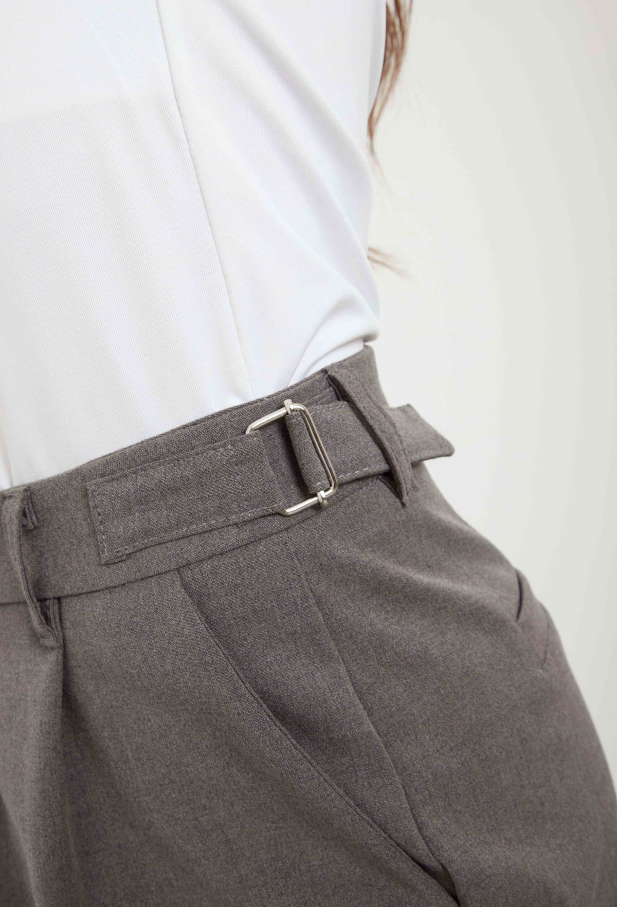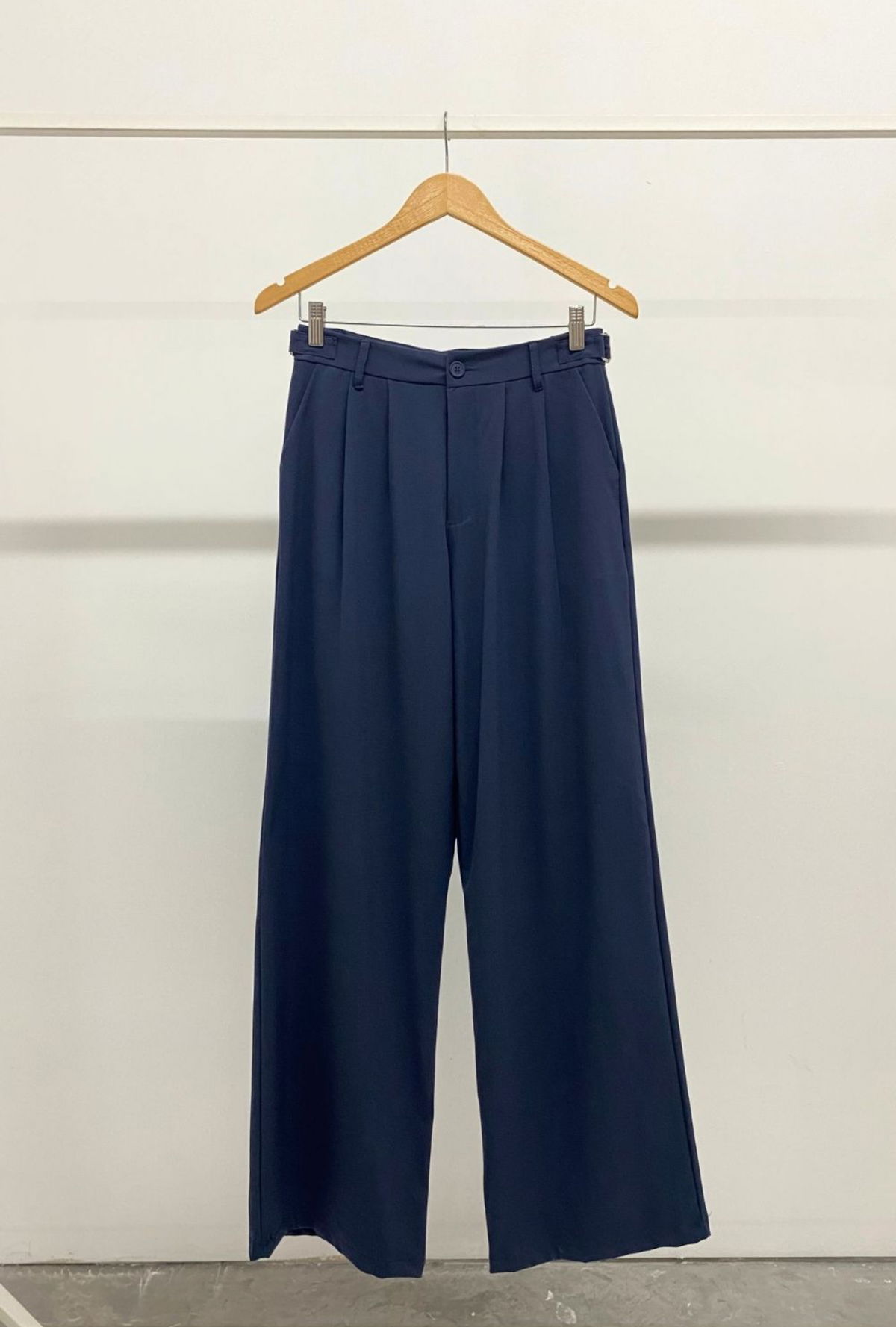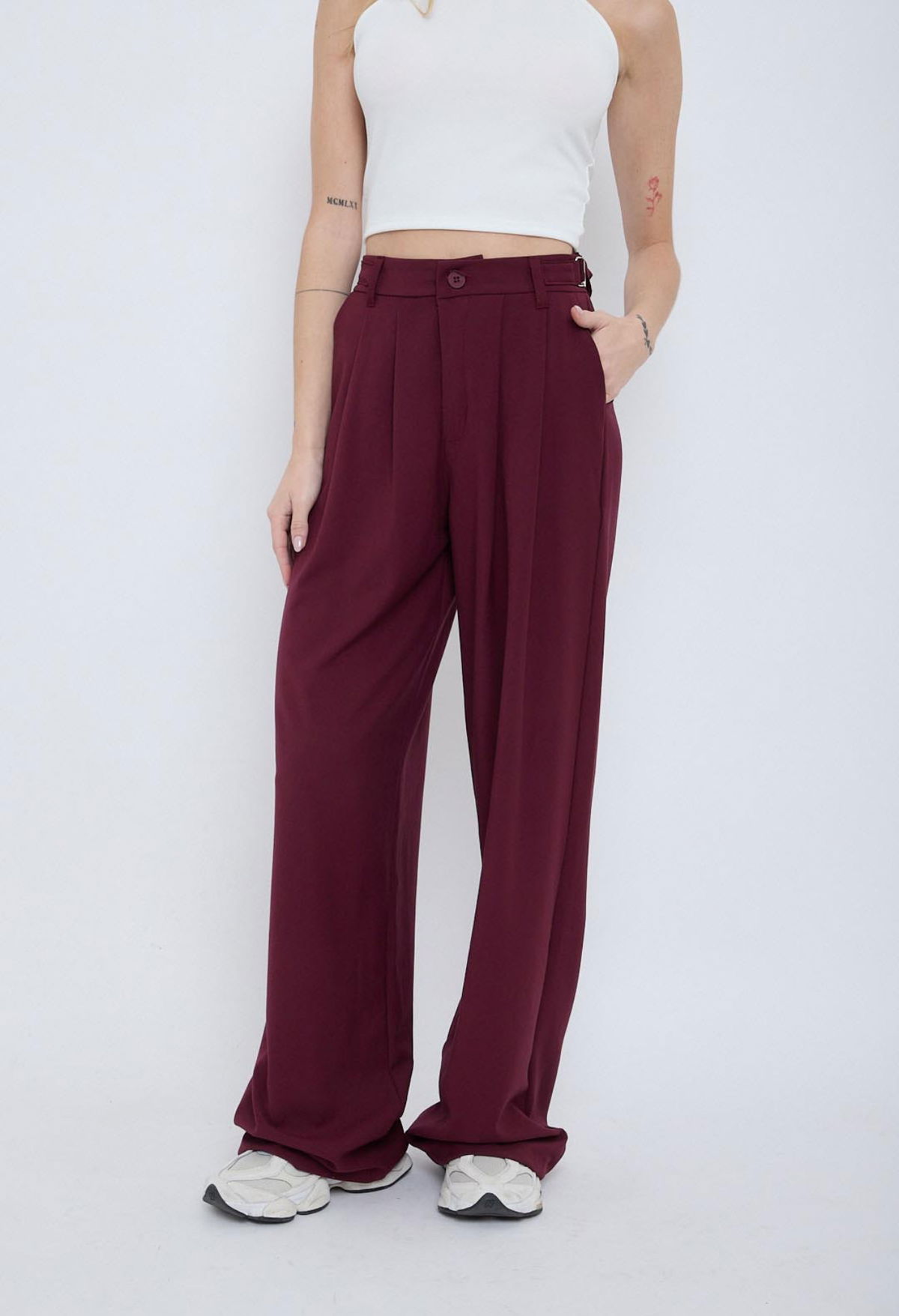 Pantalón sastrero wide leg, tiro alto. Con hebillas metálicas regulables a los costados, doble pinza.