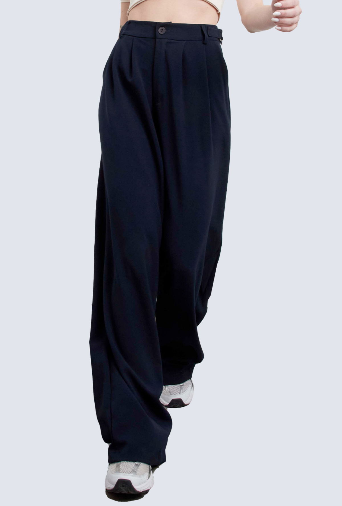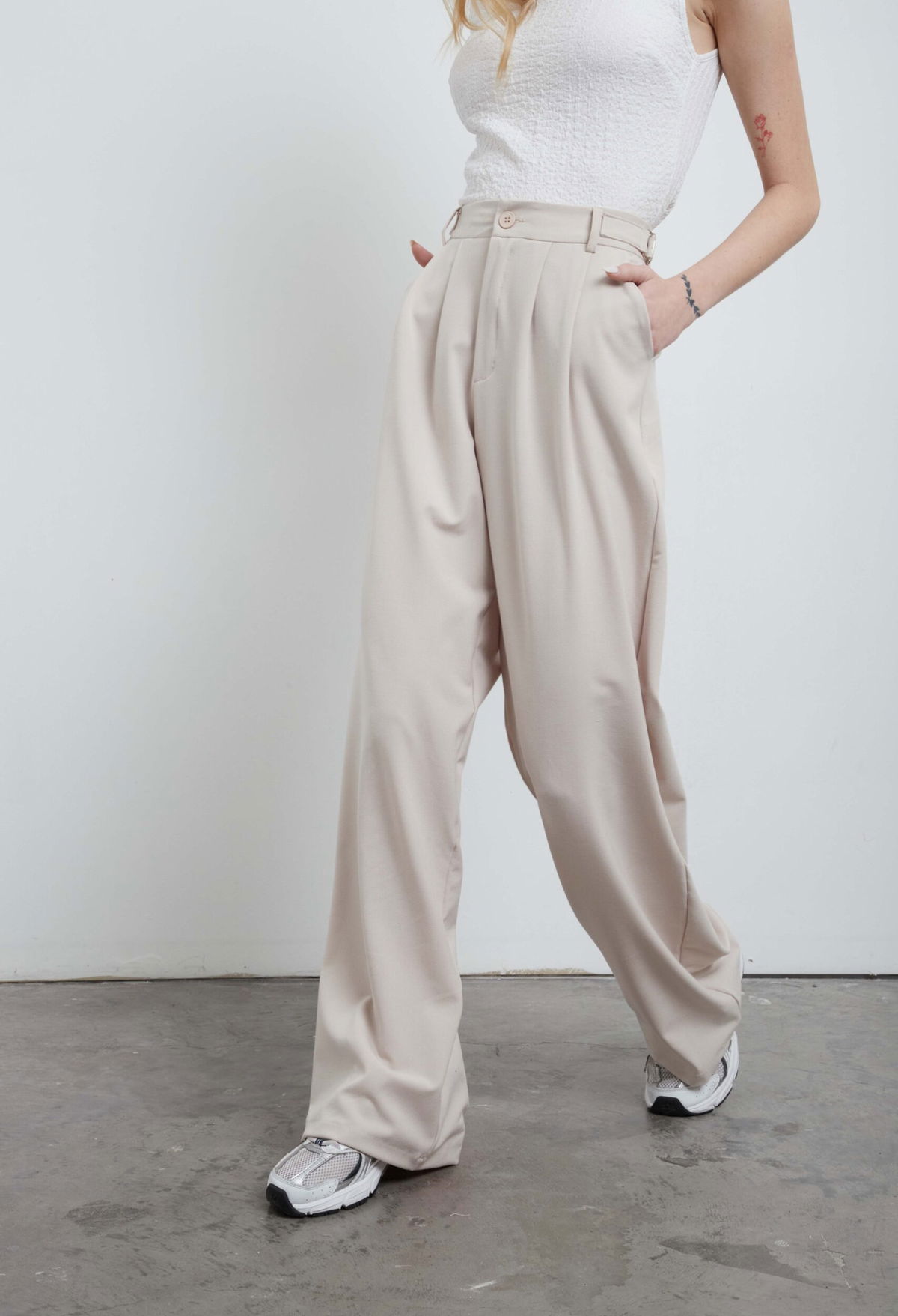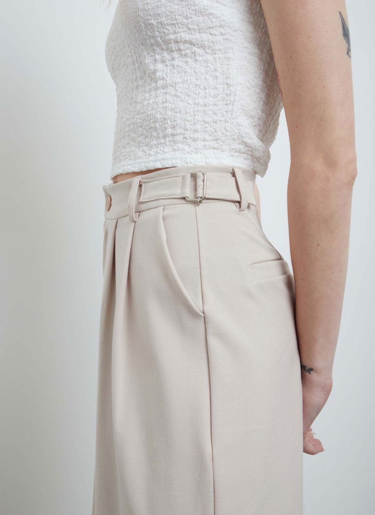Pantalón sastrero wide leg, tiro alto. Con hebillas metálicas regulables a los costados, doble pinza.