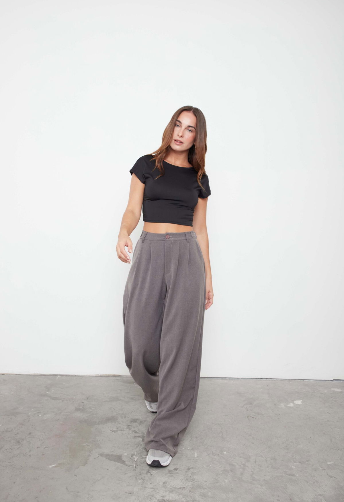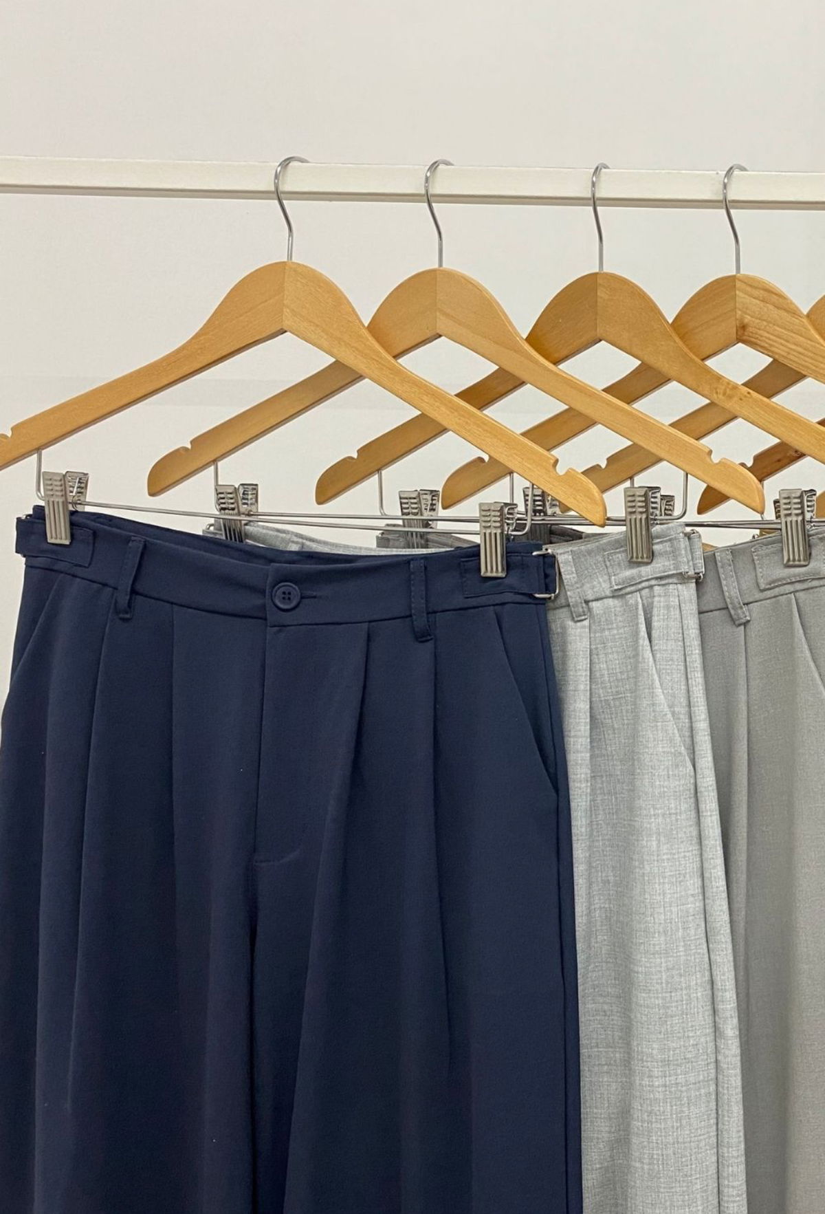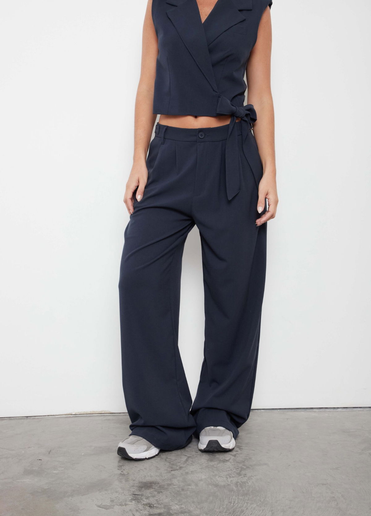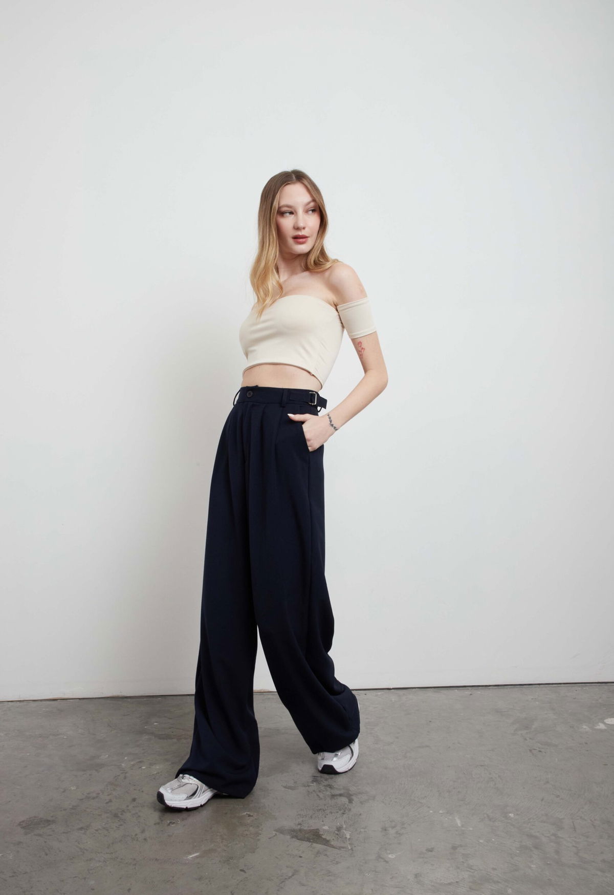 Pantalón sastrero wide leg, tiro alto. Con hebillas metálicas regulables a los costados, doble pinza.