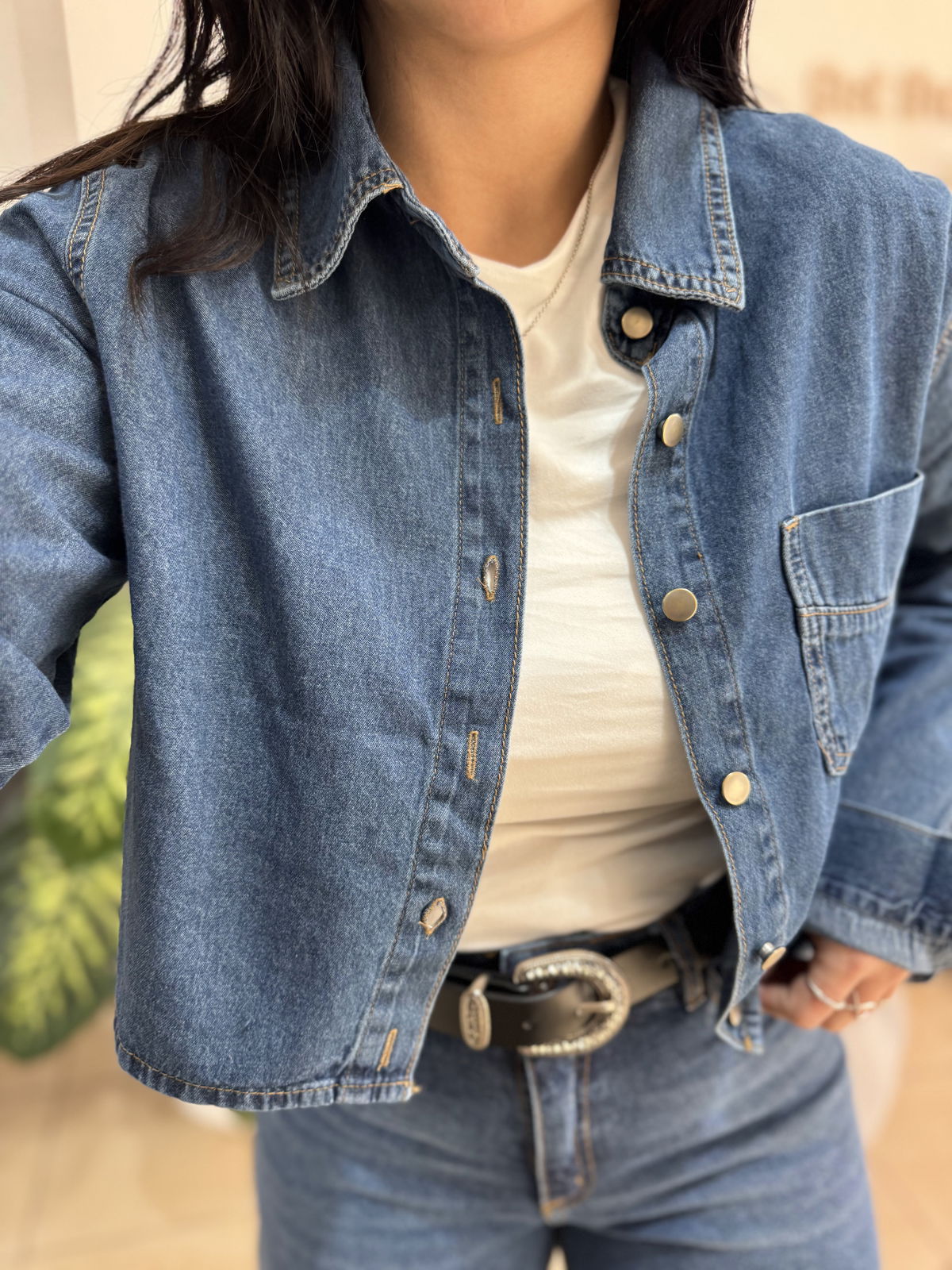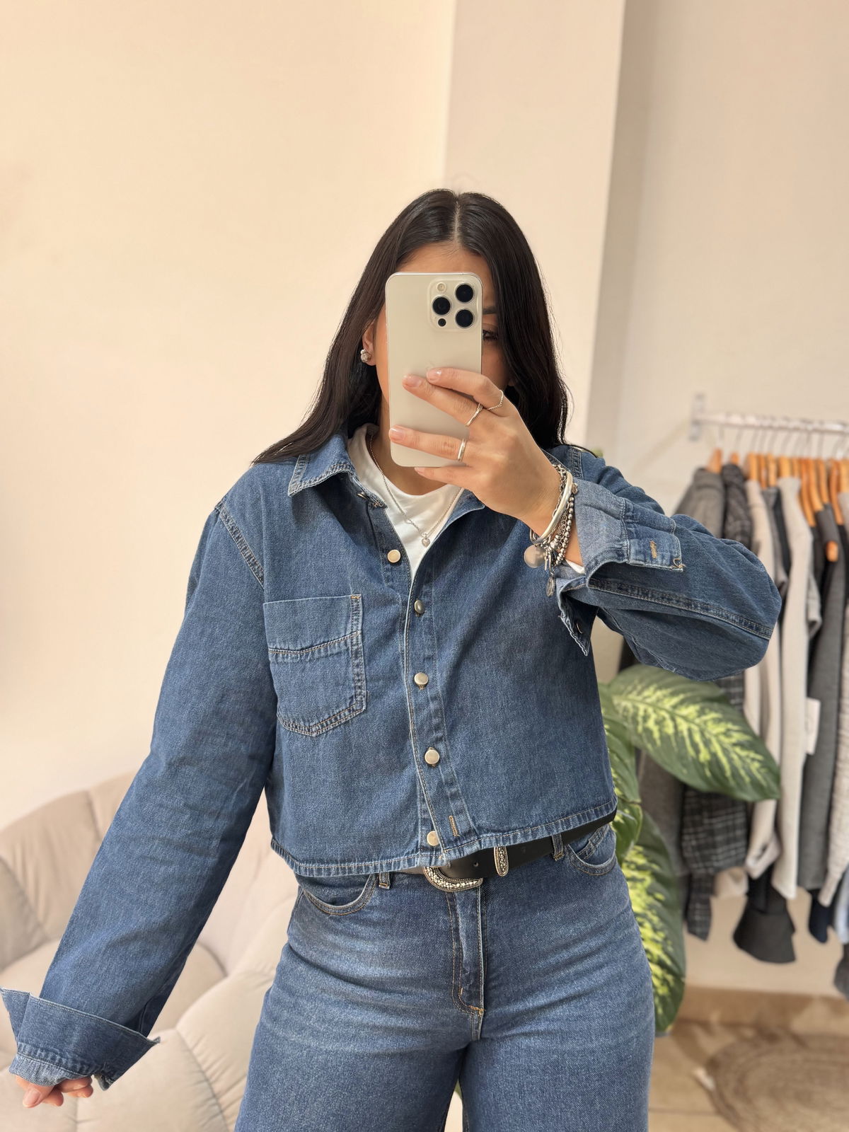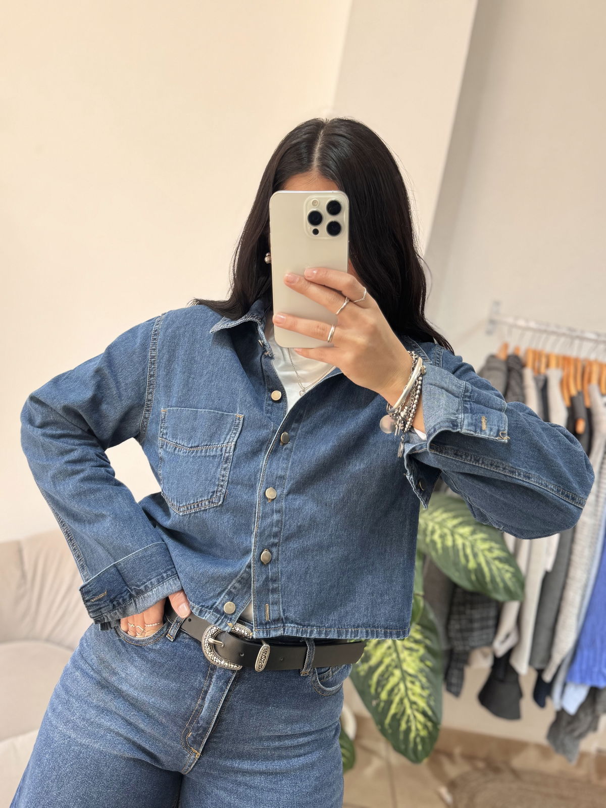Camisa denim corta, calidad hiper premium. Talle amplio, Lau está usando el talle M