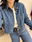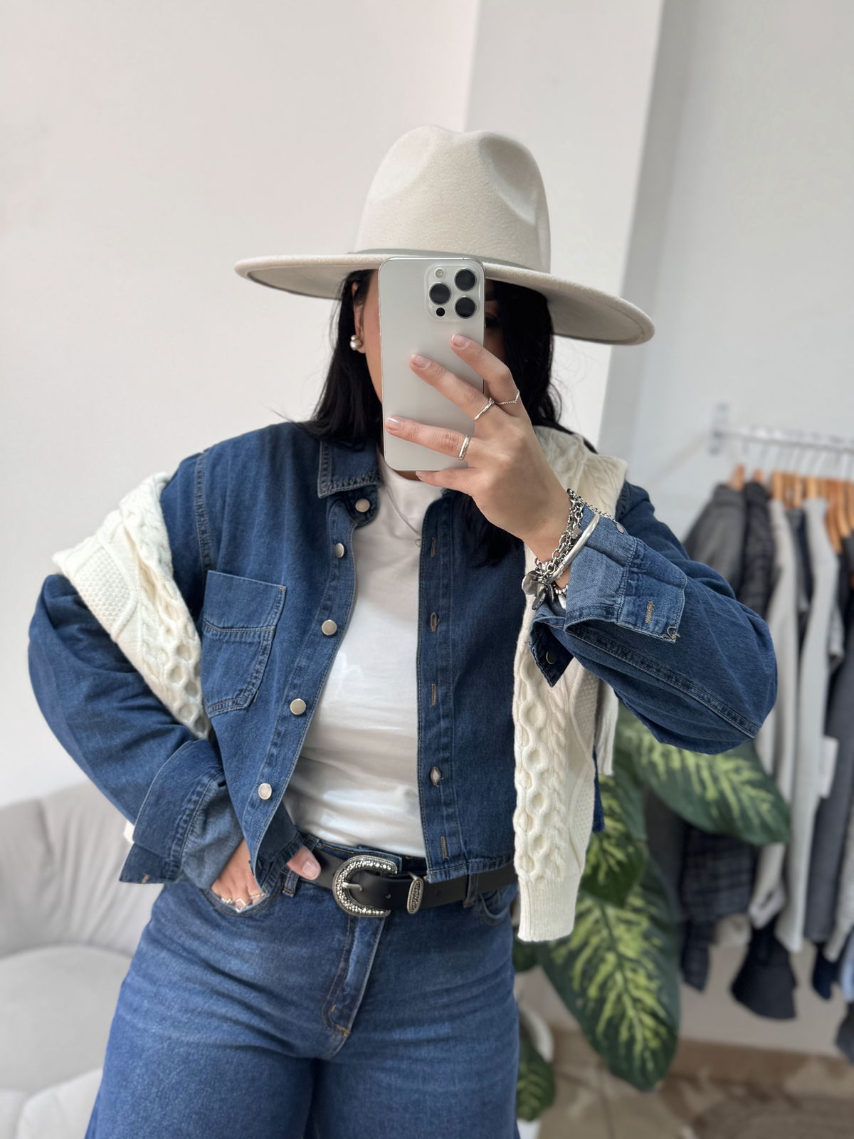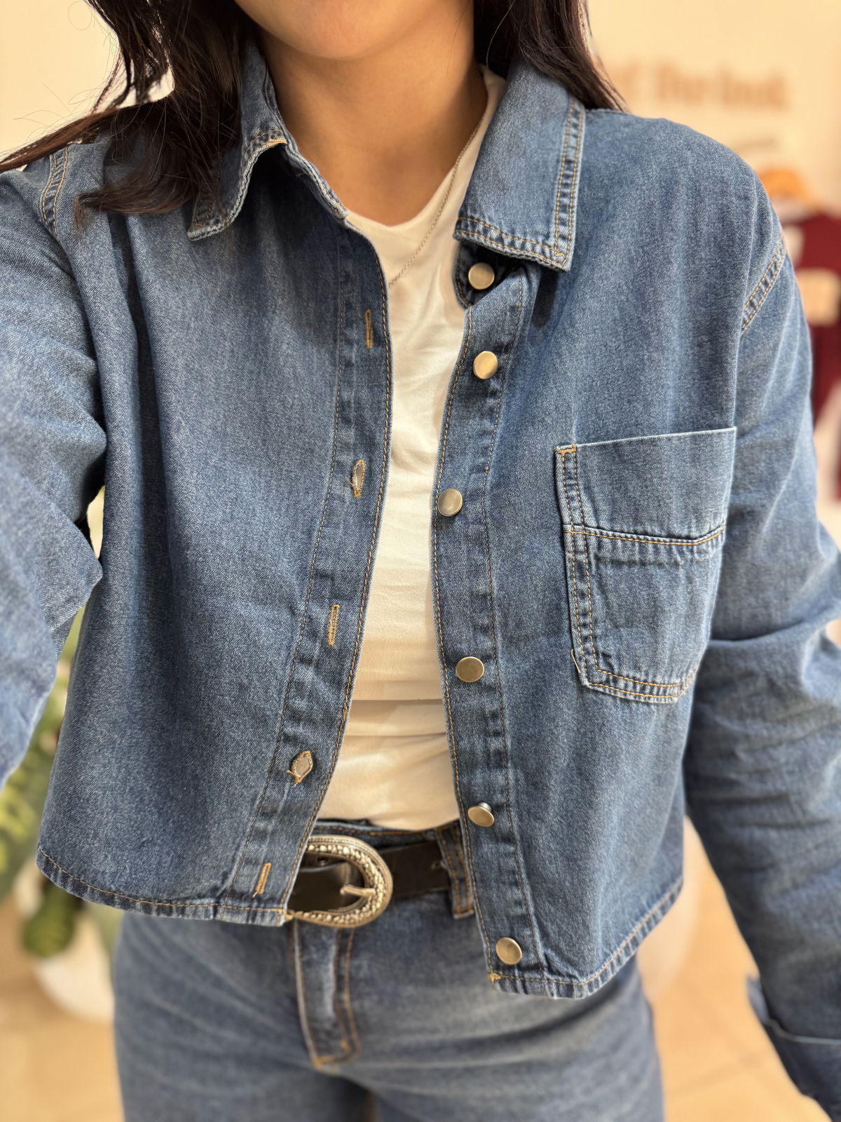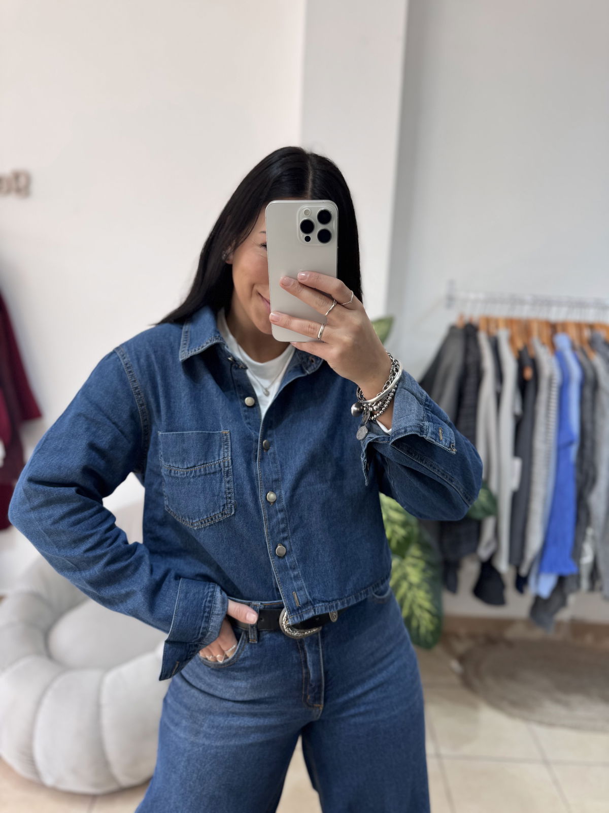 Camisa denim corta, calidad hiper premium. Talle amplio, Lau está usando el talle M