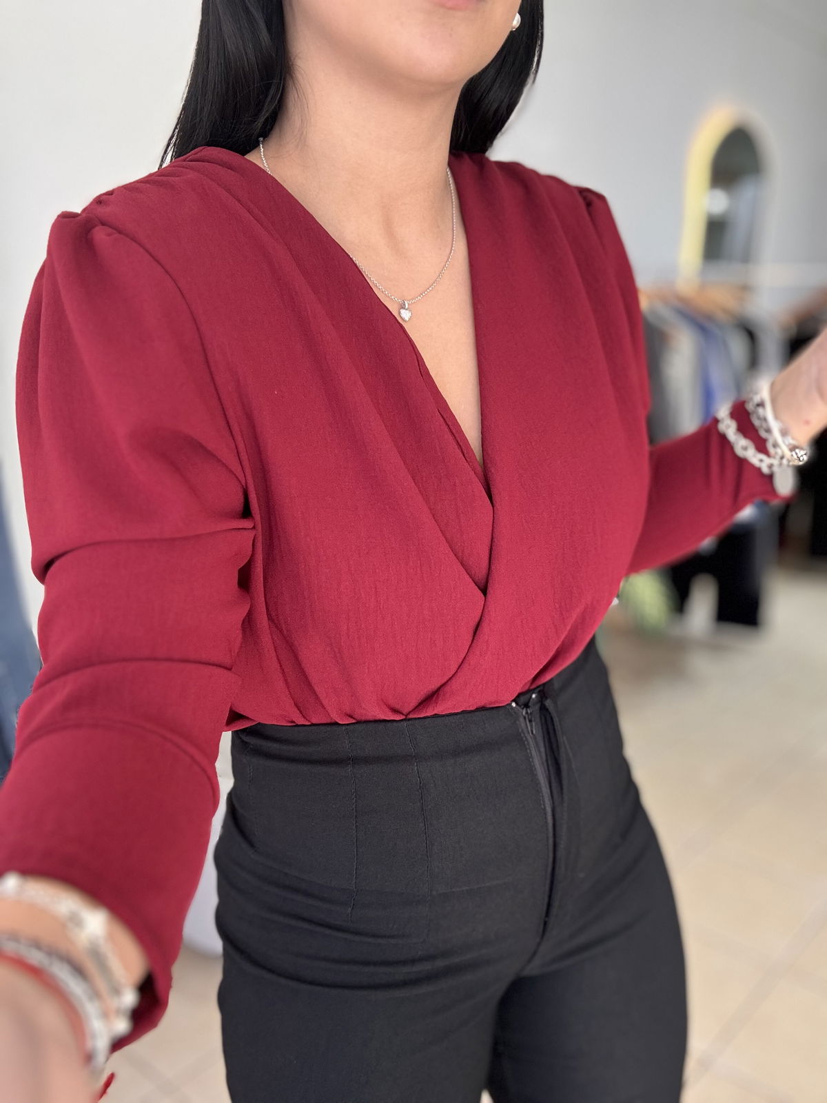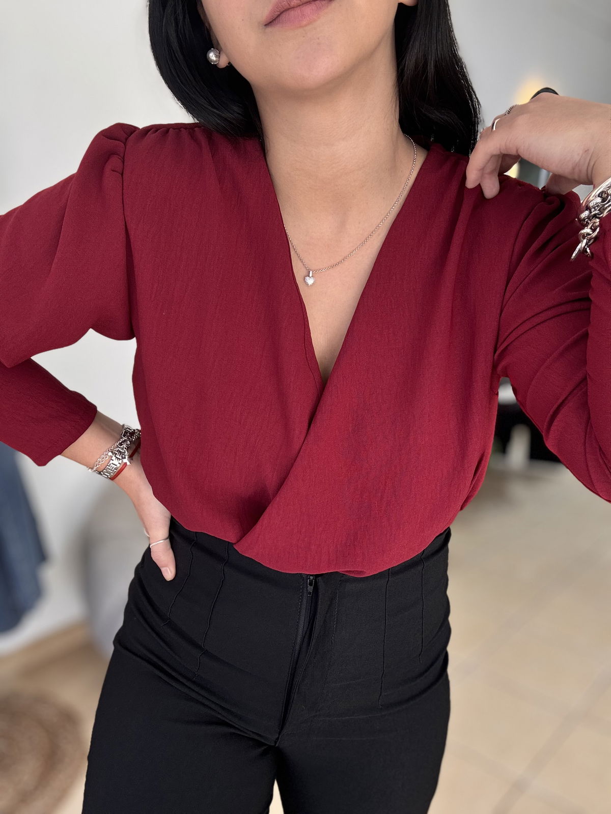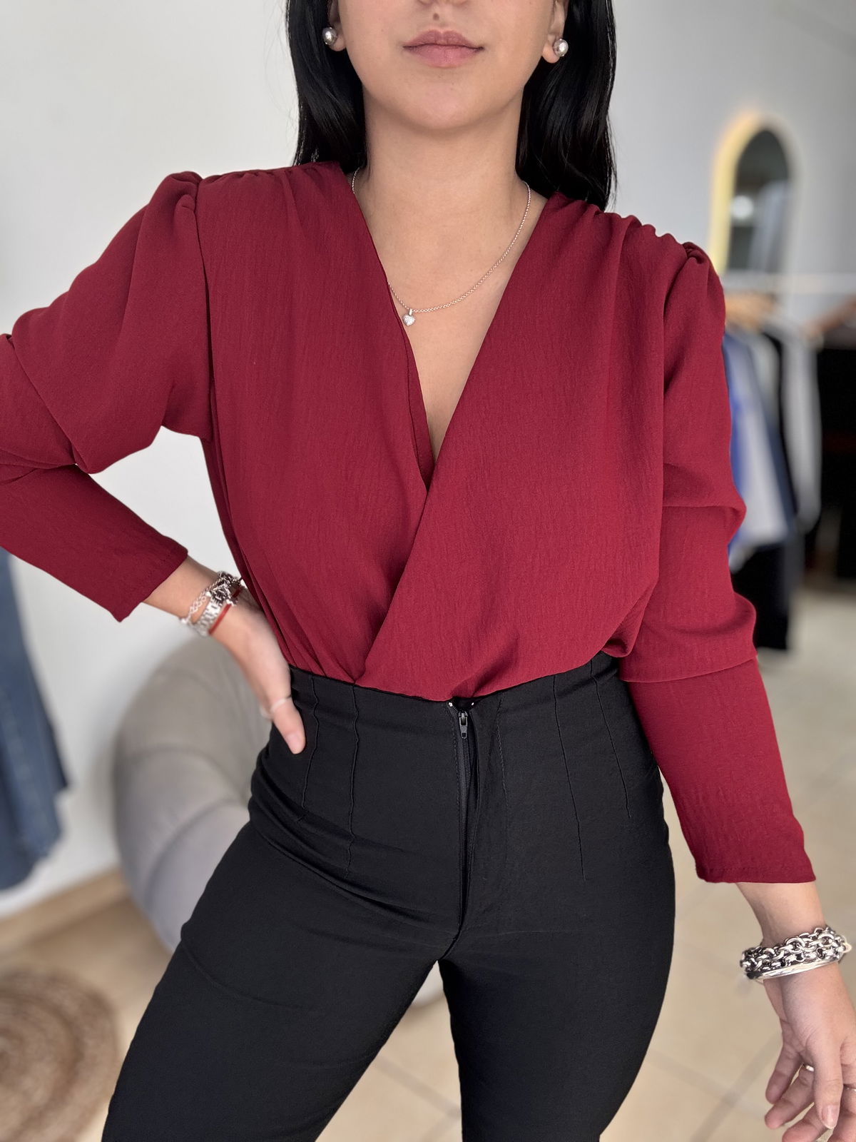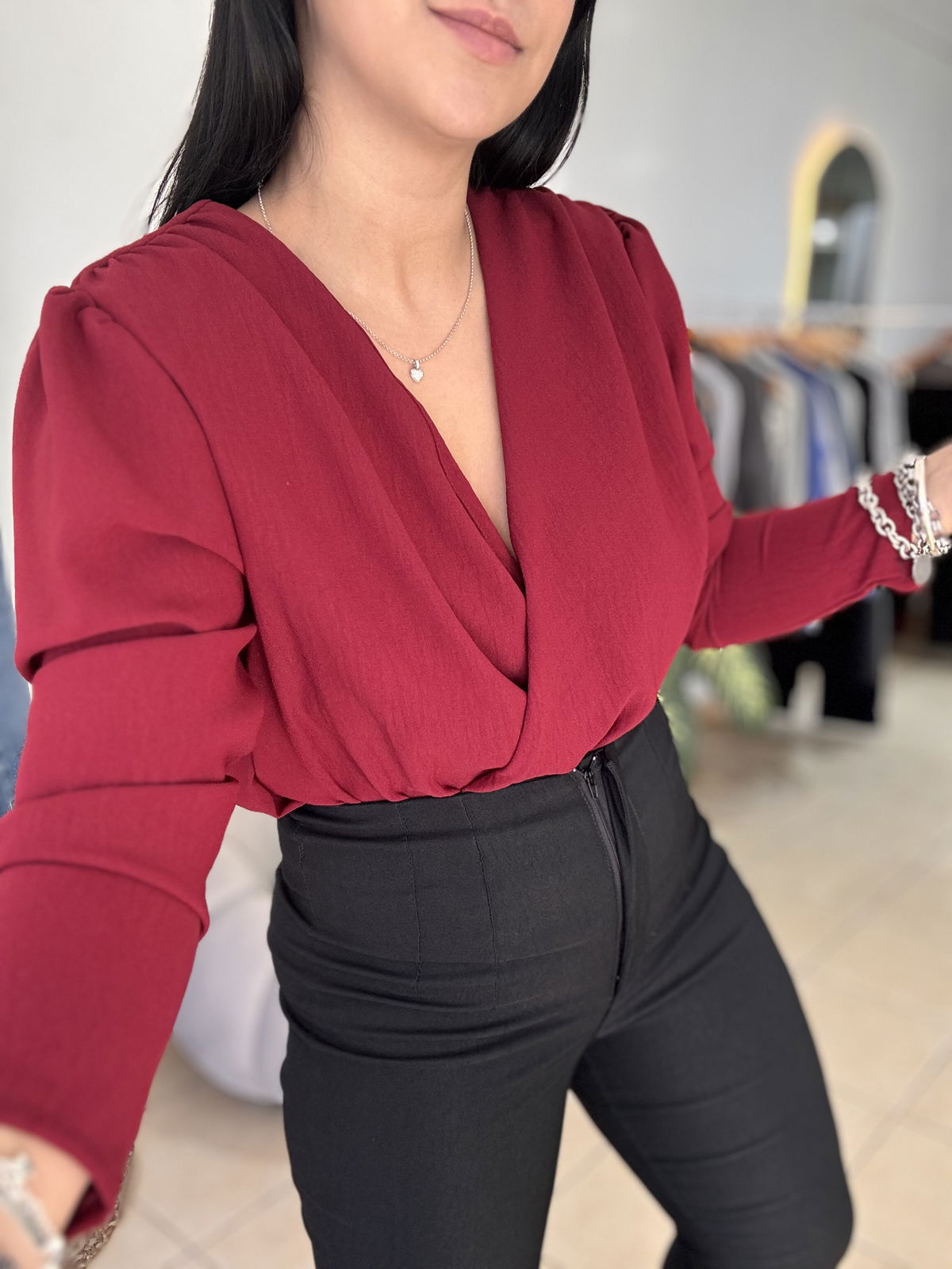 Blusa de cey con hombreras, escote en v. Tiene frunce en su inferior, lo que hace que al meterla por dentro del pantalón no se abra. El talle escote único, abarca hasta un 100 aproximadamente de busto.