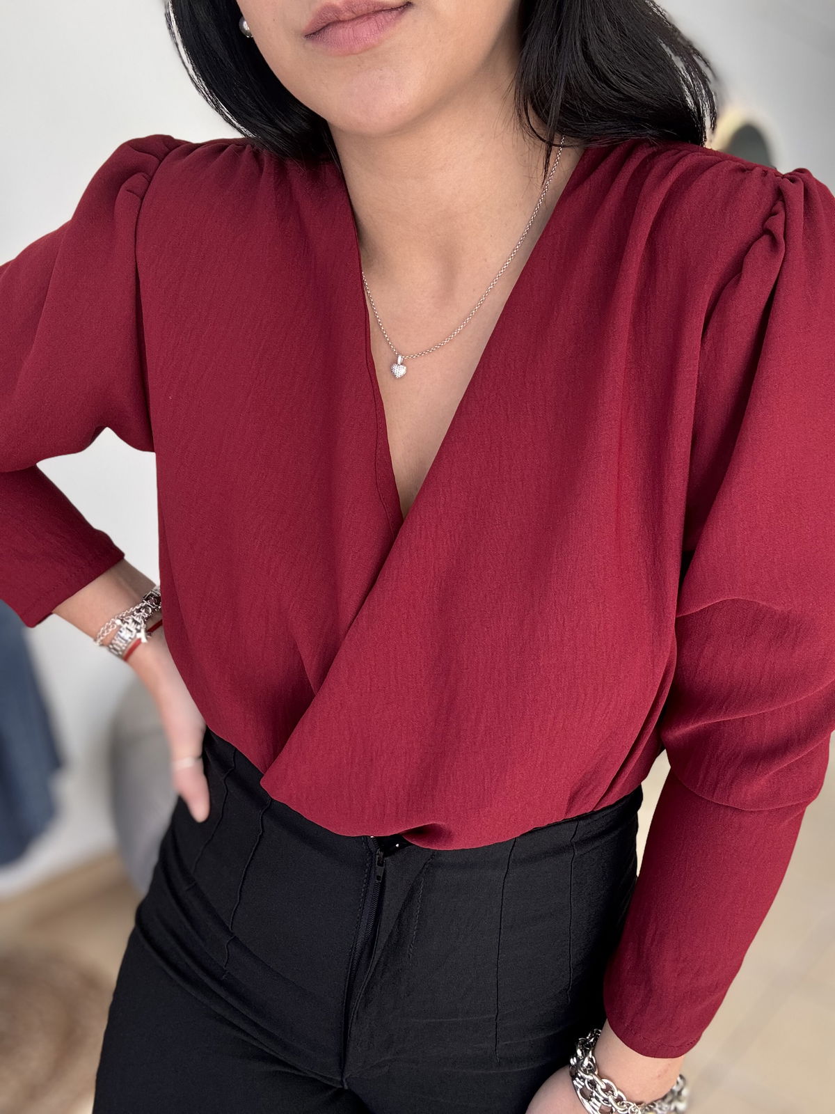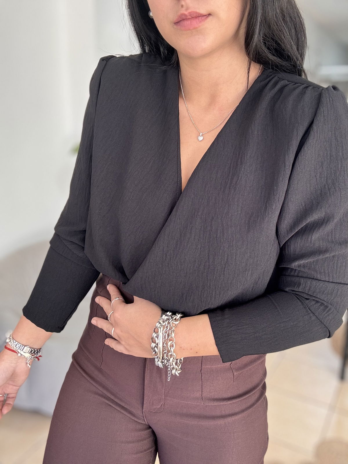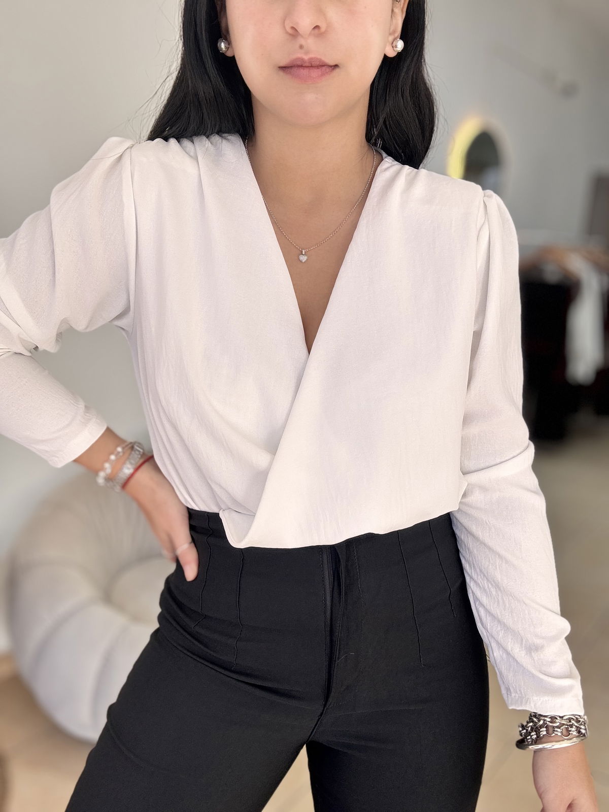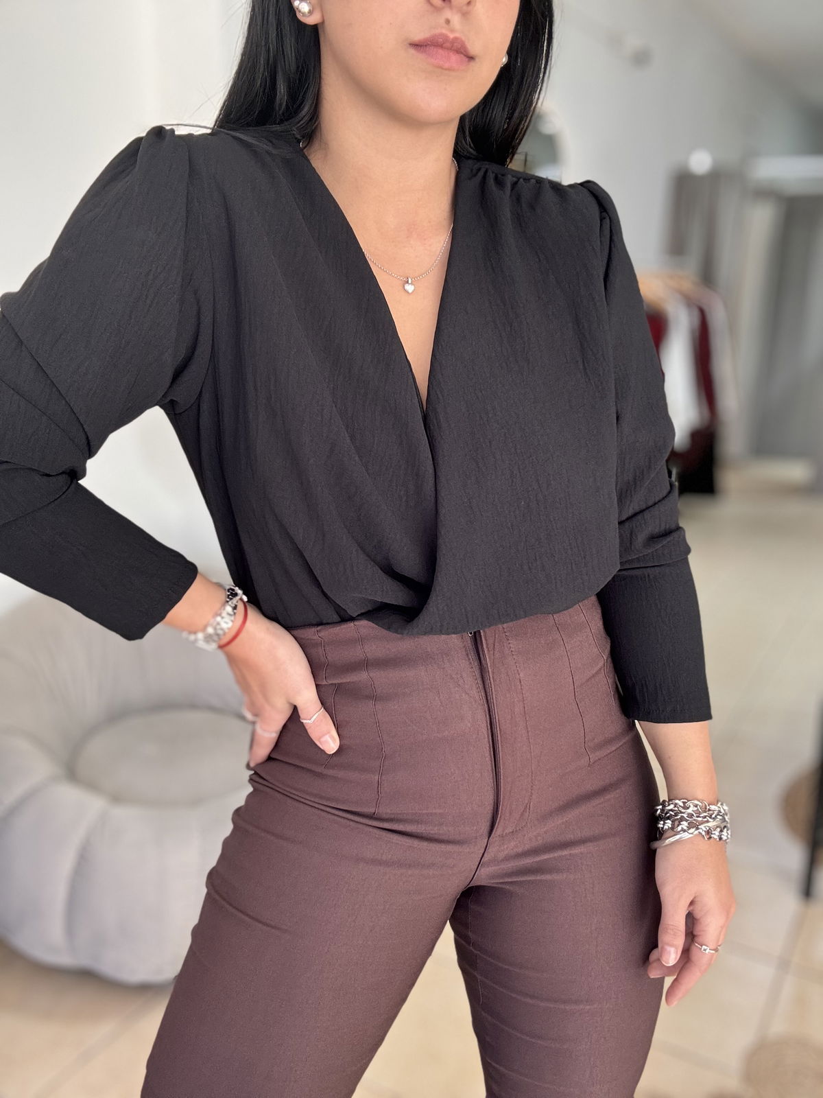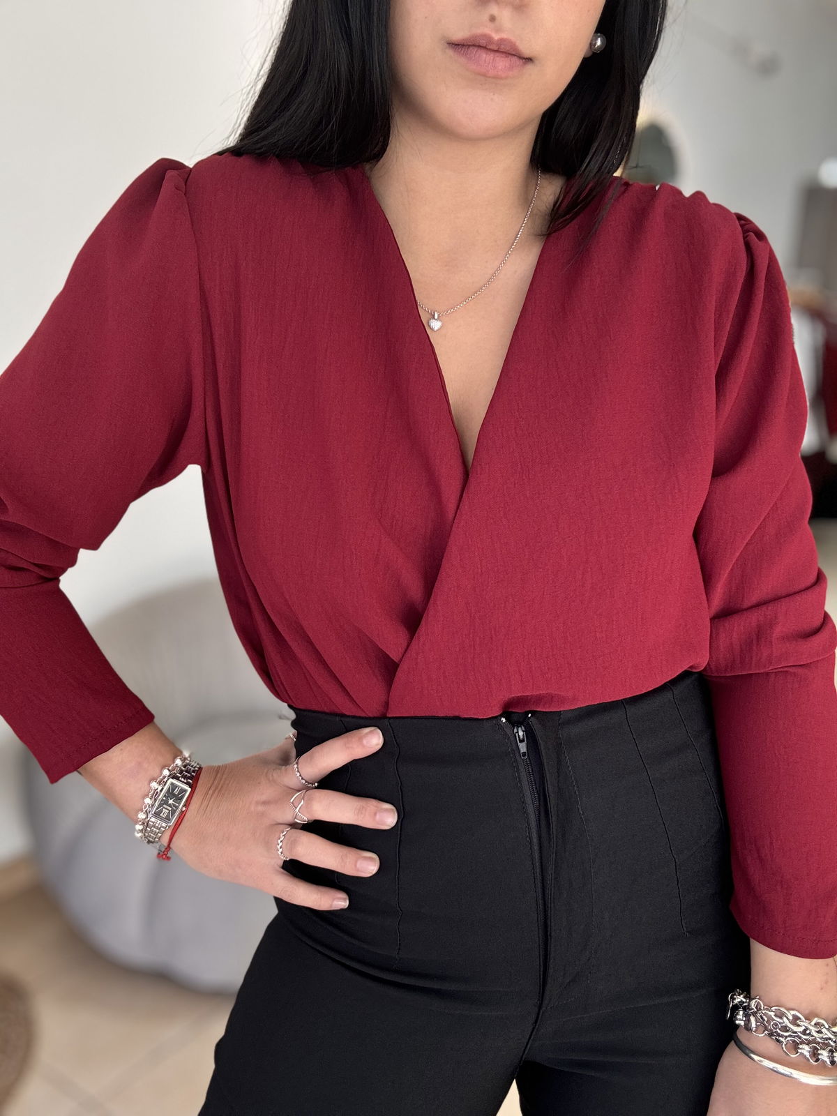 Blusa de cey con hombreras, escote en v. Tiene frunce en su inferior, lo que hace que al meterla por dentro del pantalón no se abra. El talle escote único, abarca hasta un 100 aproximadamente de busto.