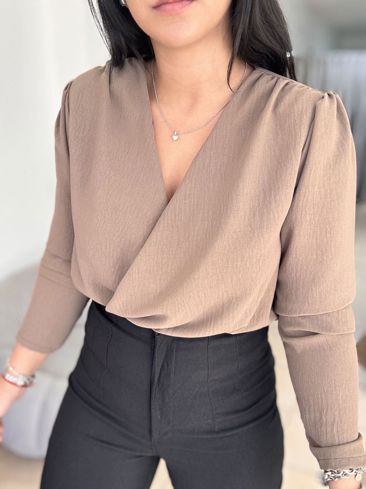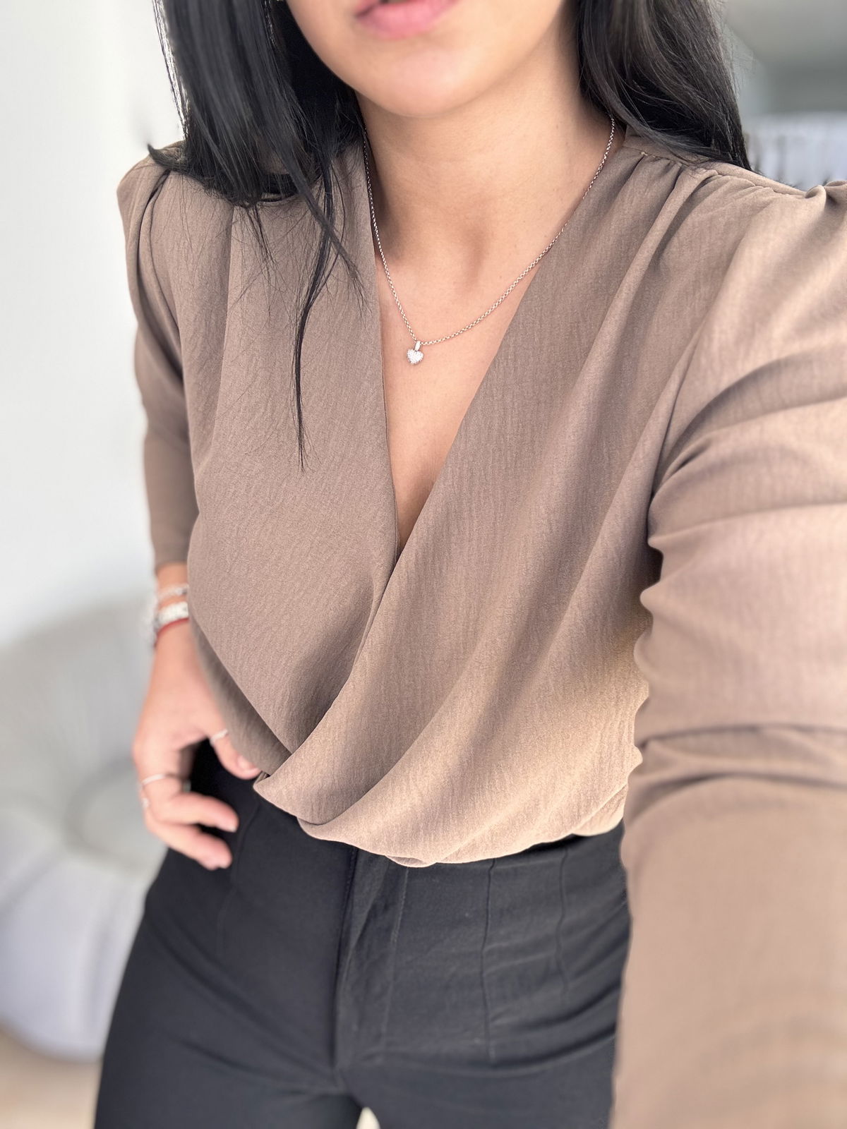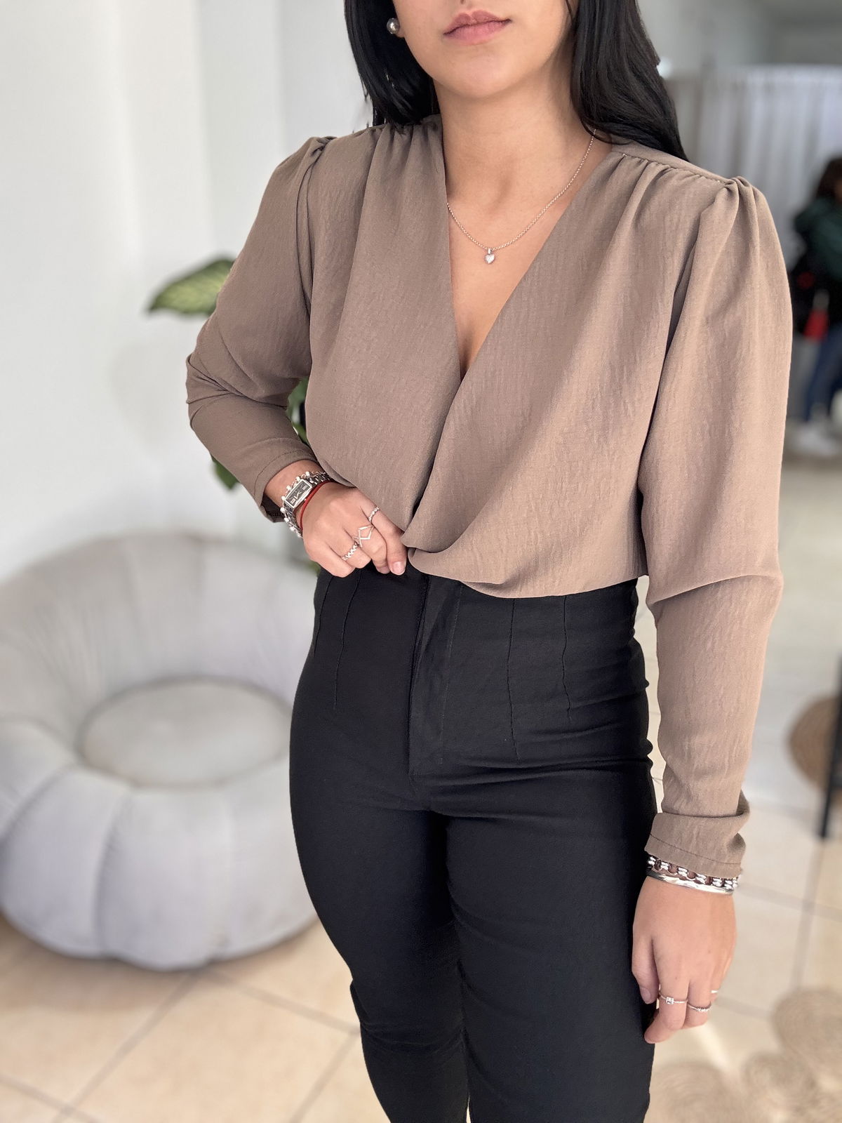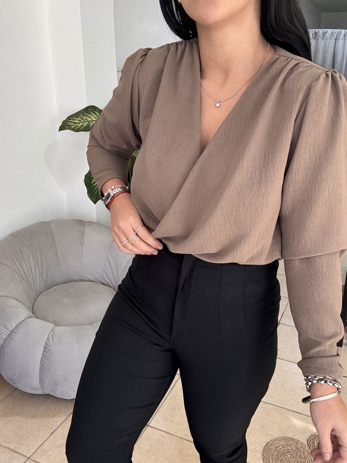 Blusa de cey con hombreras, escote en v. Tiene frunce en su inferior, lo que hace que al meterla por dentro del pantalón no se abra. El talle escote único, abarca hasta un 100 aproximadamente de busto.