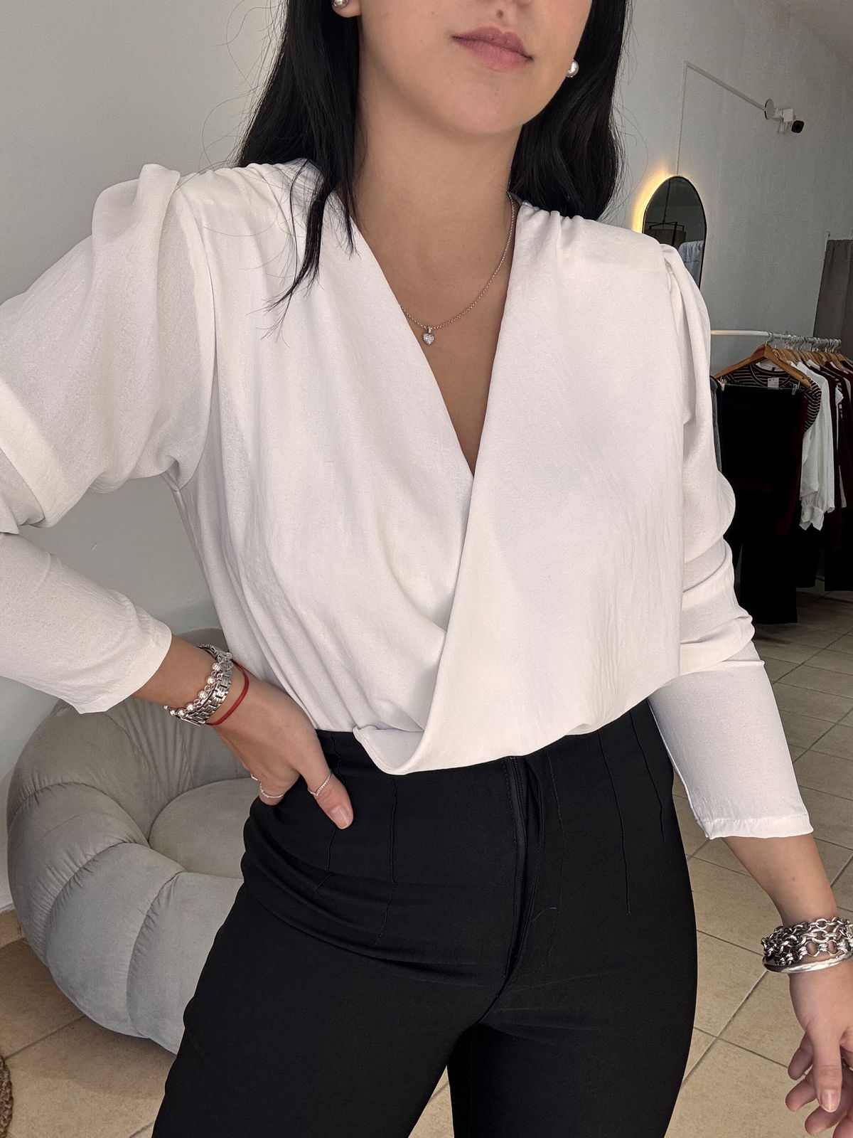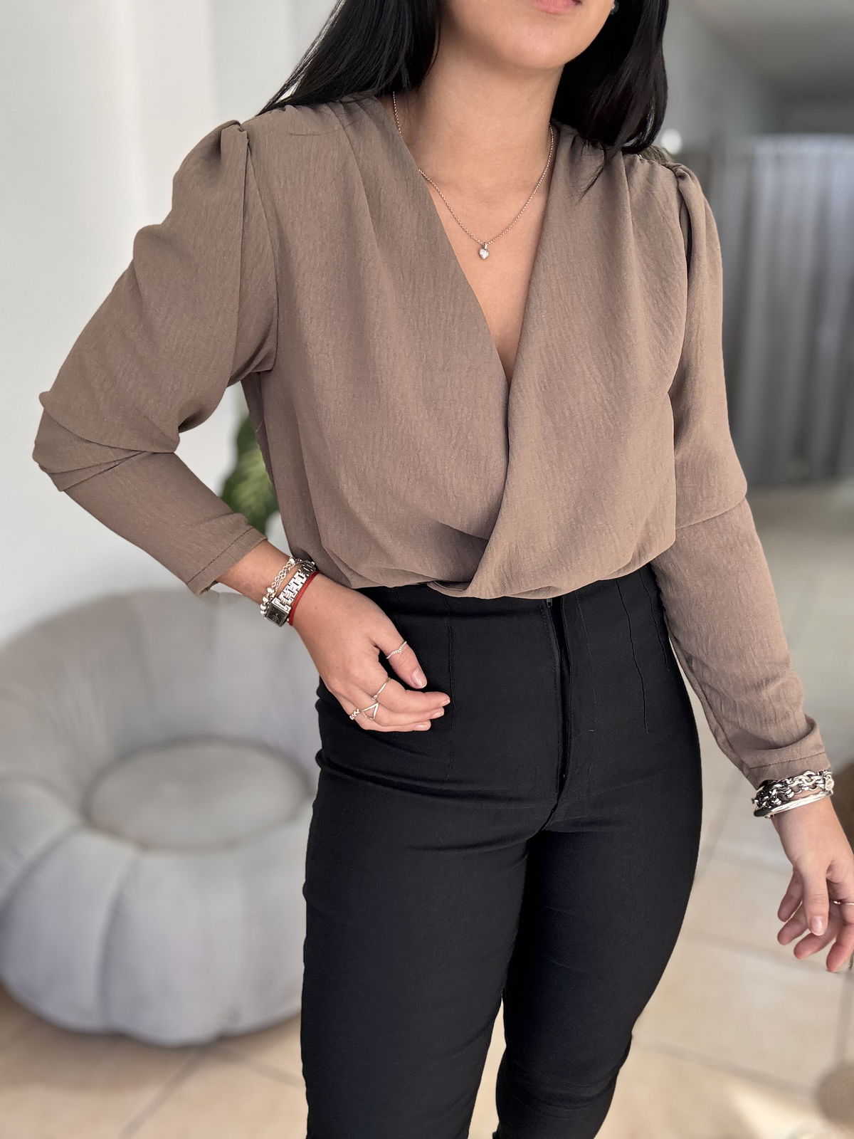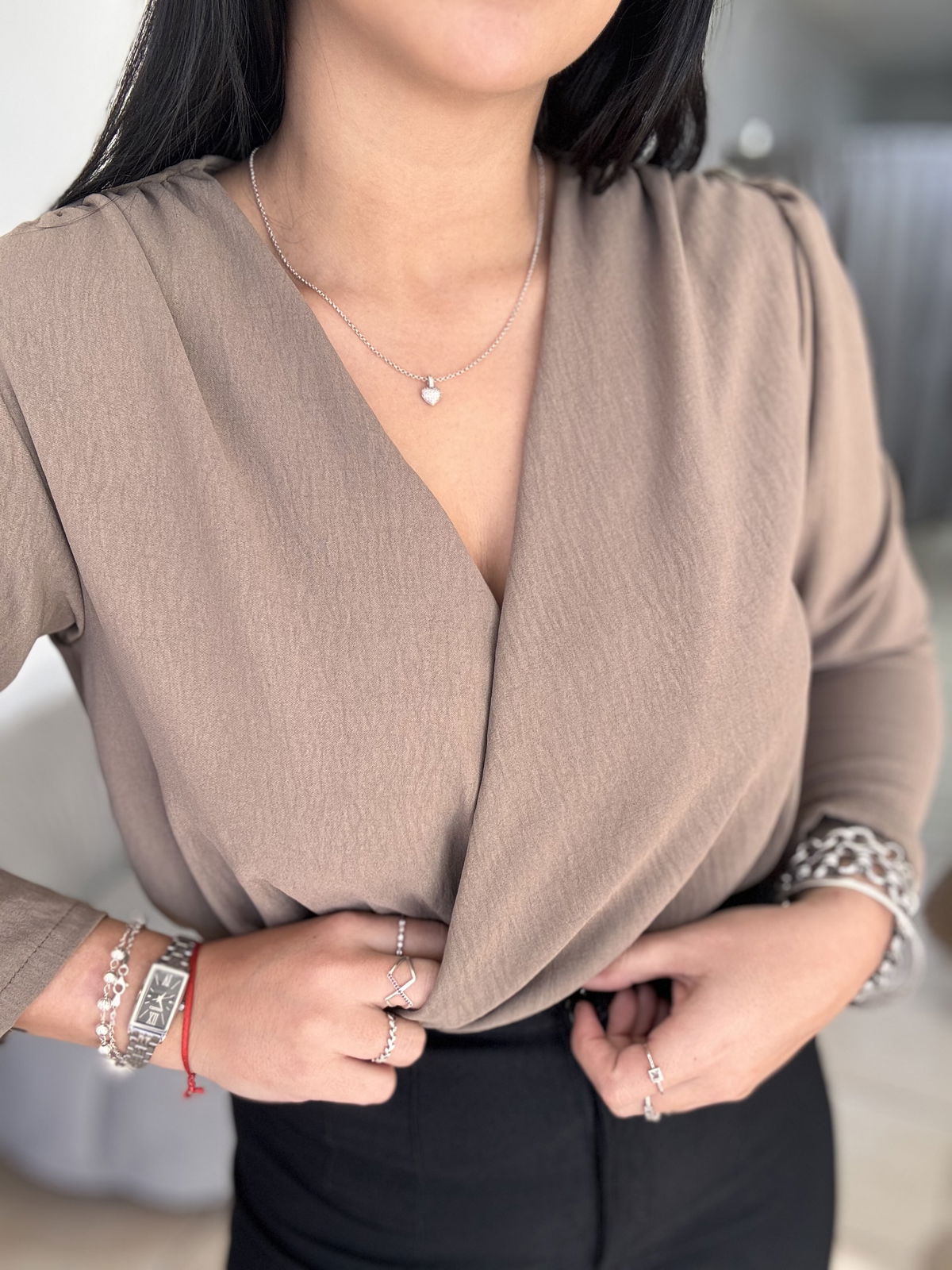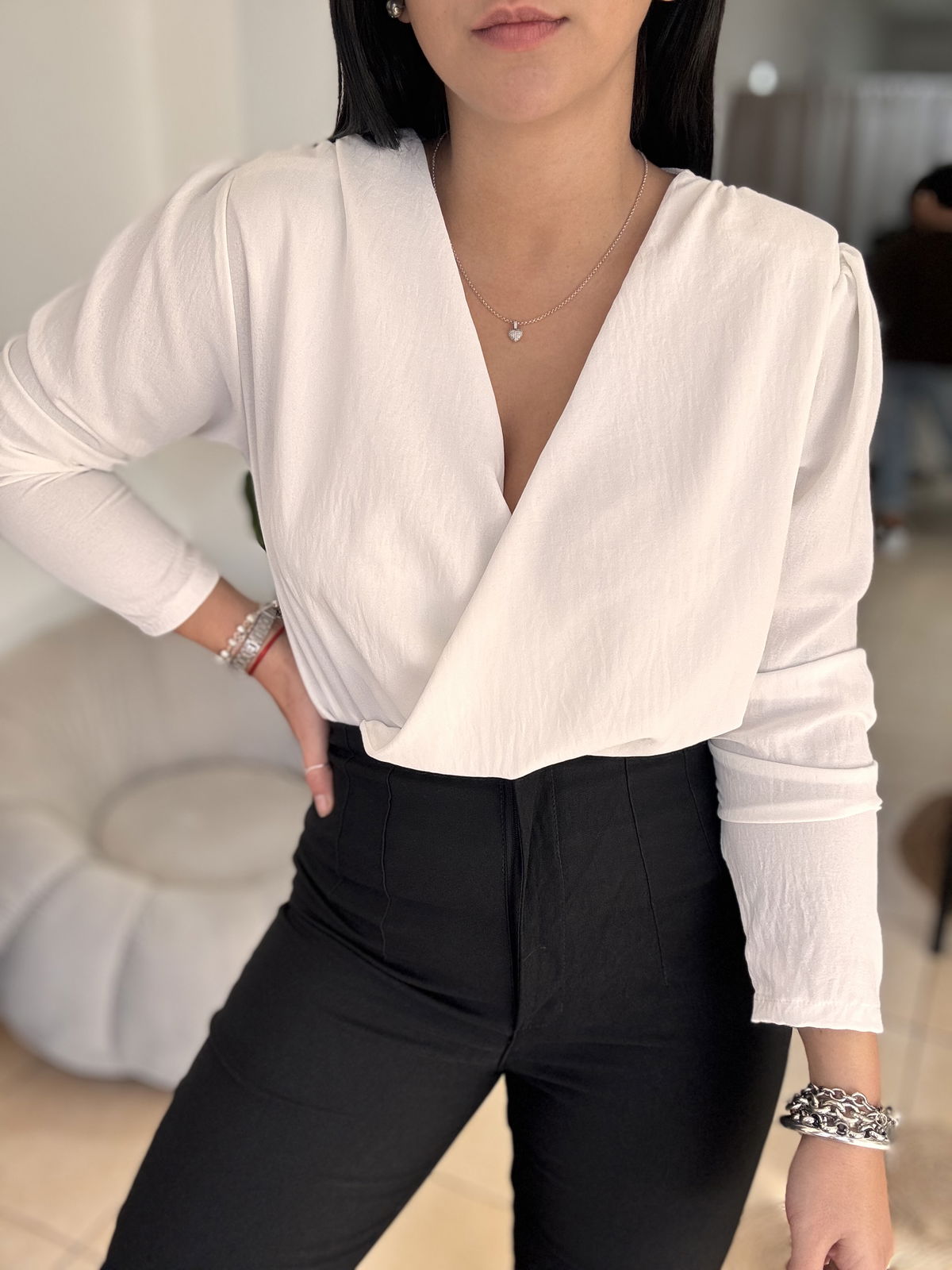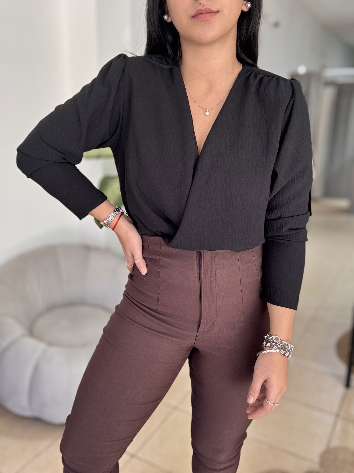 Blusa de cey con hombreras, escote en v. Tiene frunce en su inferior, lo que hace que al meterla por dentro del pantalón no se abra. El talle escote único, abarca hasta un 100 aproximadamente de busto.