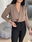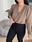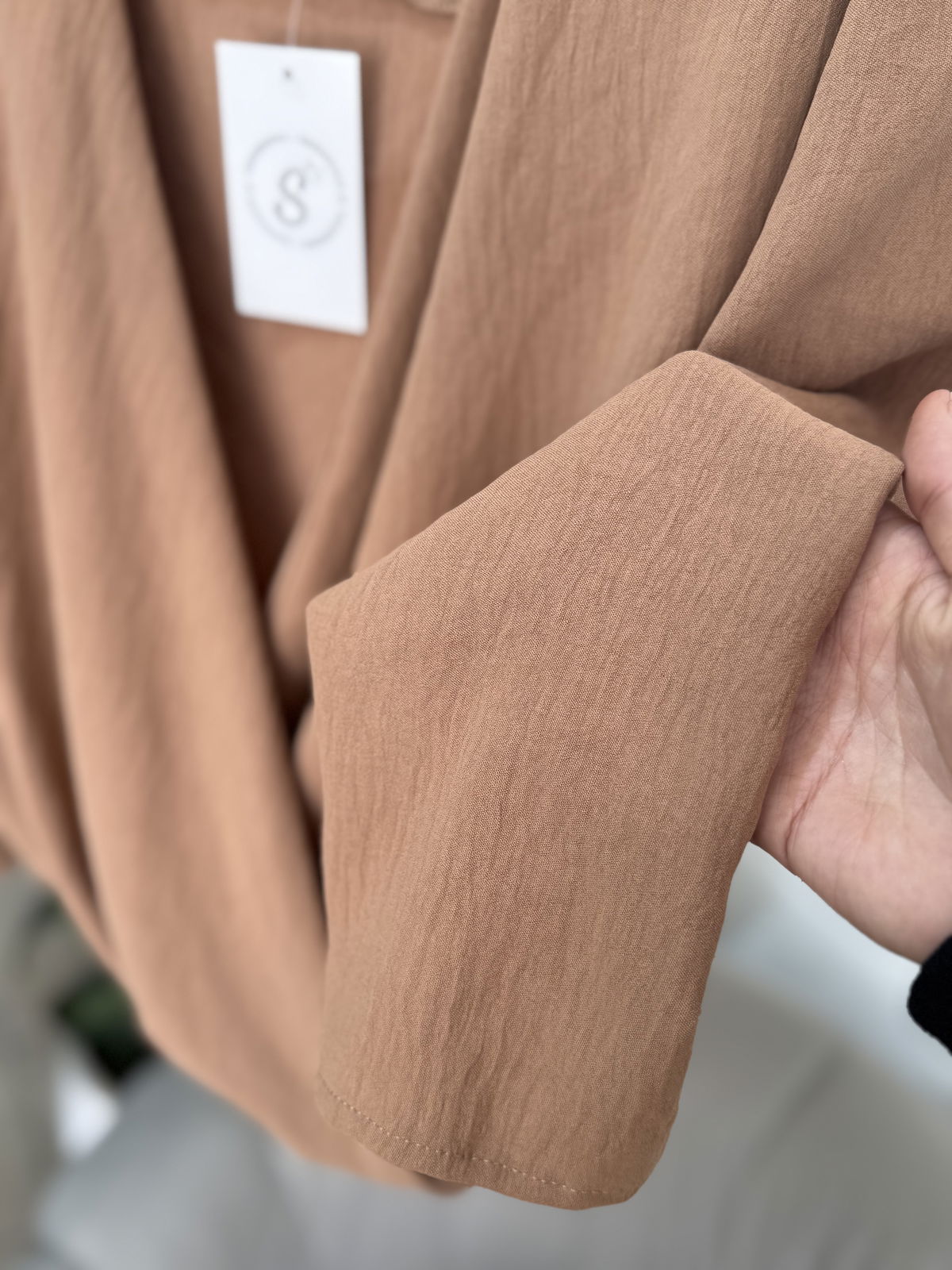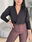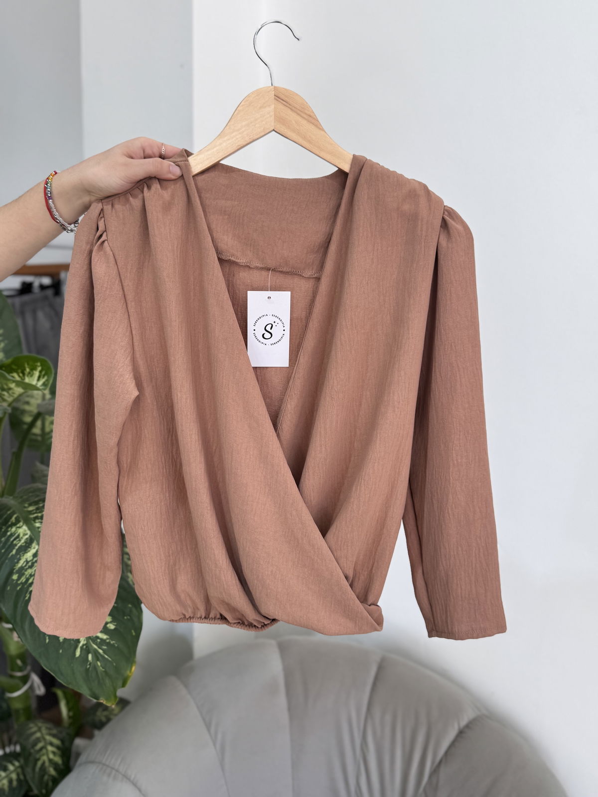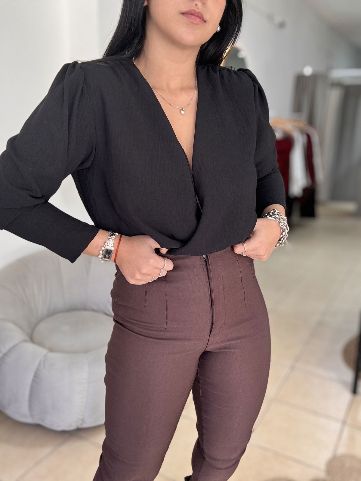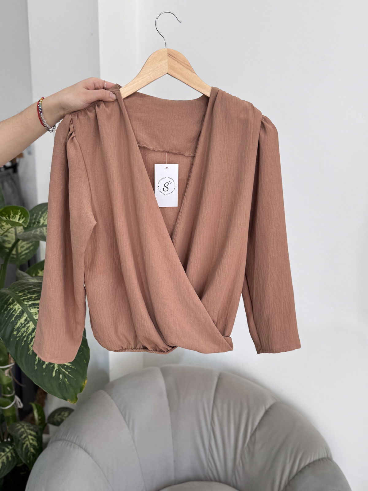 Blusa de cey con hombreras, escote en v. Tiene frunce en su inferior, lo que hace que al meterla por dentro del pantalón no se abra. El talle escote único, abarca hasta un 100 aproximadamente de busto.