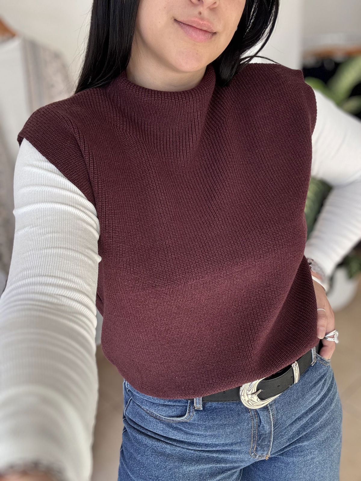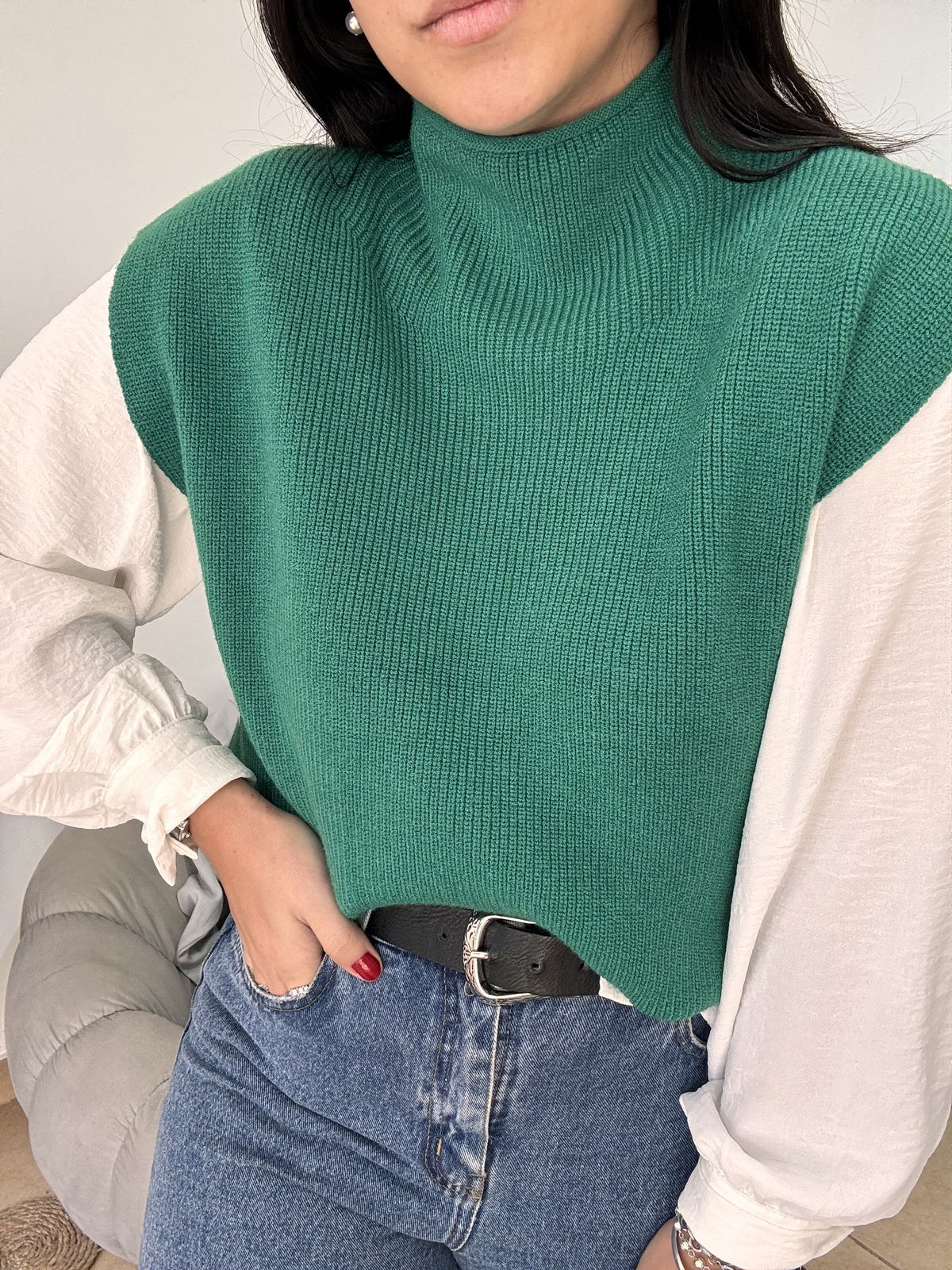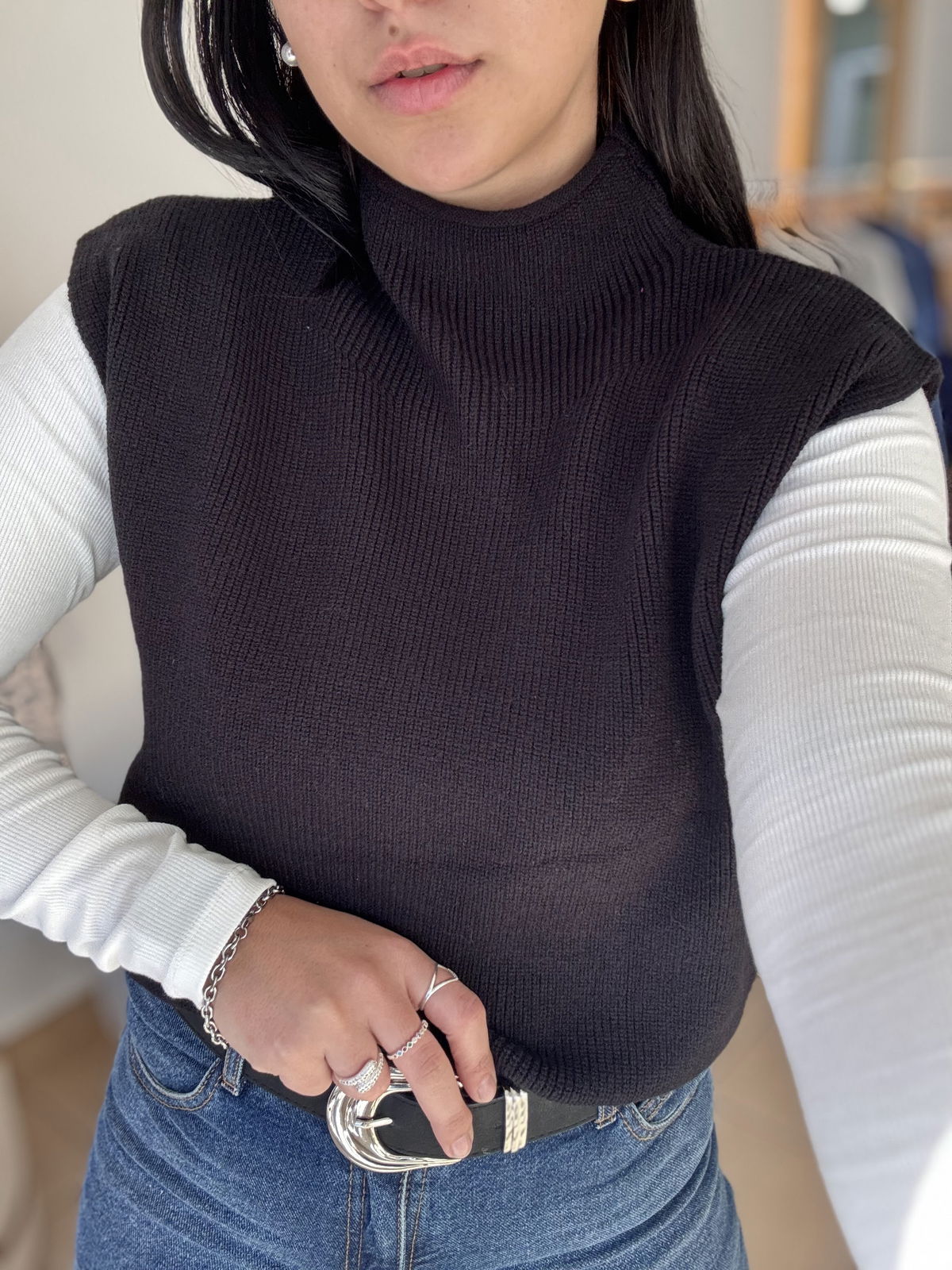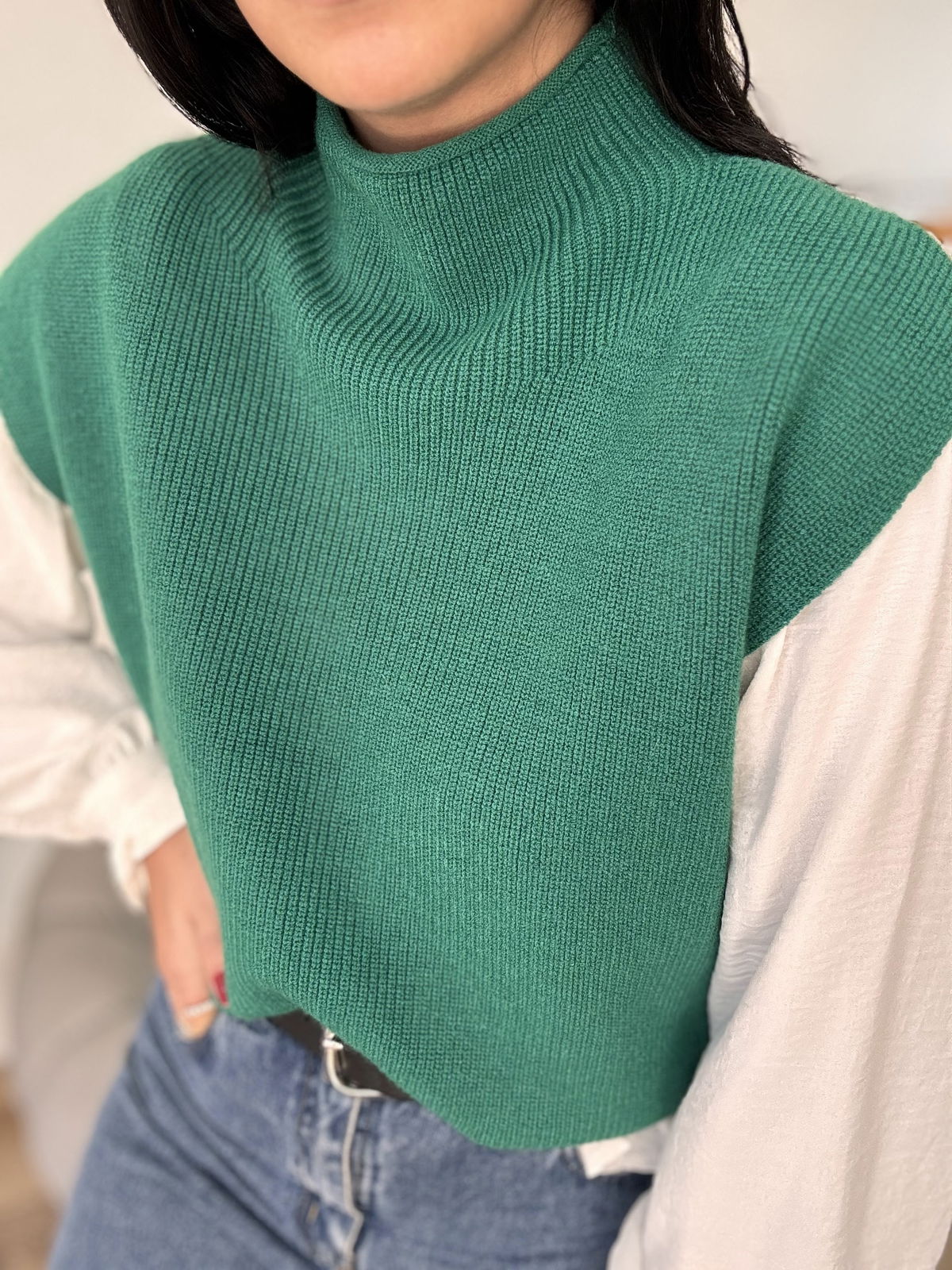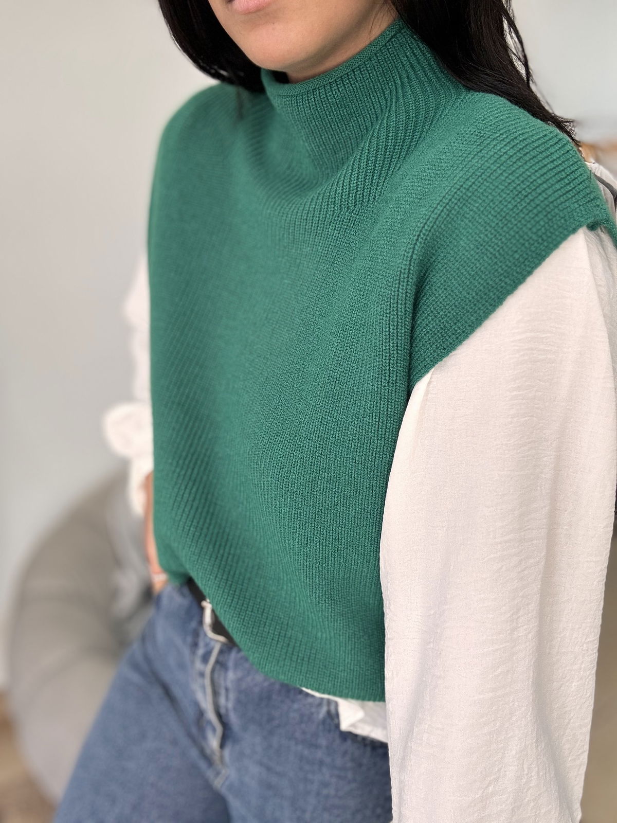 Chaleco de lana super liviano con cuellito media polera. Un básico para que puedas usar con remeras manga larga y también solo cuando arrancan esos días de calorcito