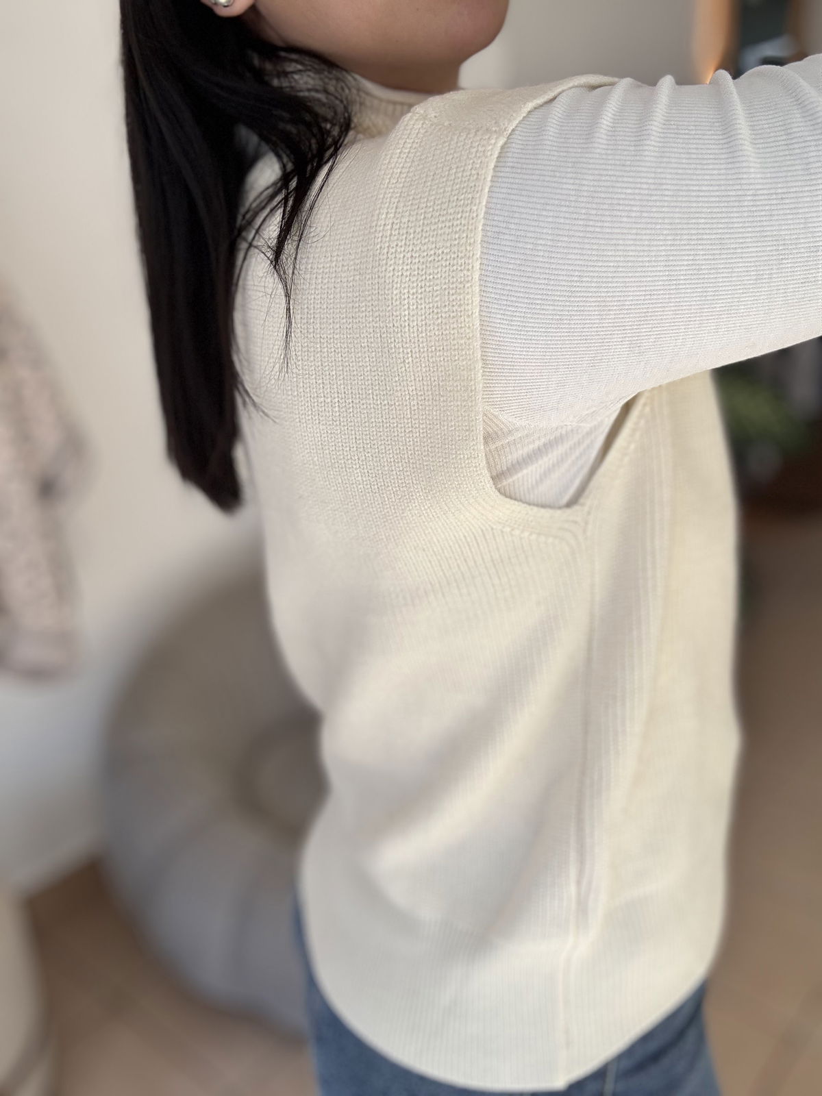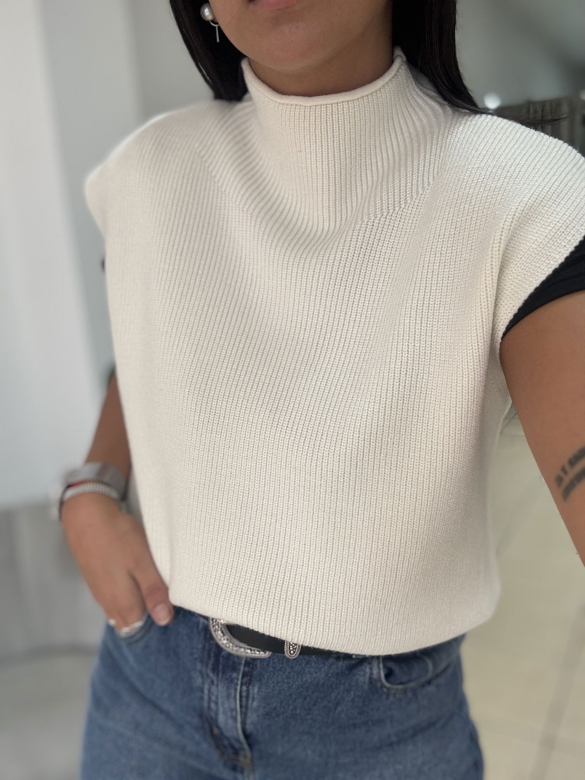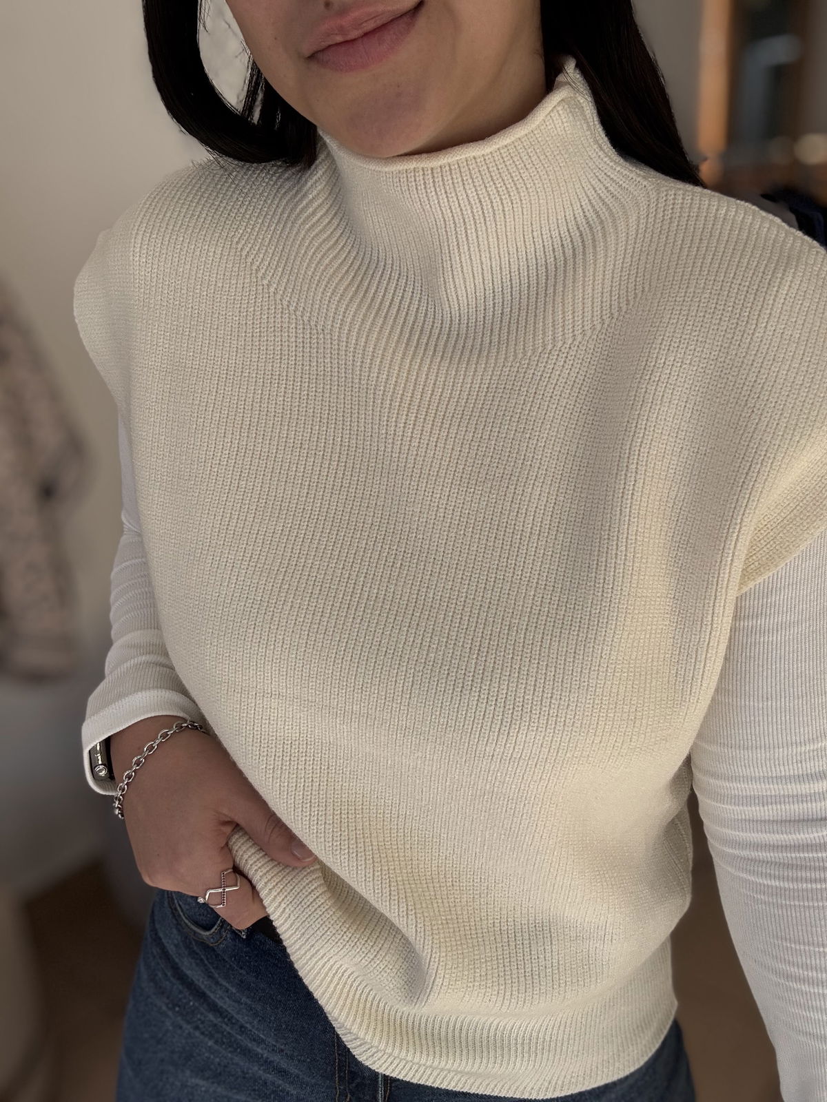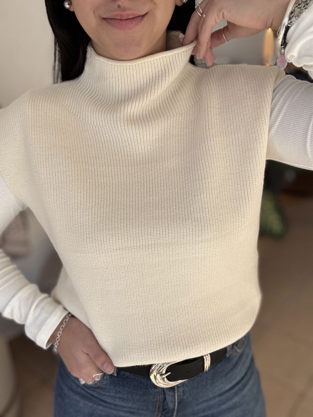 Chaleco de lana super liviano con cuellito media polera. Un básico para que puedas usar con remeras manga larga y también solo cuando arrancan esos días de calorcito