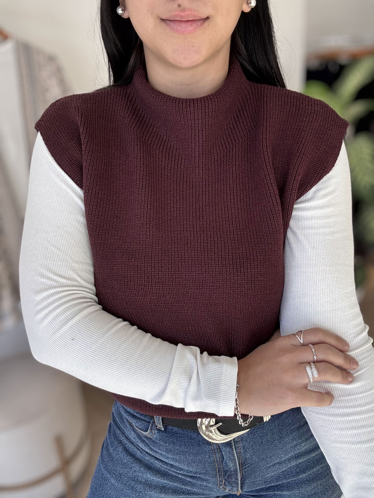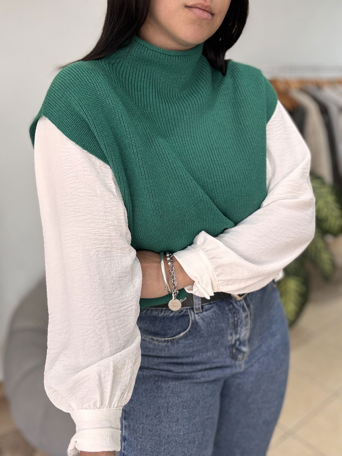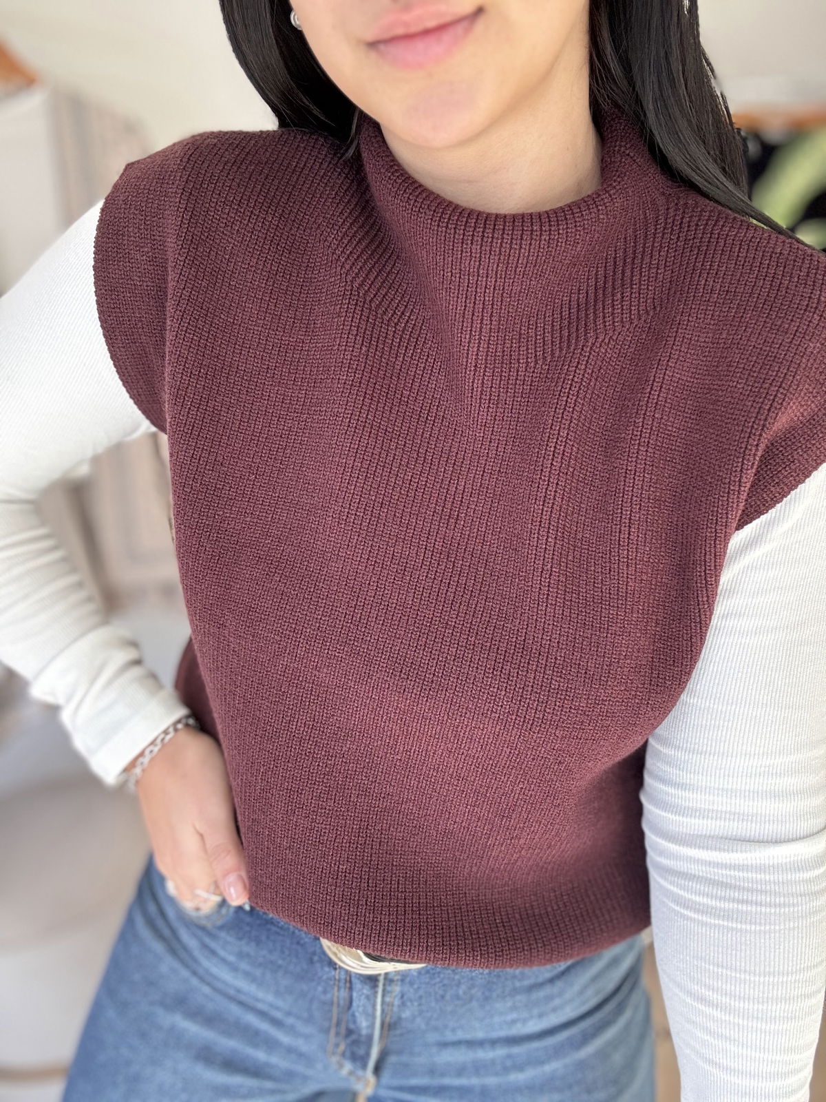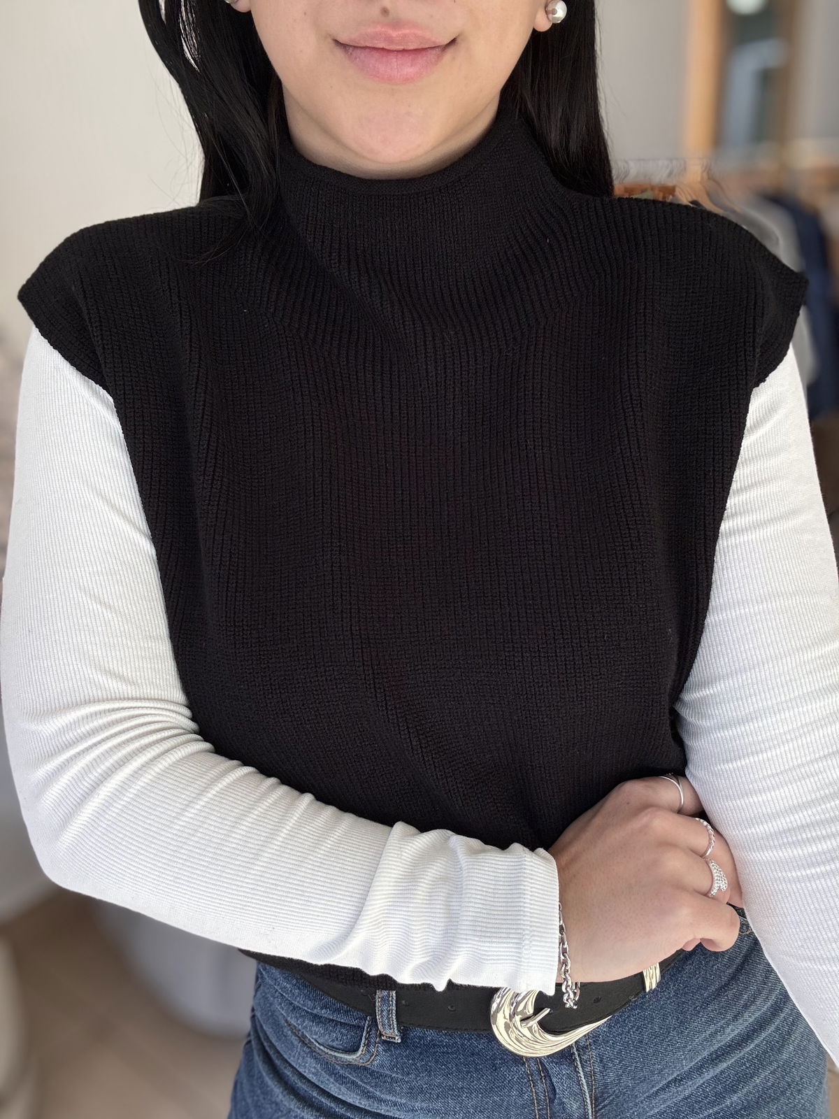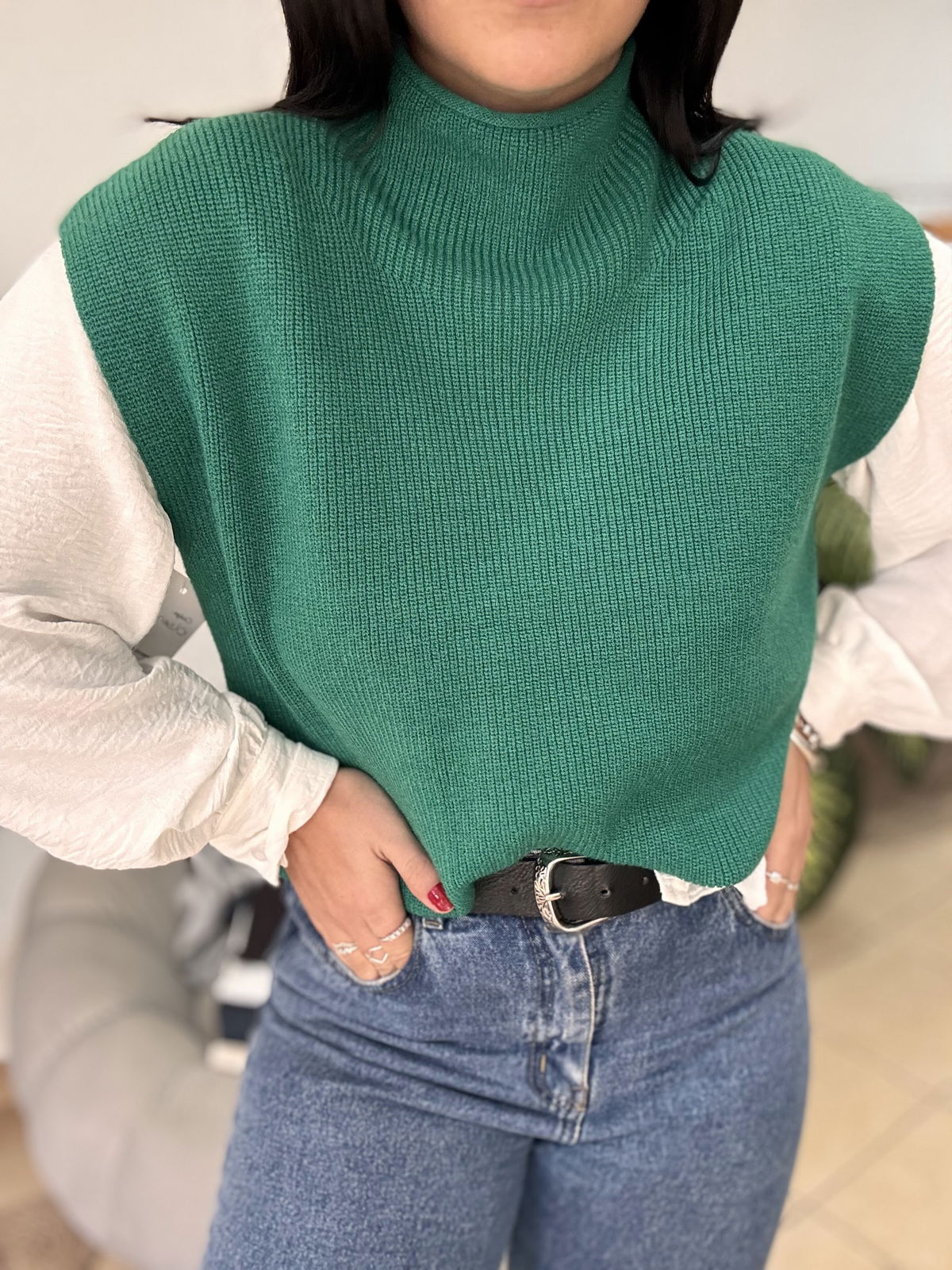Chaleco de lana super liviano con cuellito media polera. Un básico para que puedas usar con remeras manga larga y también solo cuando arrancan esos días de calorcito