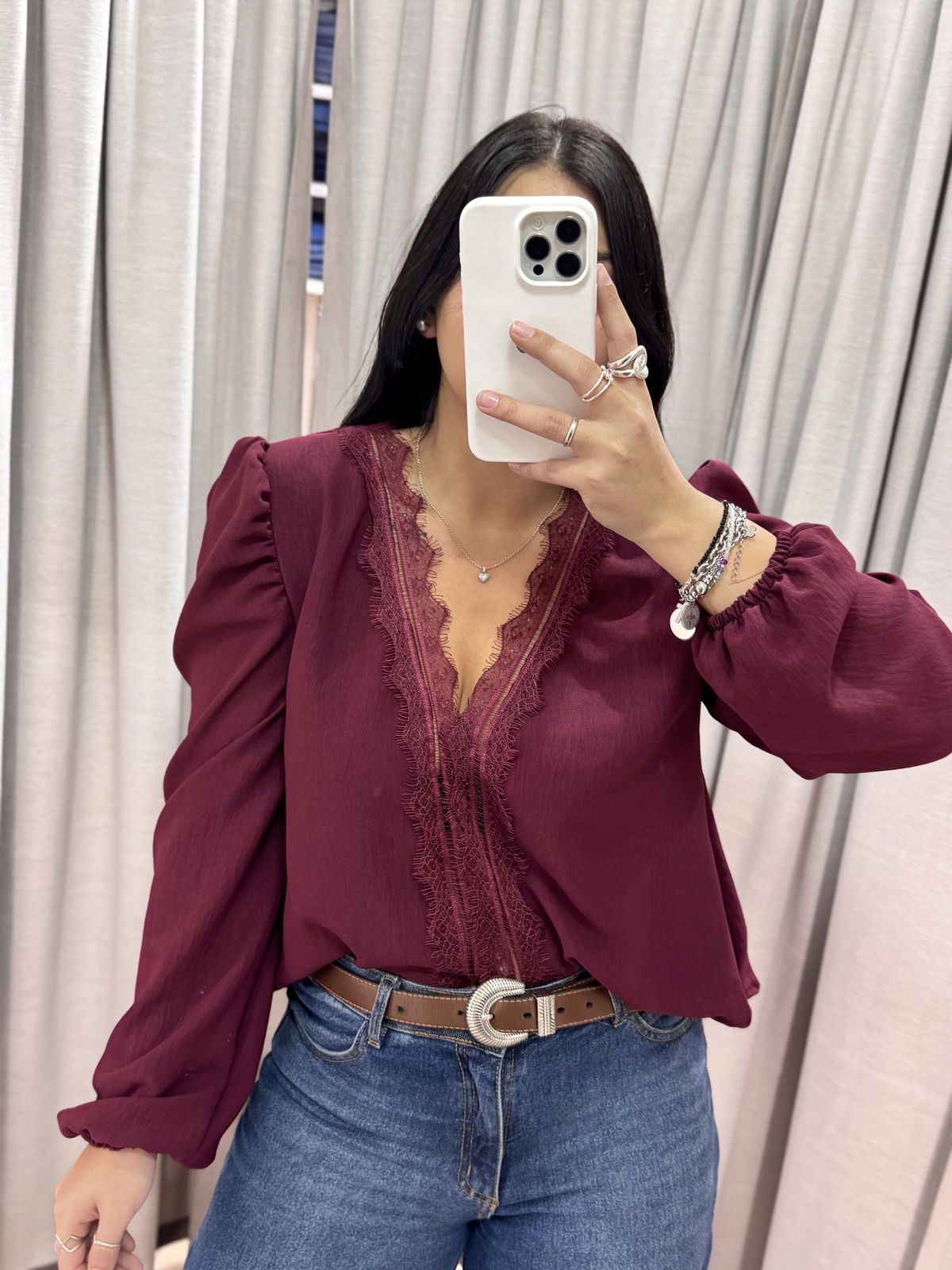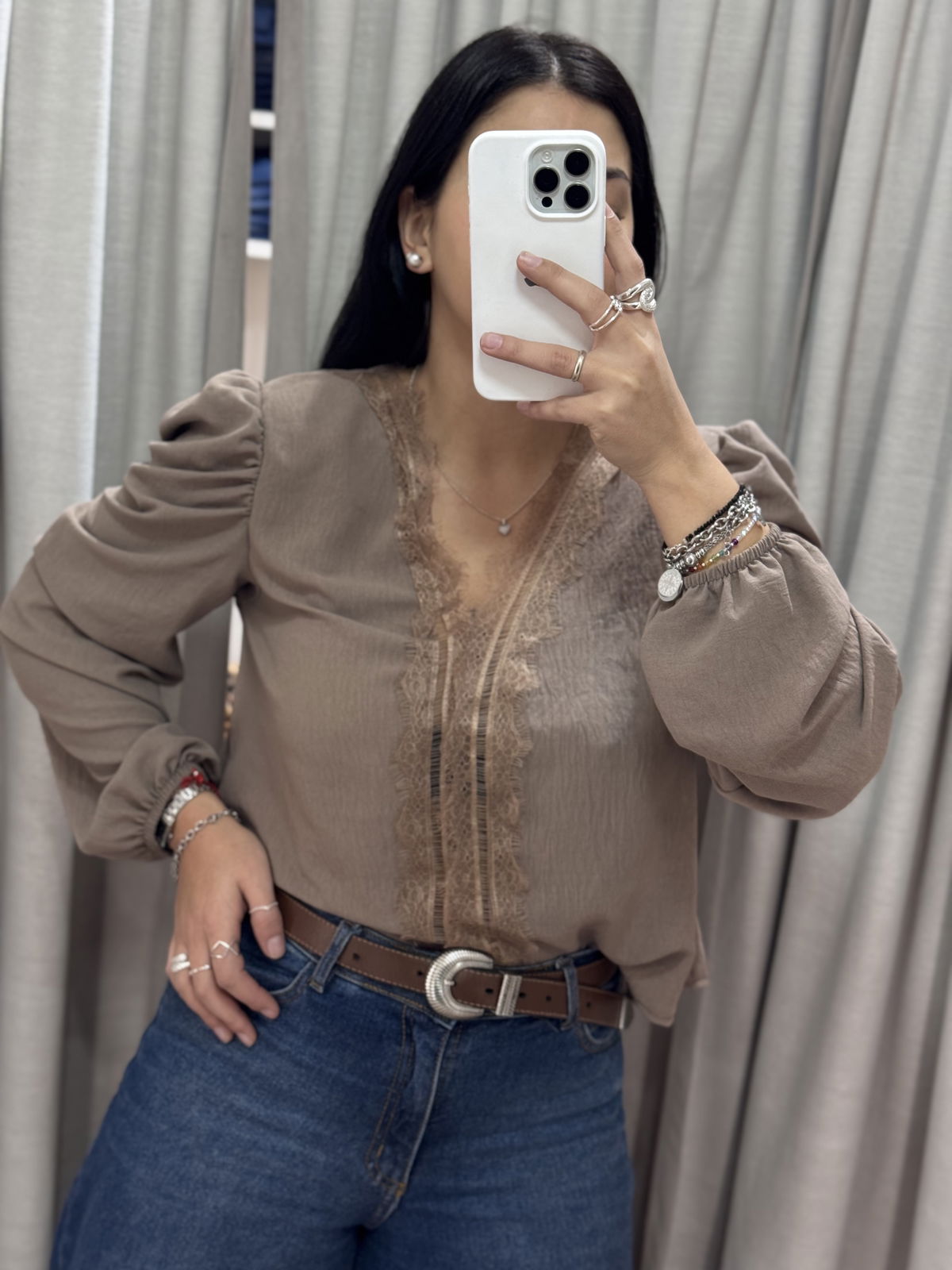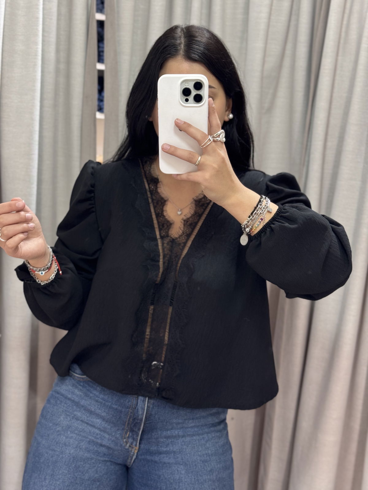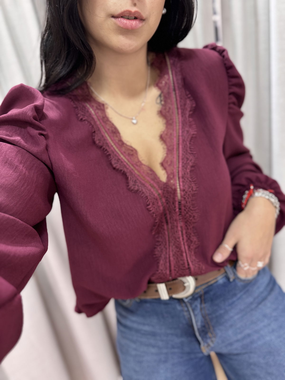 Blusa manga larga con puntilla en busto, tiene manguita semi princesa y frunce en puño.