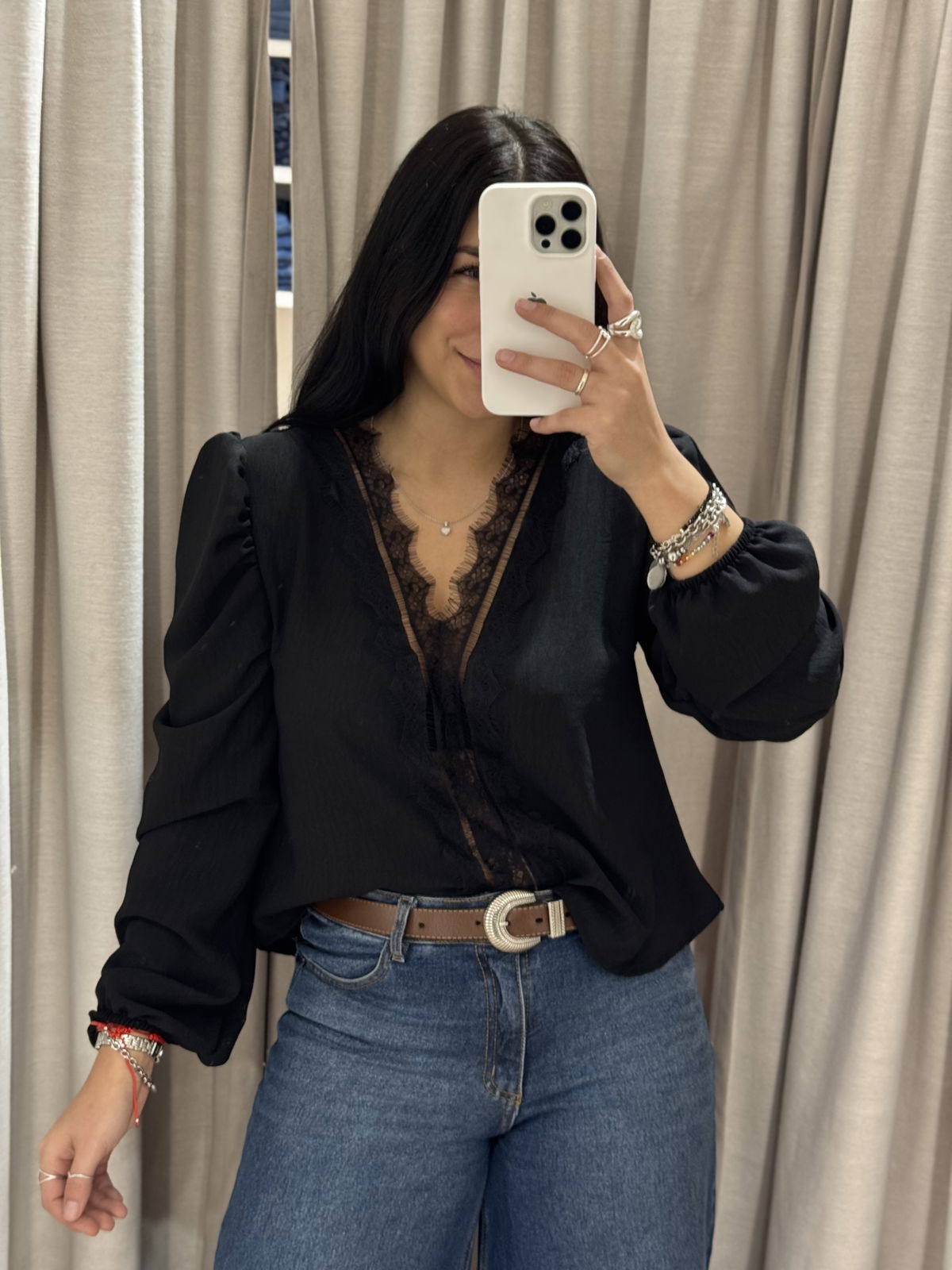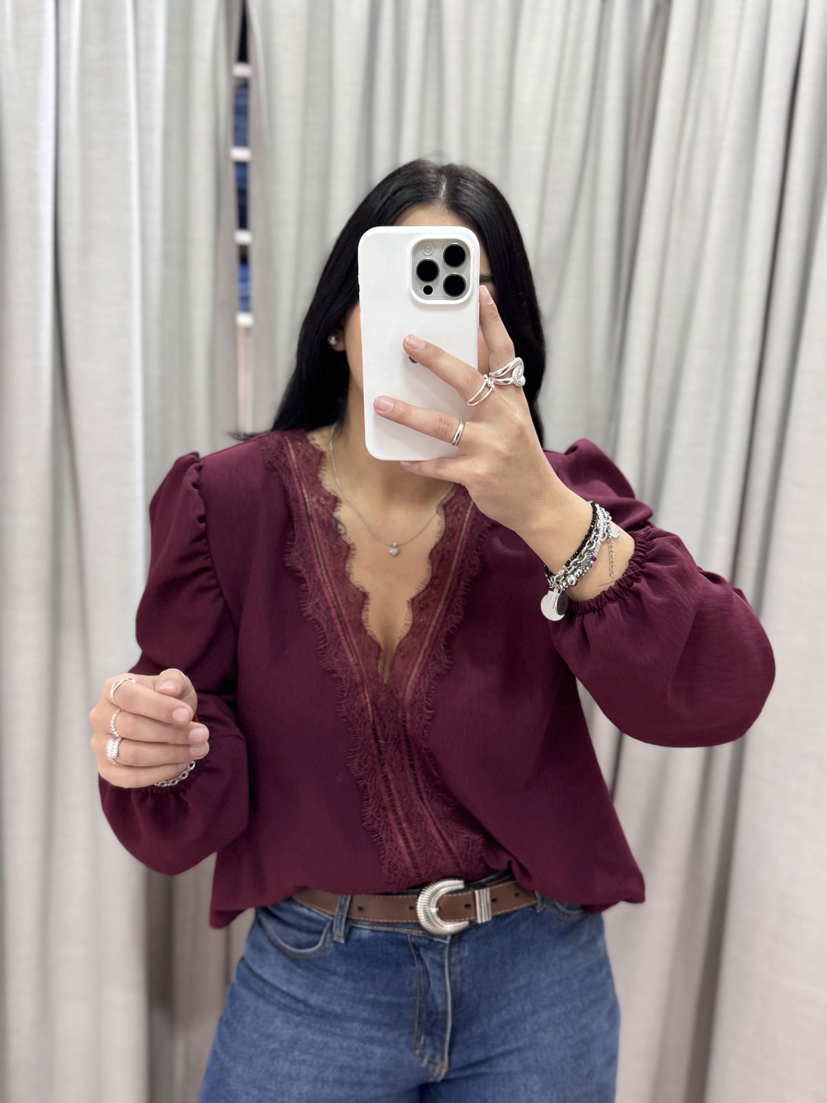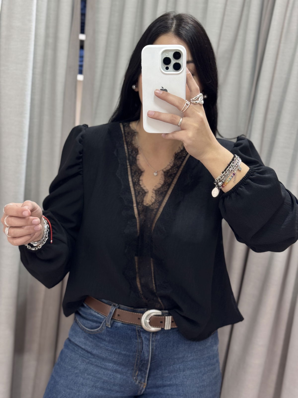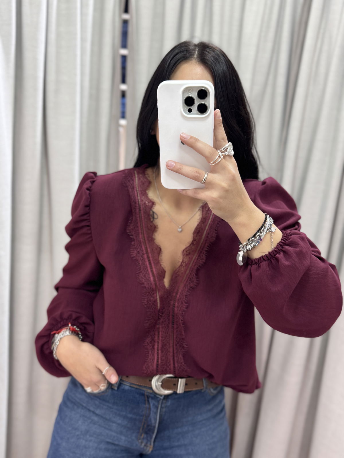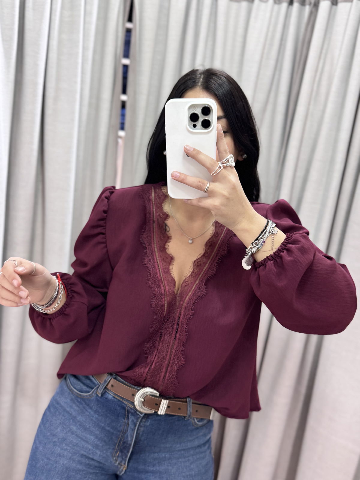 Blusa manga larga con puntilla en busto, tiene manguita semi princesa y frunce en puño.