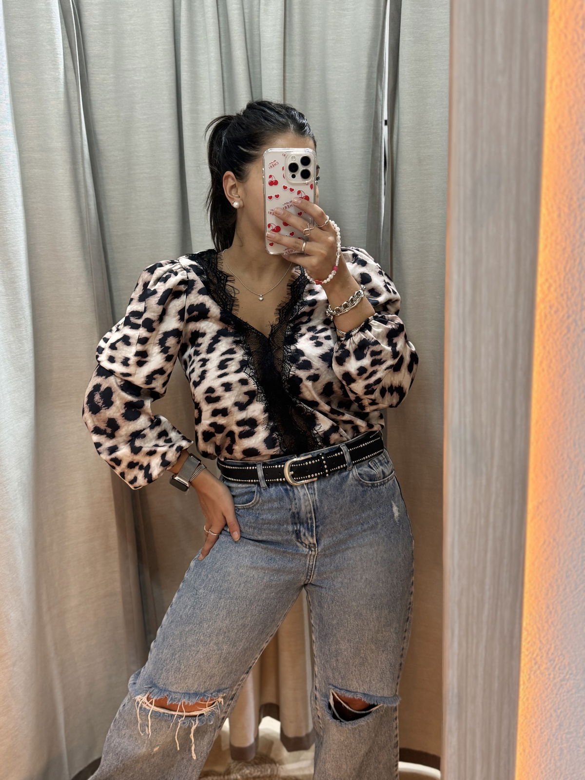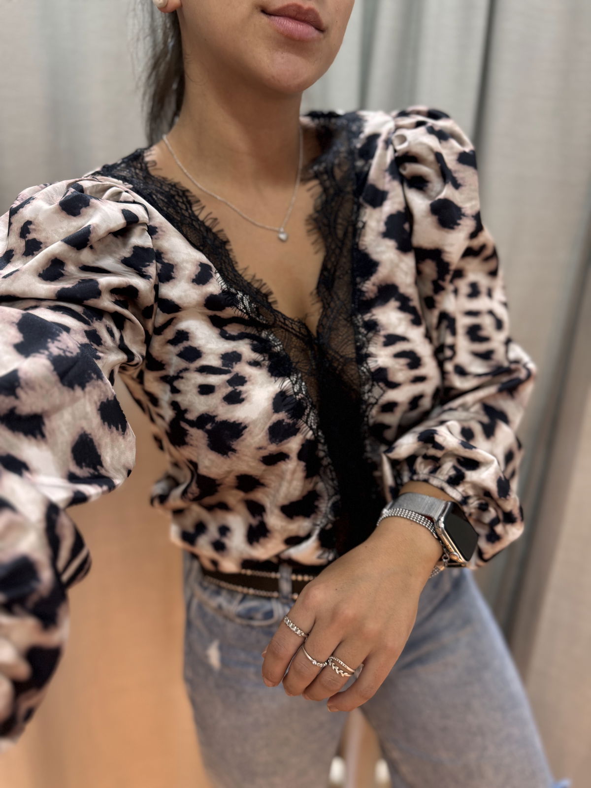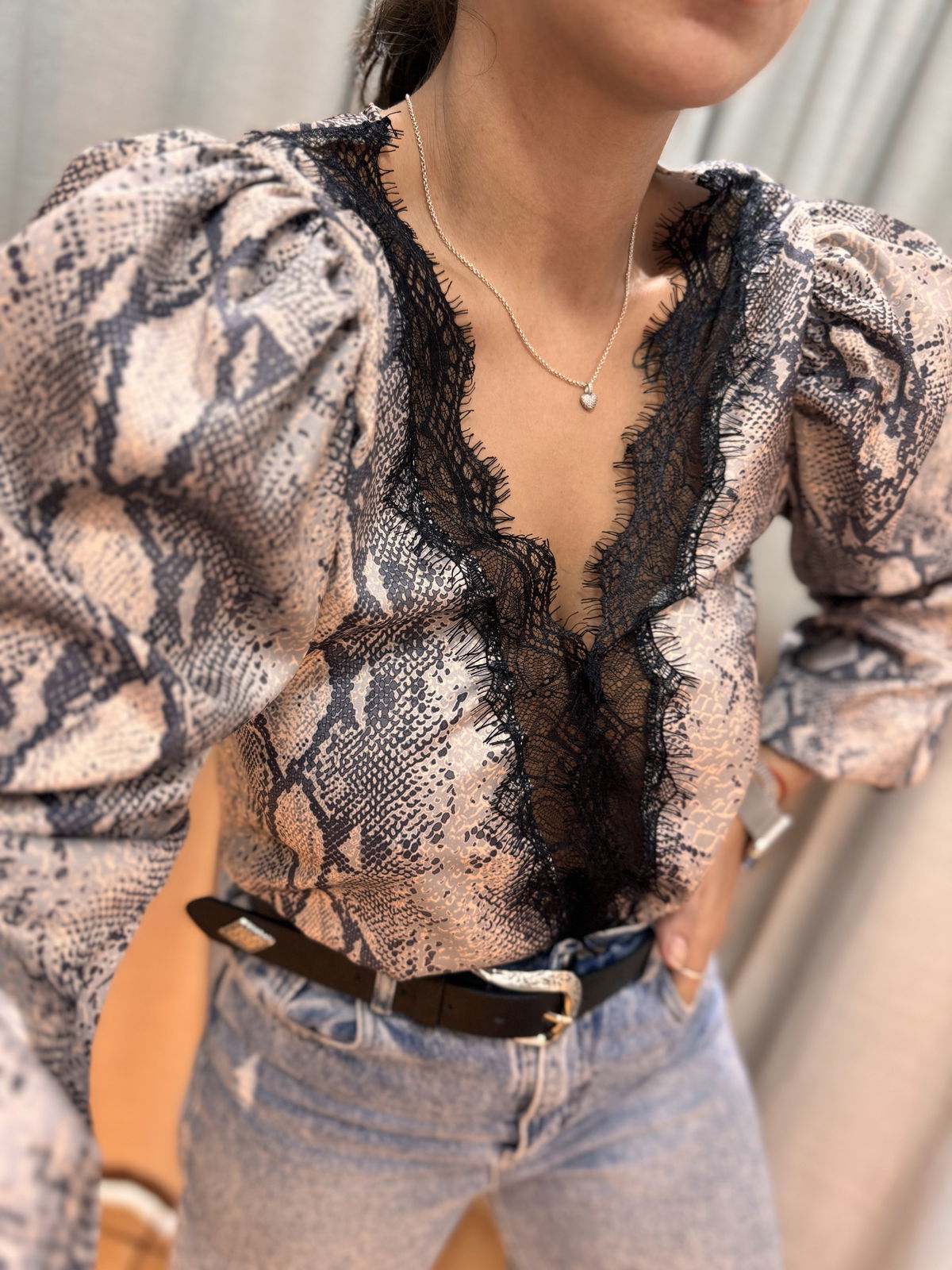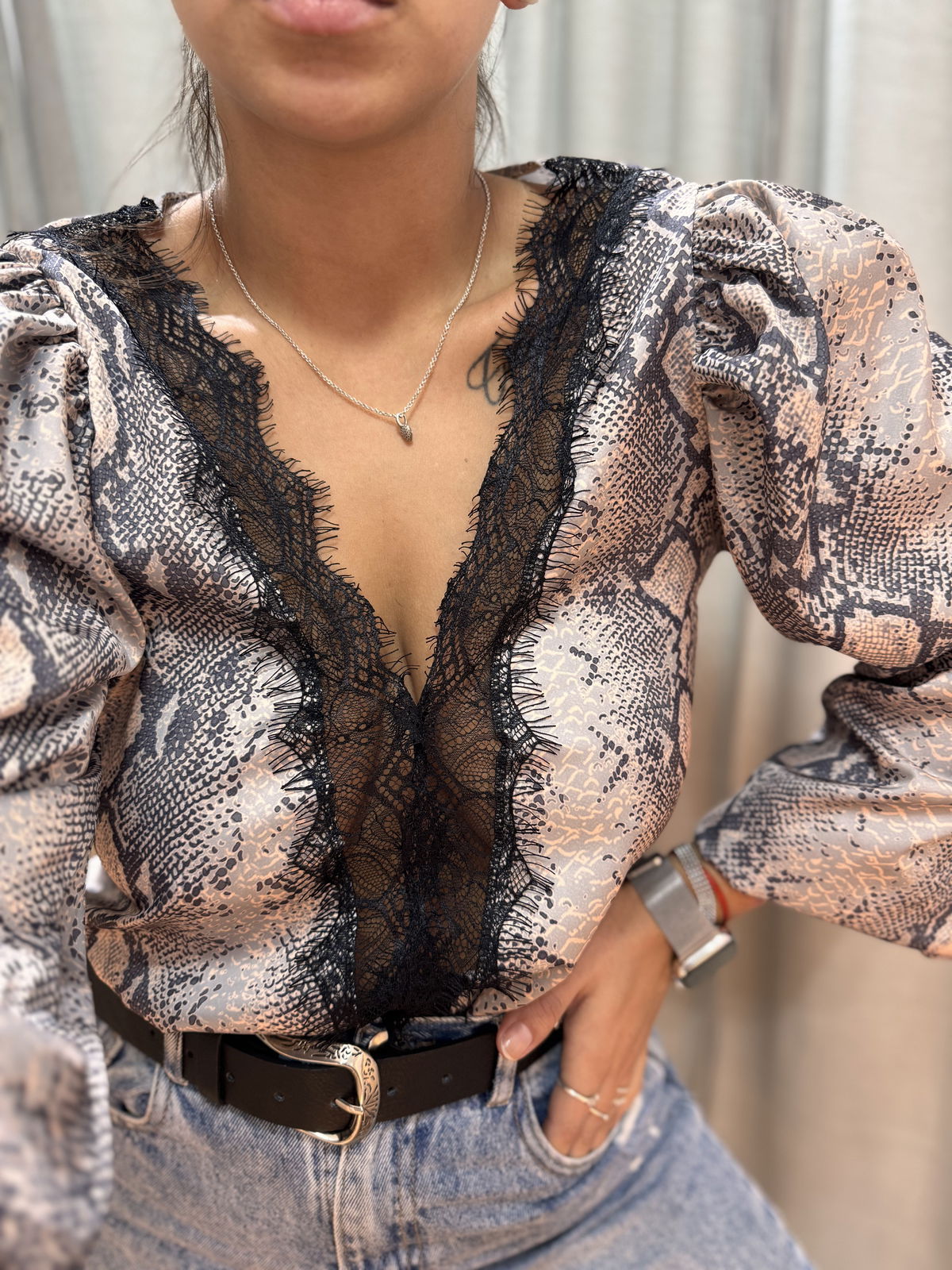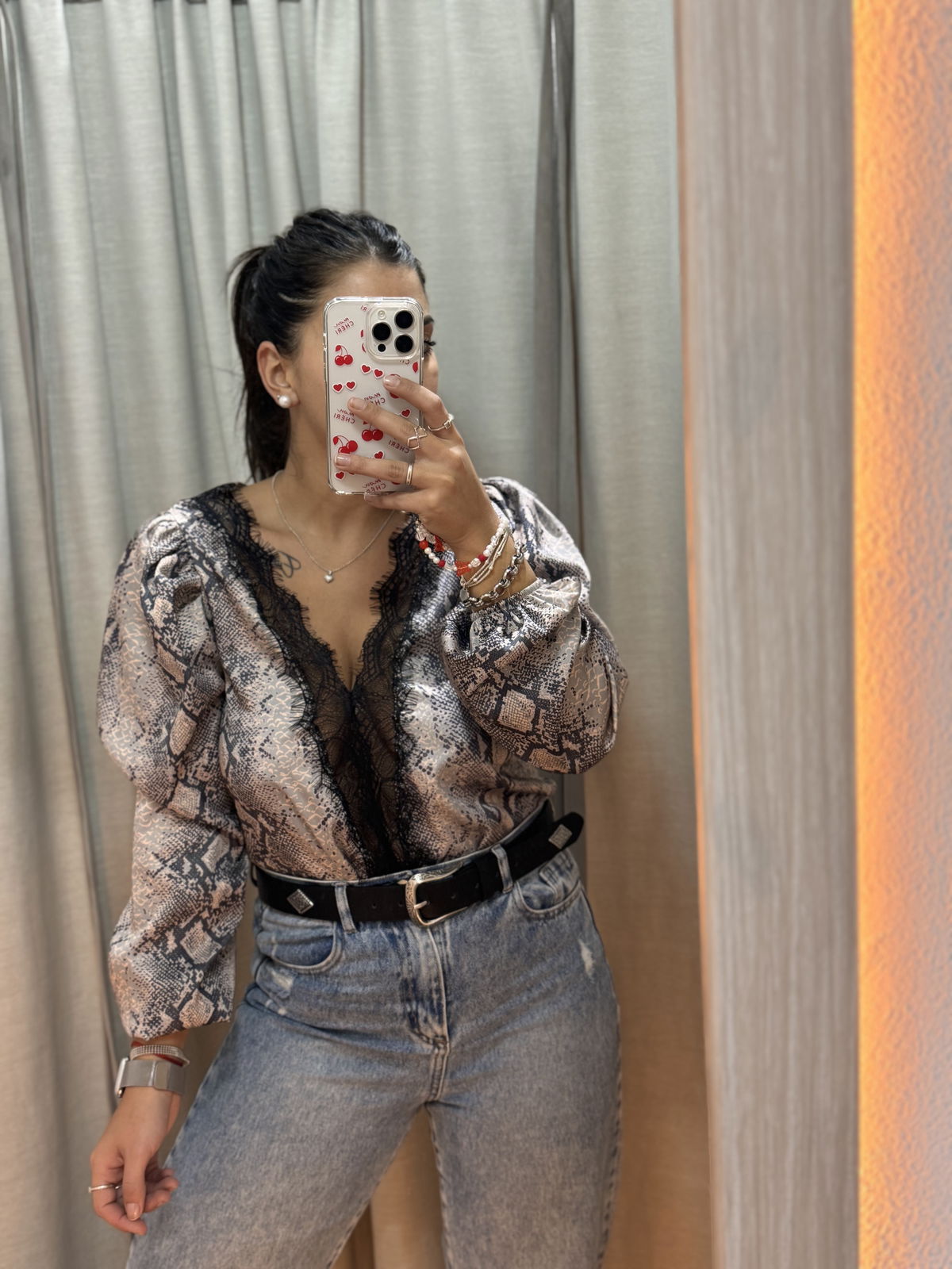 Blusa reptil con puntilla en busto, tiene frunce en puñito. El talle es único, va hasta un 3.