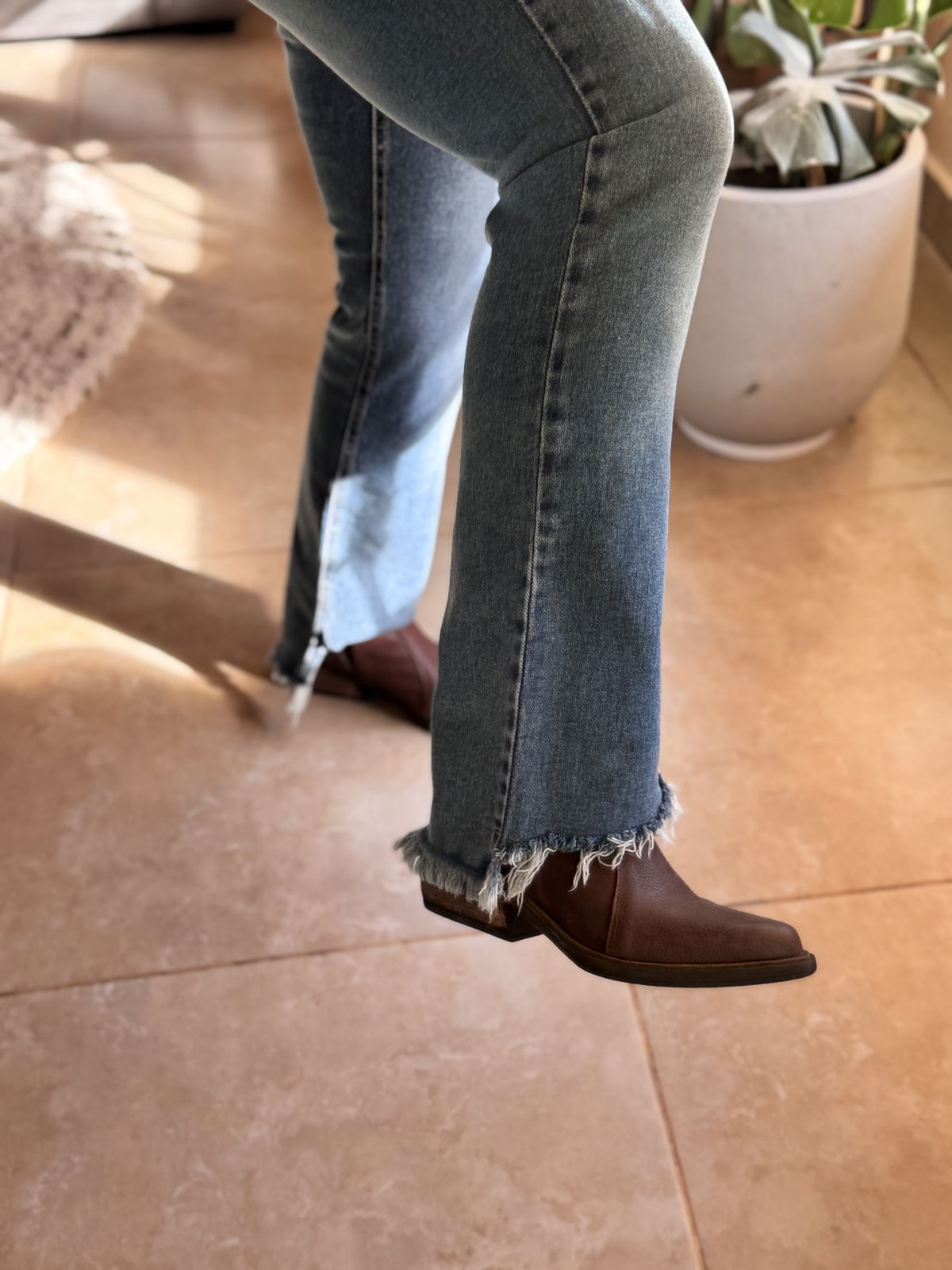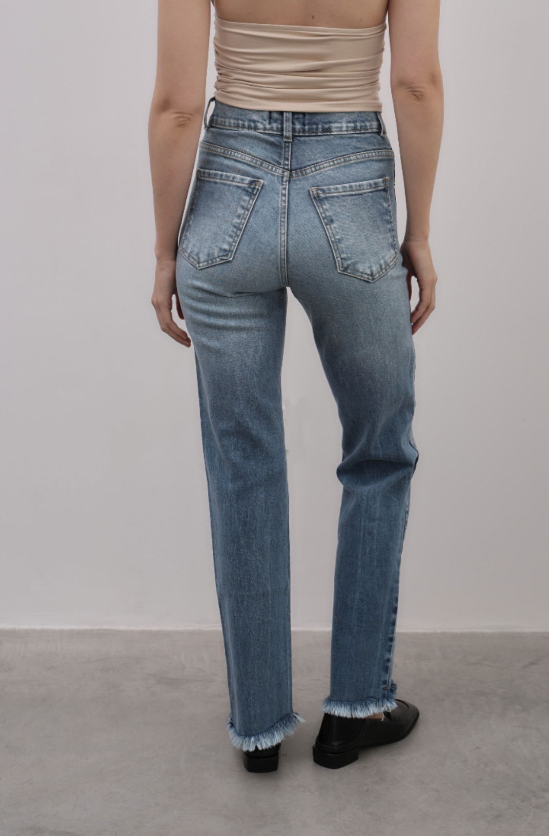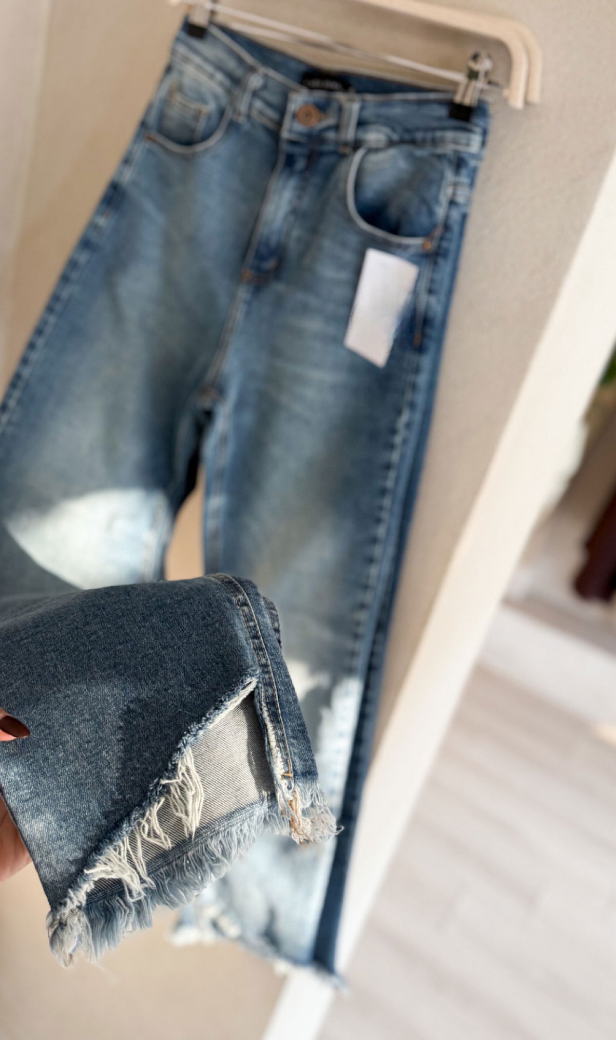 CROPPED BLUE Jean elastizado calce recto cropped, tiro alto. Es color azul vintage con bigotes y localizado. Tiene el ruedo desflecado con forma irregular. Las costuras son color camel y los avíos níquel viejo. La modelo esta usando un talle 36 teniendo de medidas 1,7m de altura 65,5cm de cintura 92,5cm de cadera