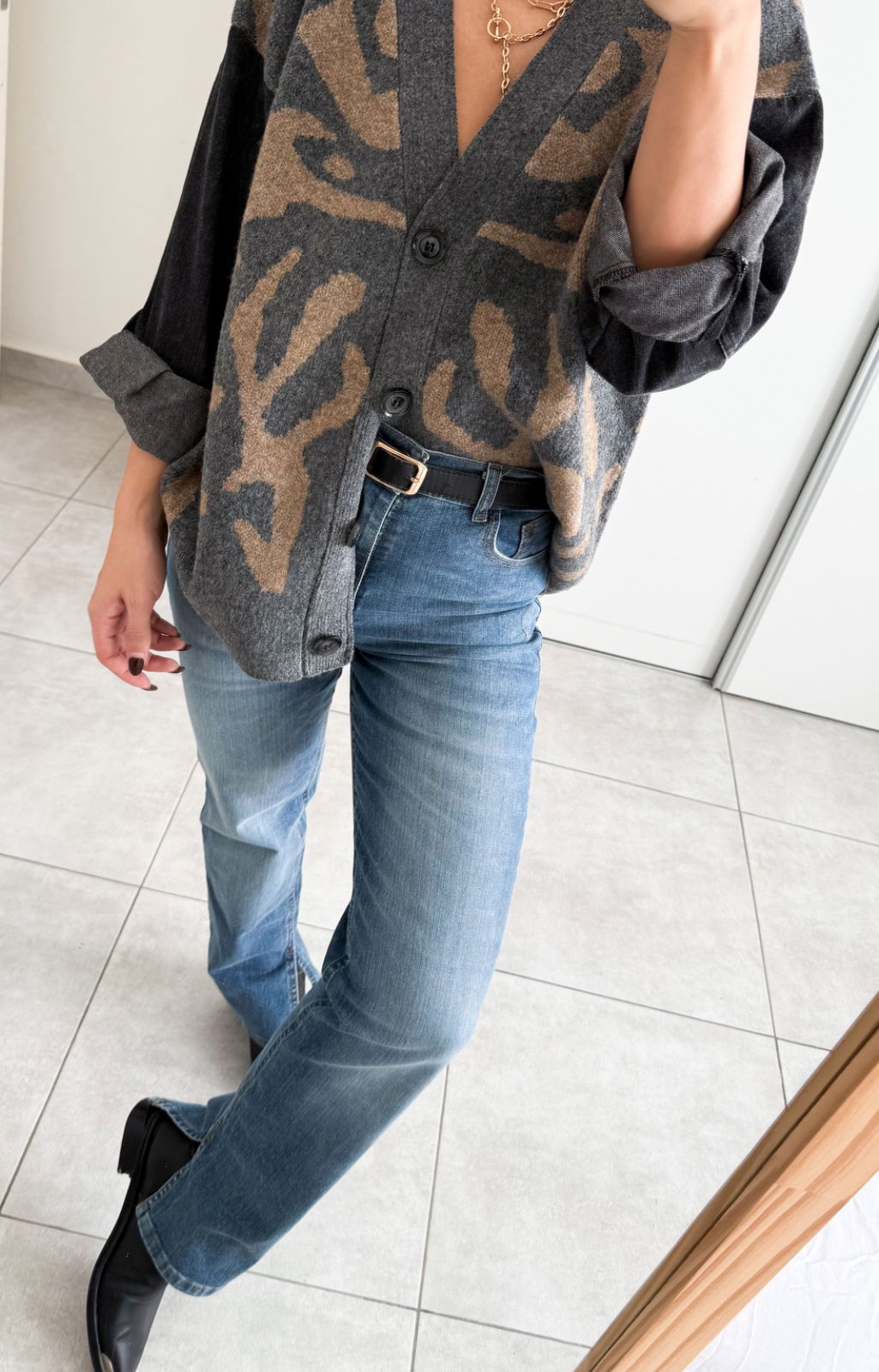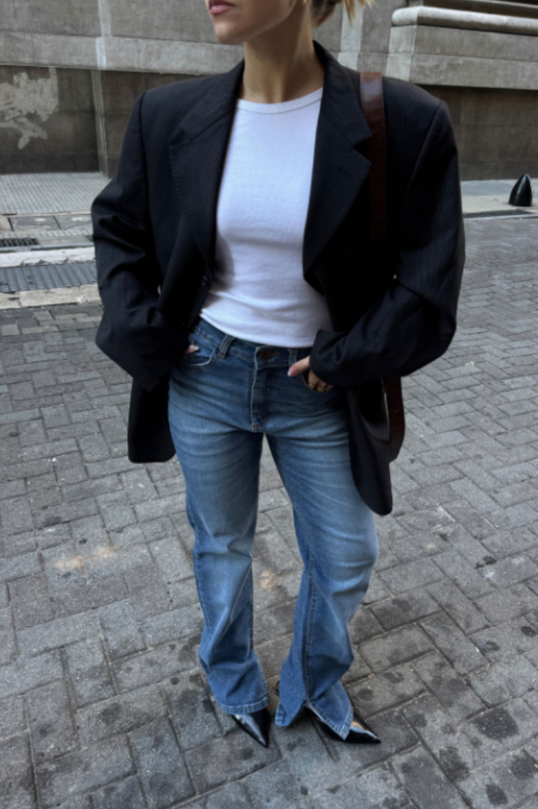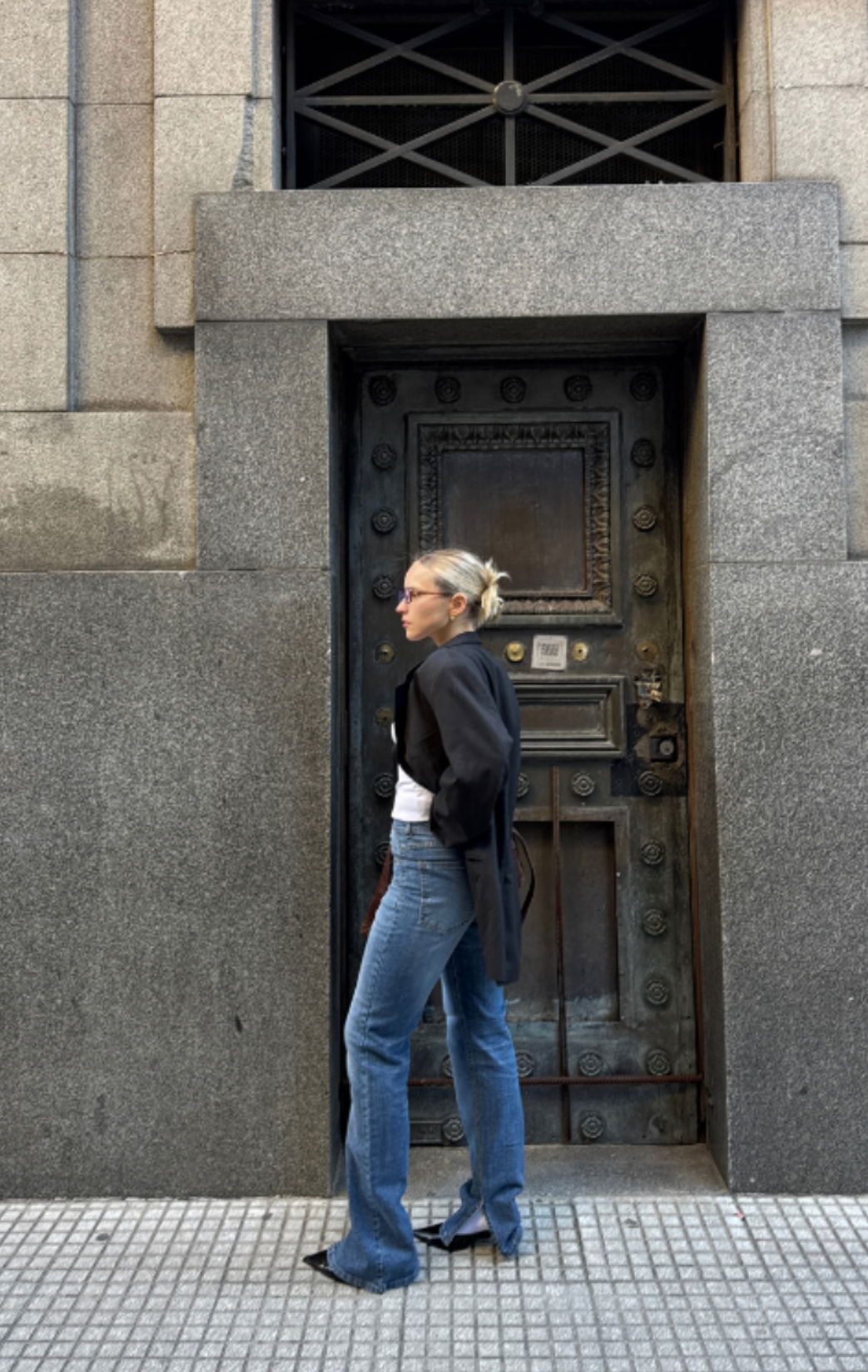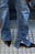 Jean elastizado calce recto, tiro alto. Es color azul clásico con bigotes y localizado intensos. Tiene tajo en el lado interno de la botamanga, las costuras color camel, los avíos cobre florentino y el ruedo clásico.