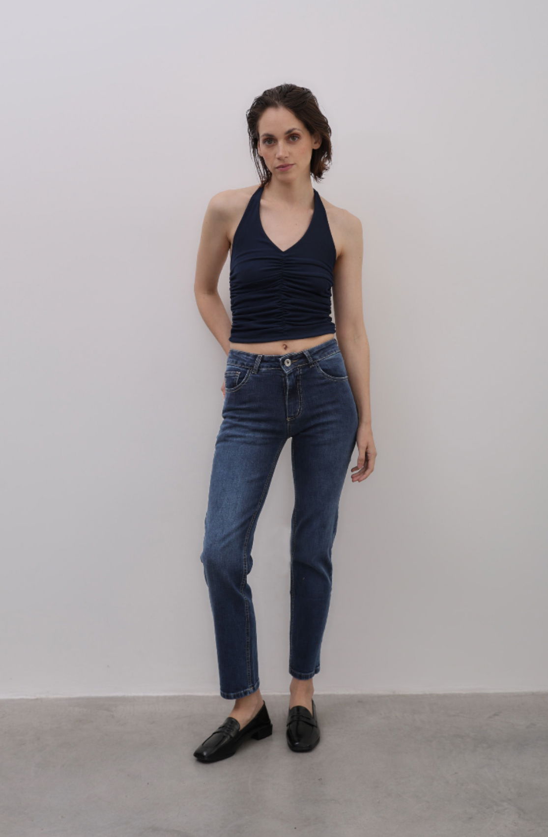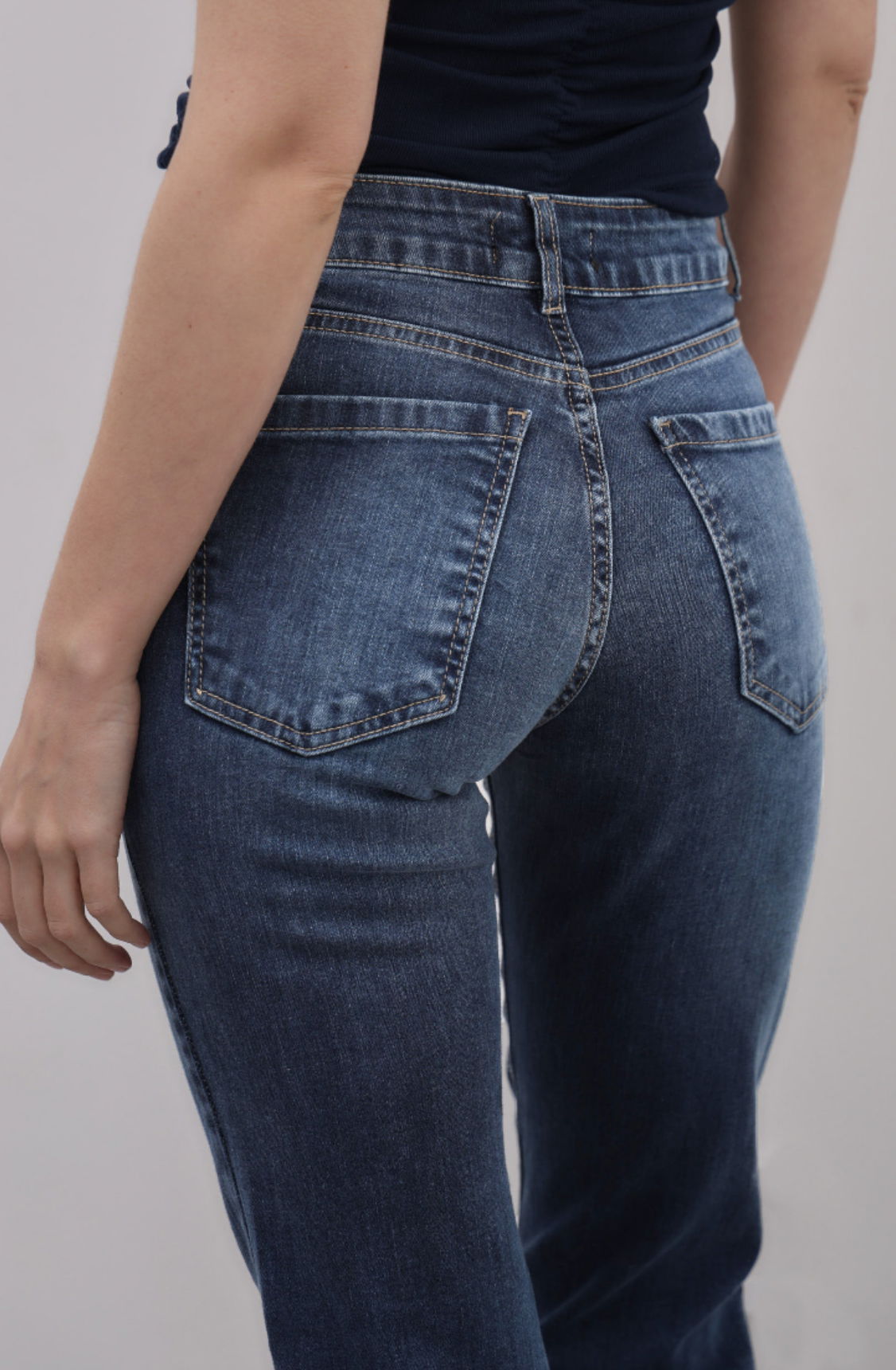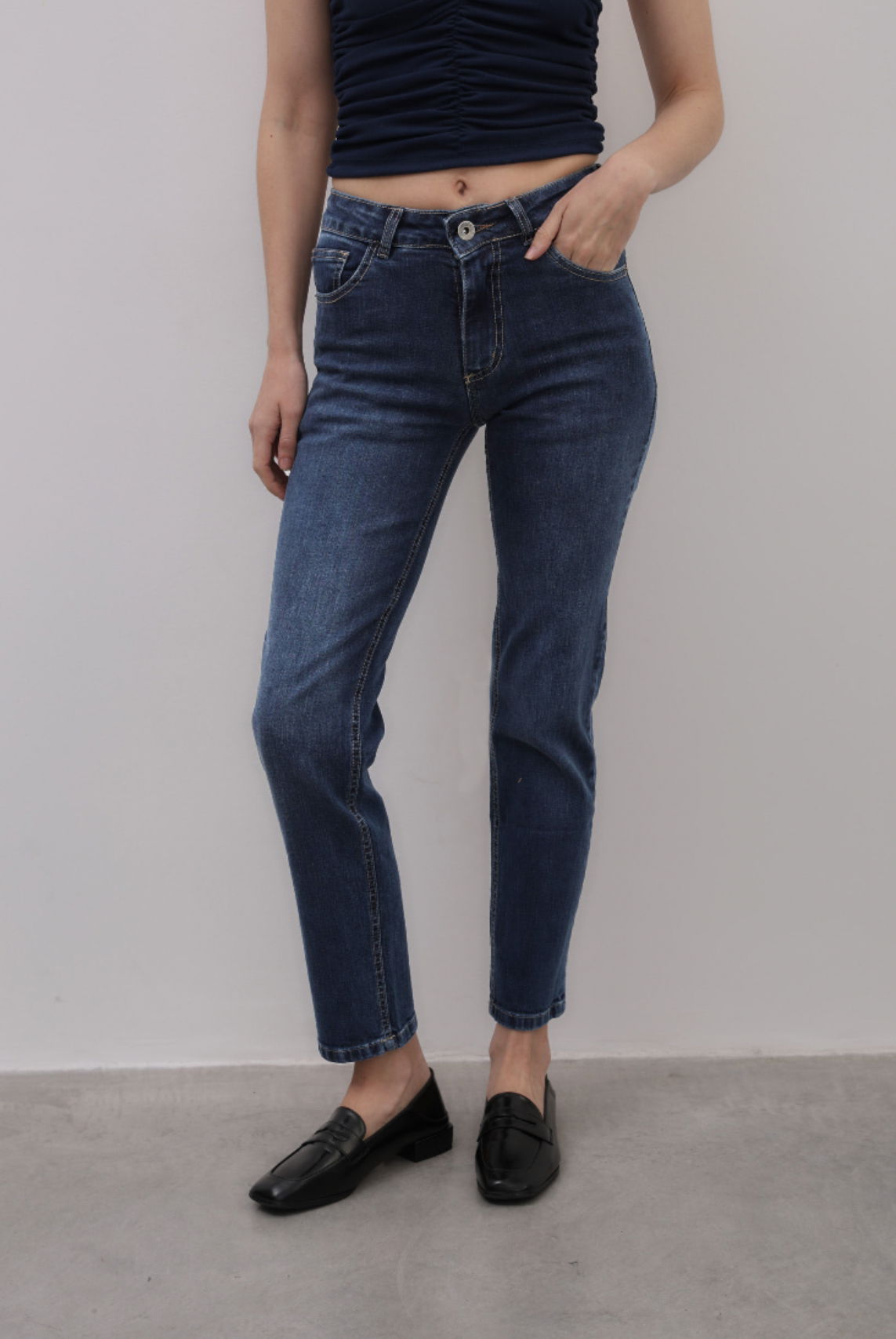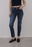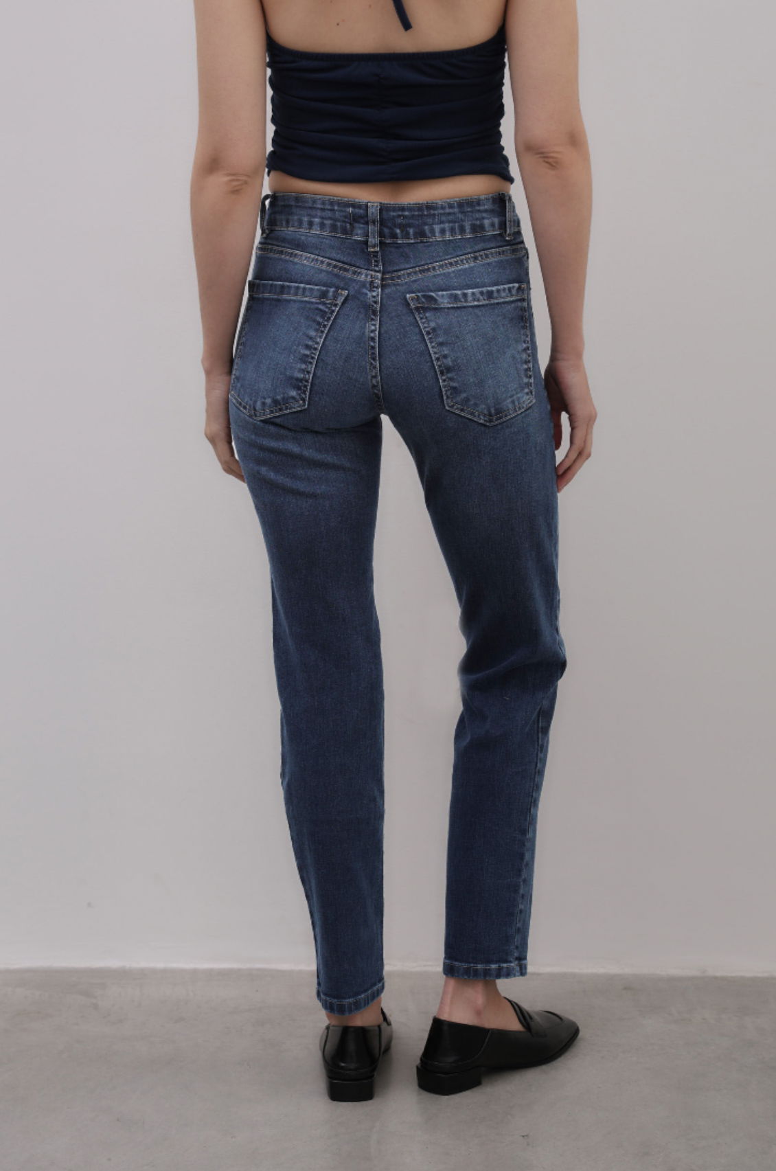 MOMO MID BLUE Jean elastizado calce mom con pierna slim tiro medio - alto . Es color azul oscuro con gastado intenso y localizado. Tiene las costuras color camel claro, los avíos níquel viejo y el ruedo clásico. La modelo esta usando un talle 36 teniendo de medidas 1,7m de altura 65,5cm de cintura 92,5cm de cadera