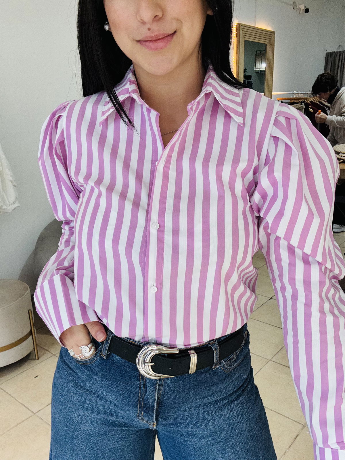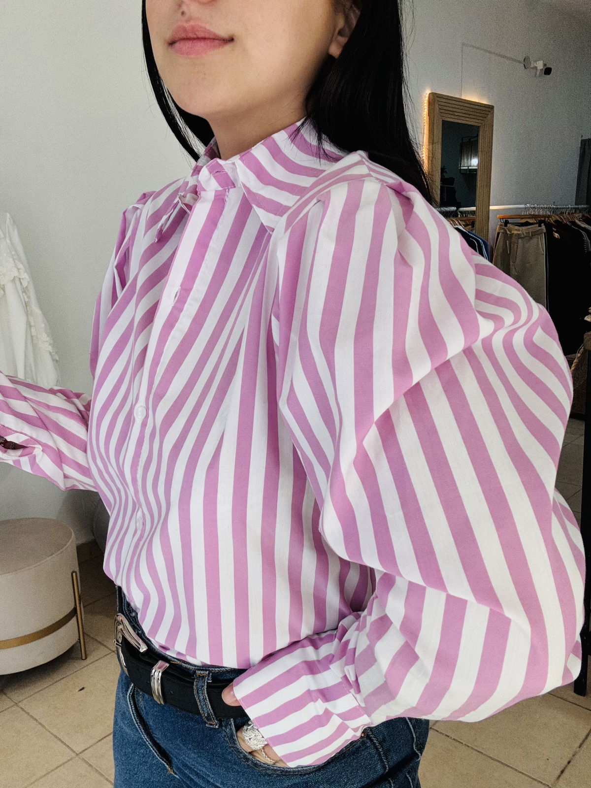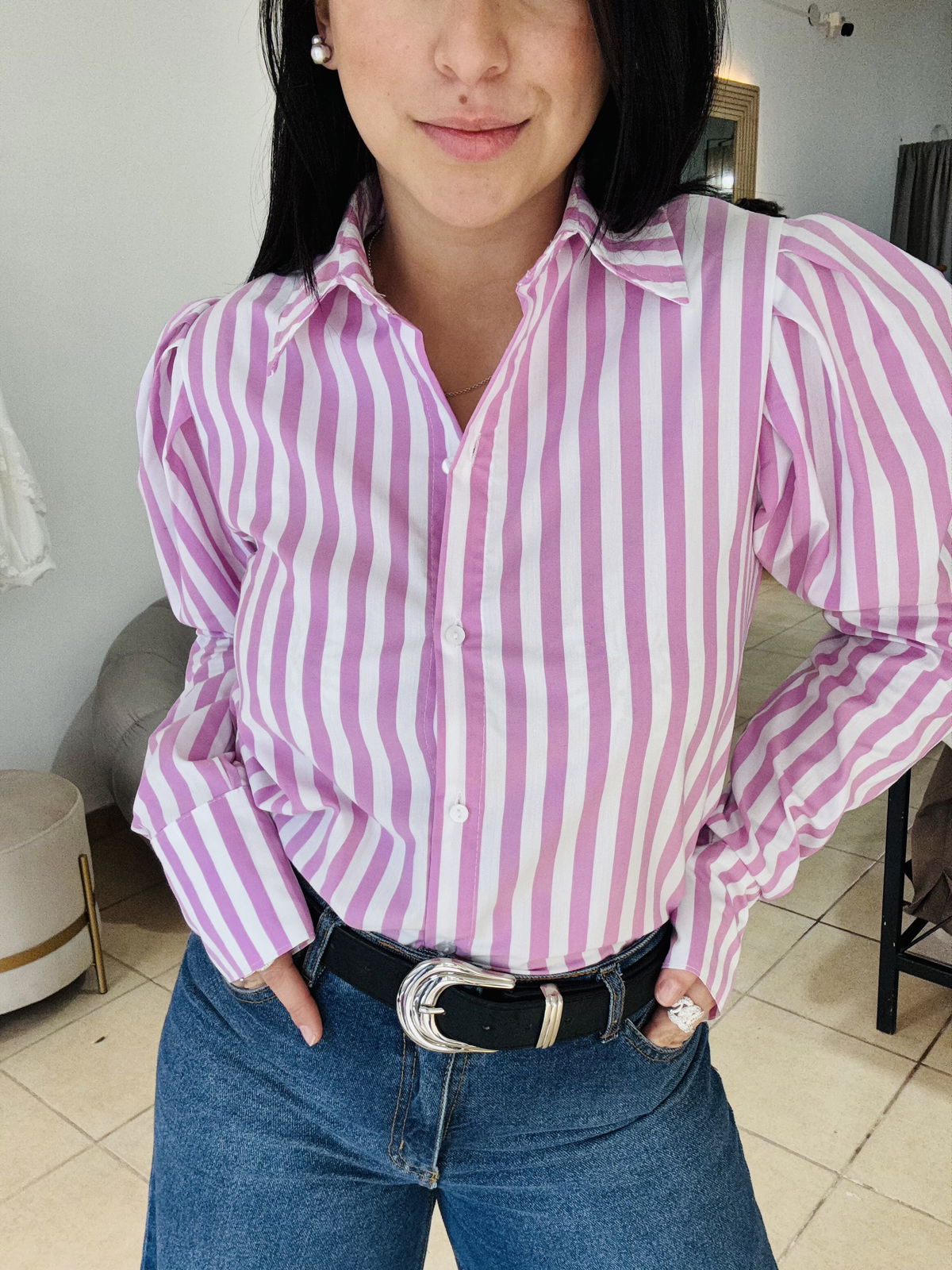 Camisa de poplin manga princesa a rayas, la tela es elastizada y tiene un largo intermedio.