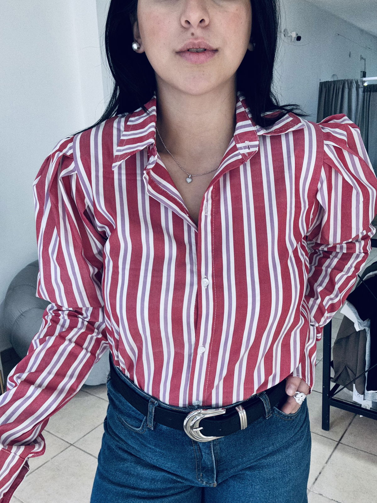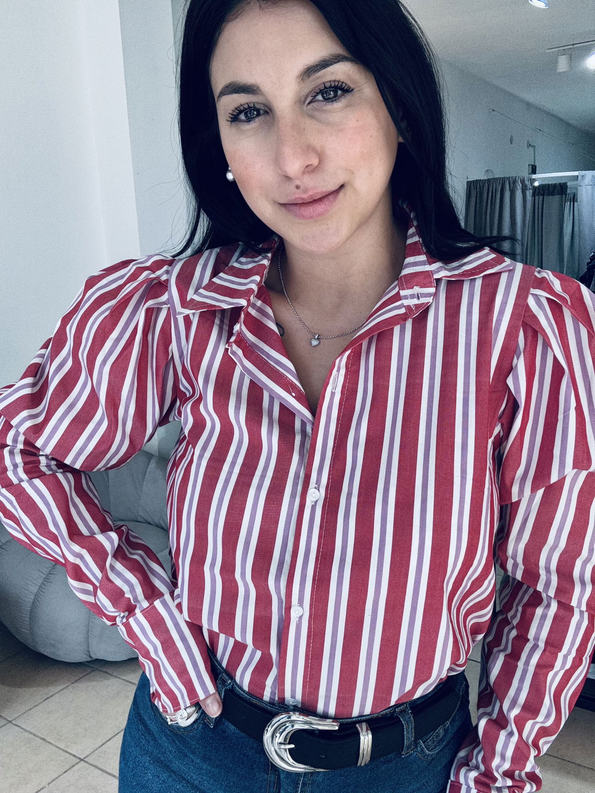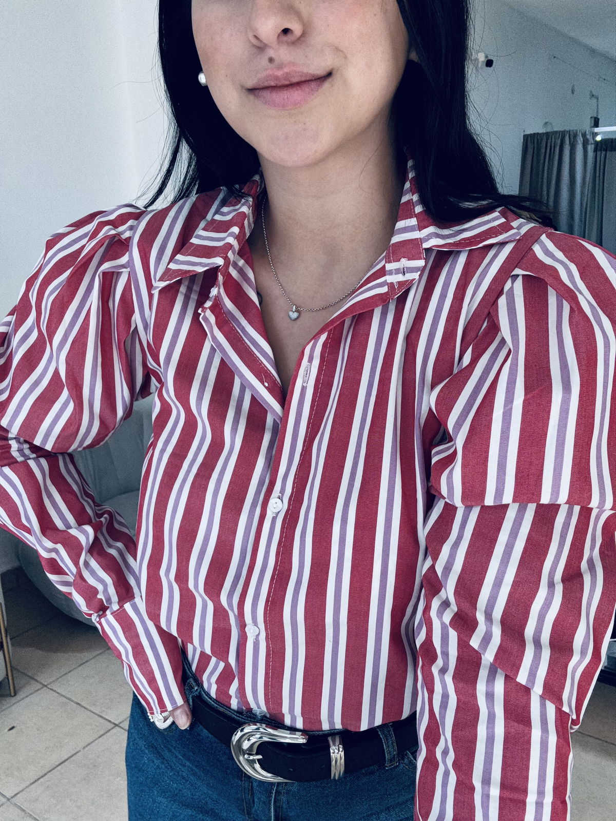 Camisa de poplin manga princesa a rayas, la tela es elastizada y tiene un largo intermedio.