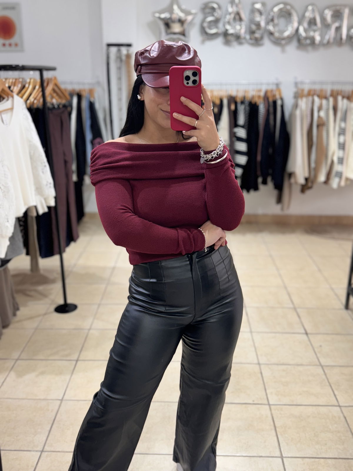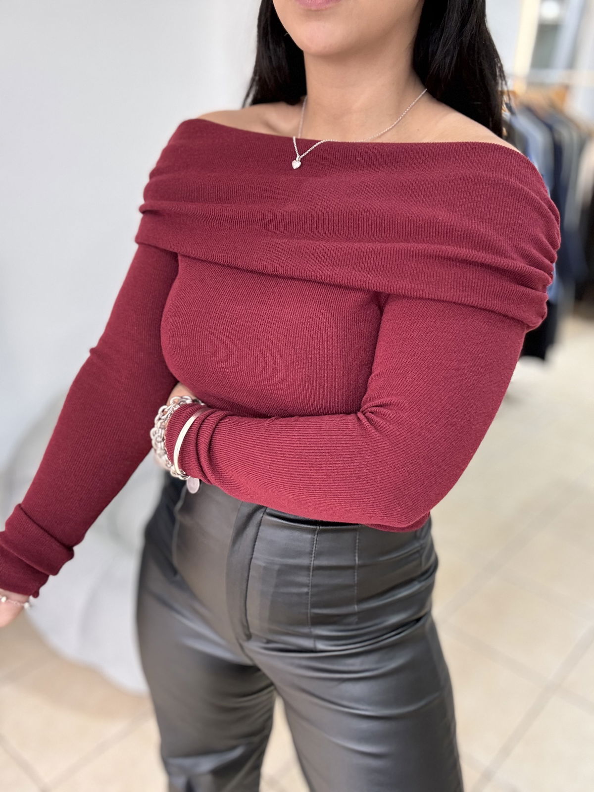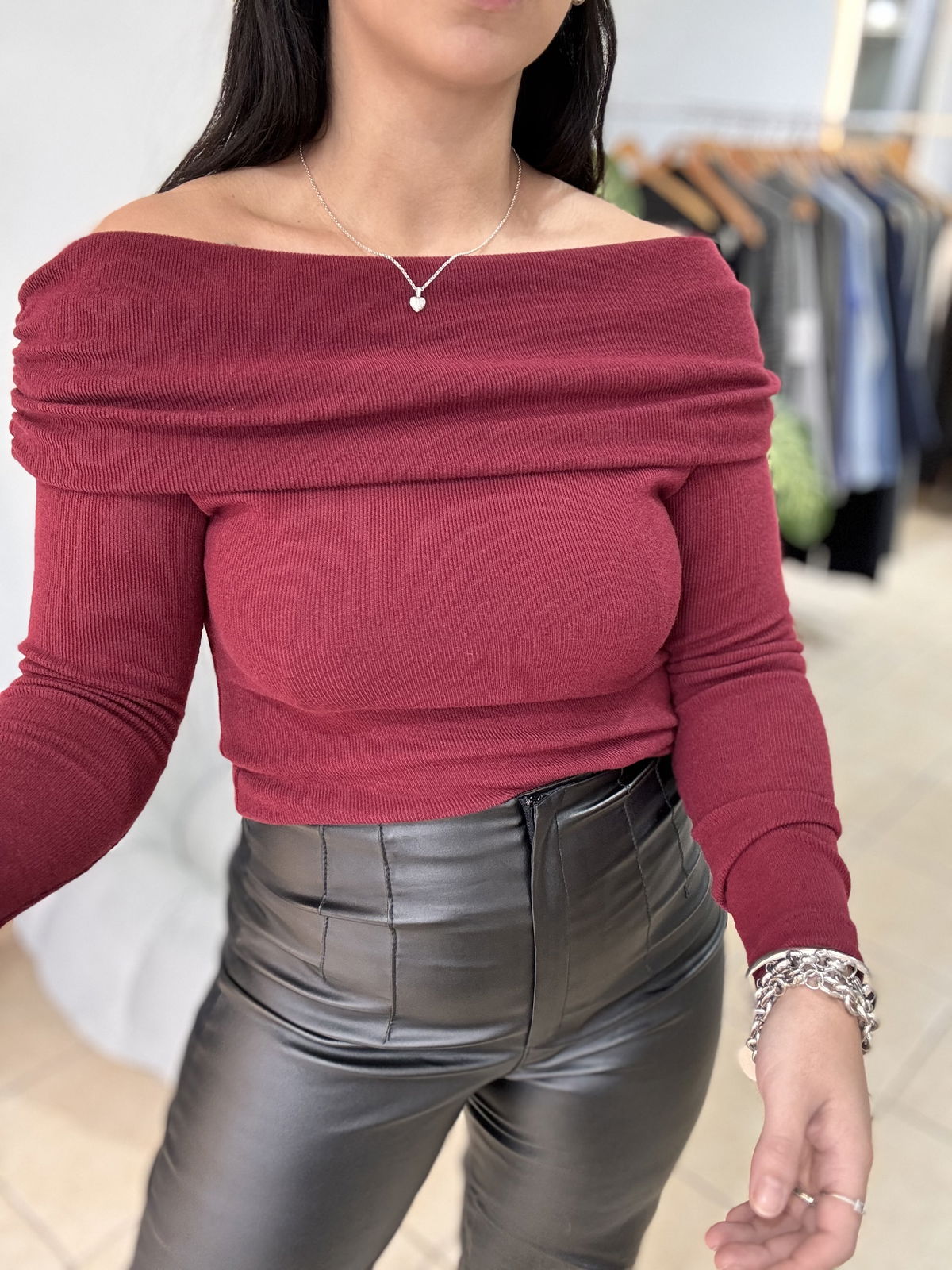 Top de lanilla cuello bote, la tela es súper elastizada. No es muy larga