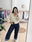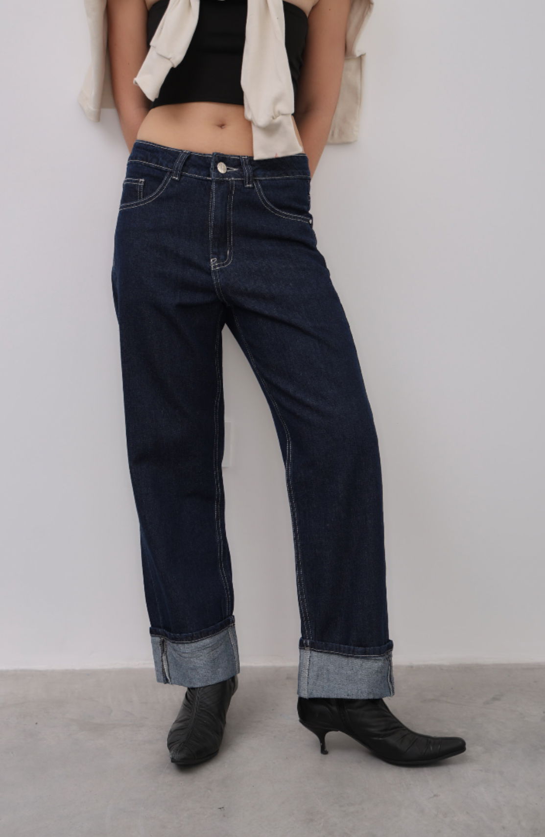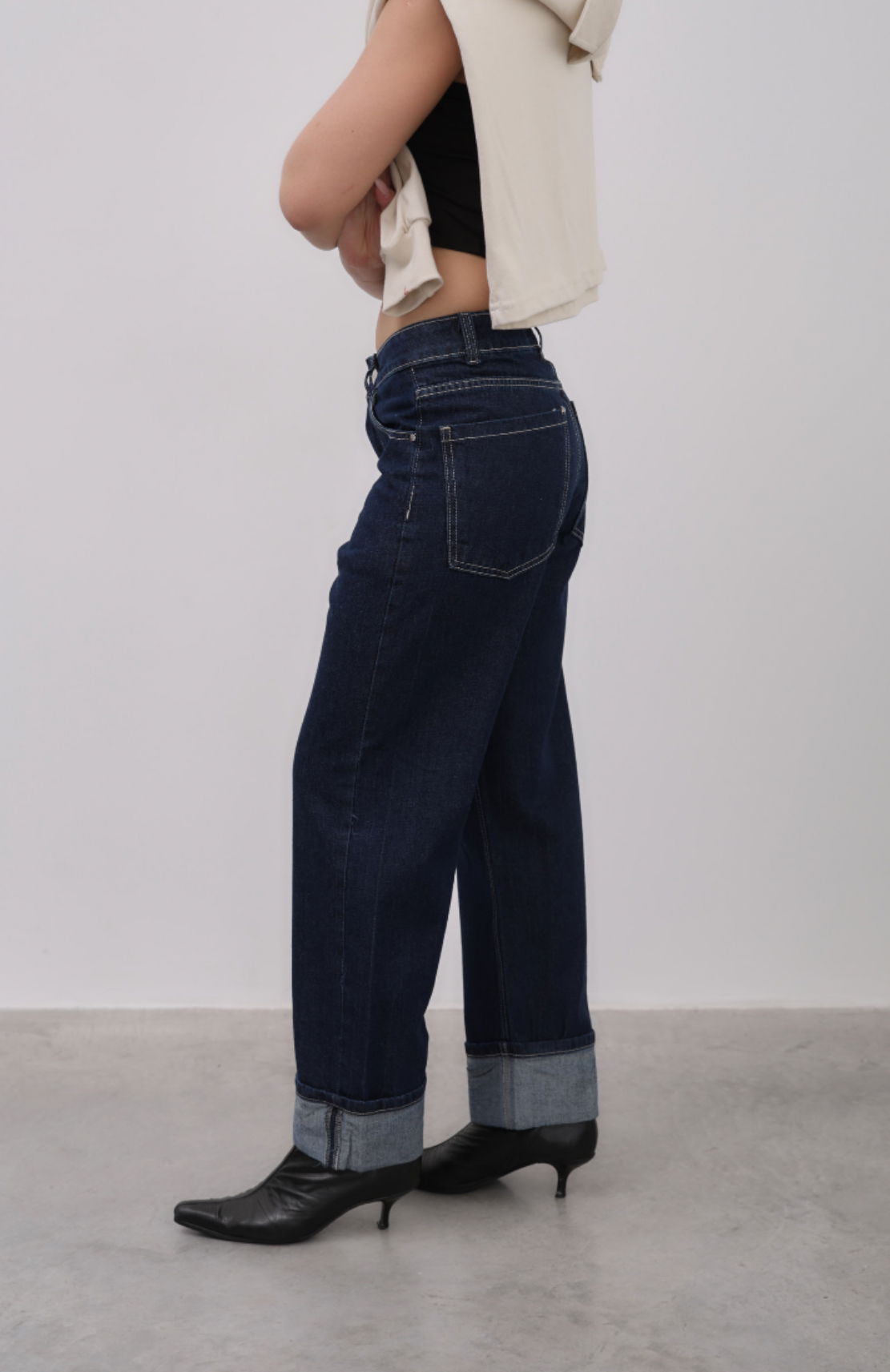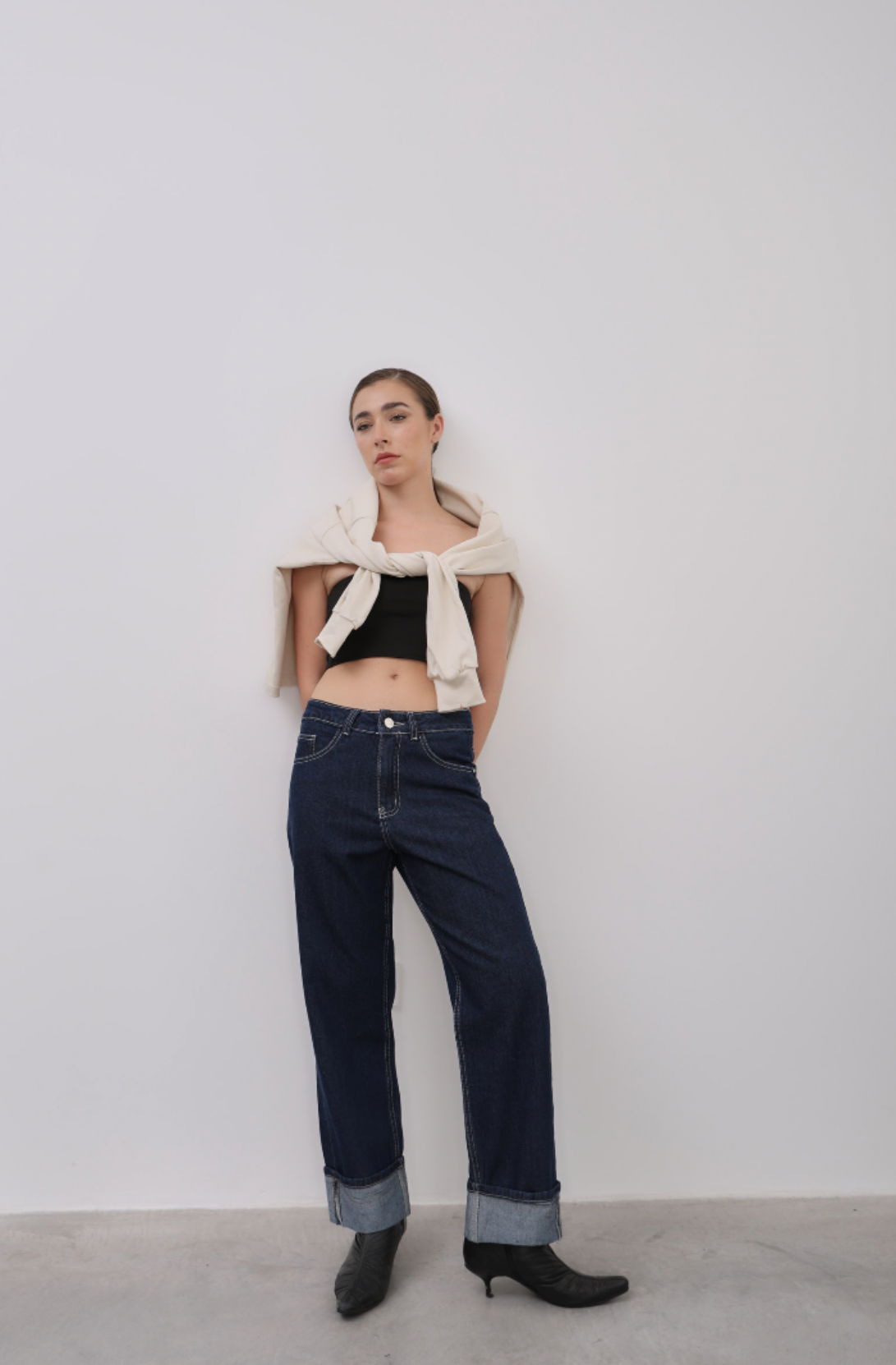 STRAIGHT DARK BLUE Jean rígido calce recto, tiro alto con largo hasta el tobillo. Es color azul oscuro brillante con leve gastado. Tiene las costuras color marfil, los avíos níquel brillante y, como detalle de tendencia, el ruedo dobladillado con las costuras abiertas.