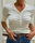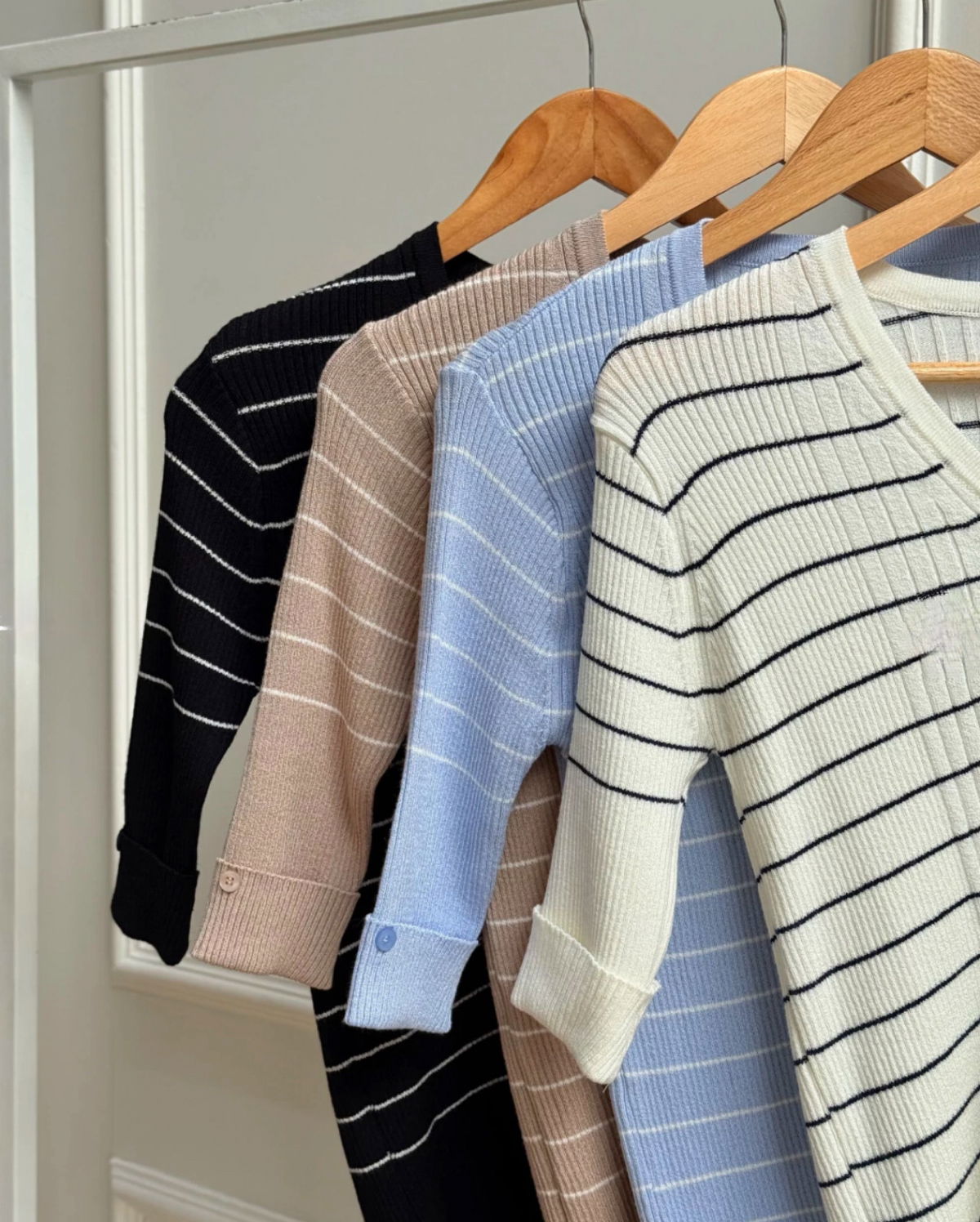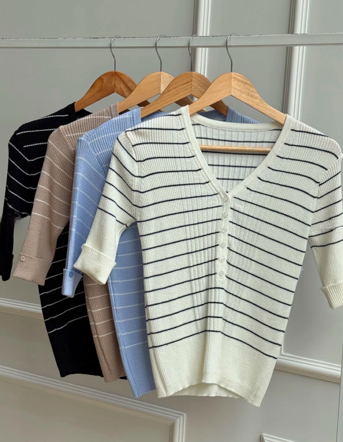 Remera de hilo de bremer rayado manga 3/4, con botones que podes desbrochar. El modelo es bastante amplio y se puede meter por debajo del pantalón