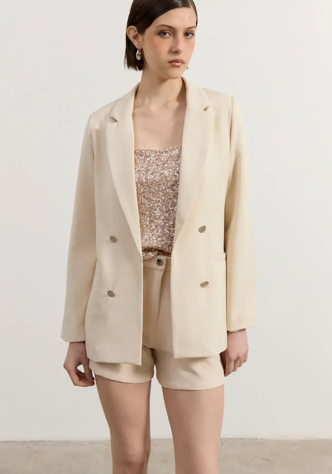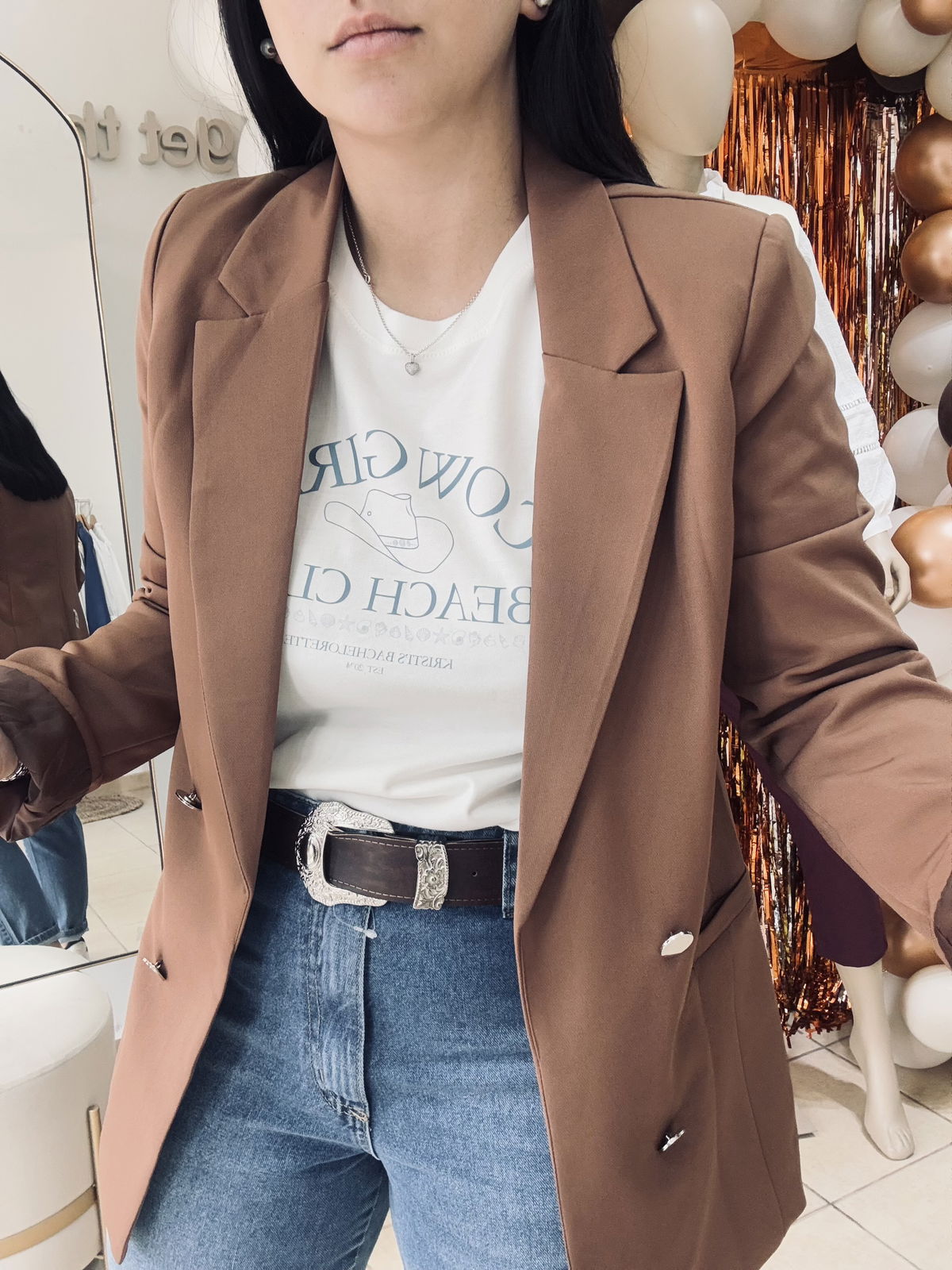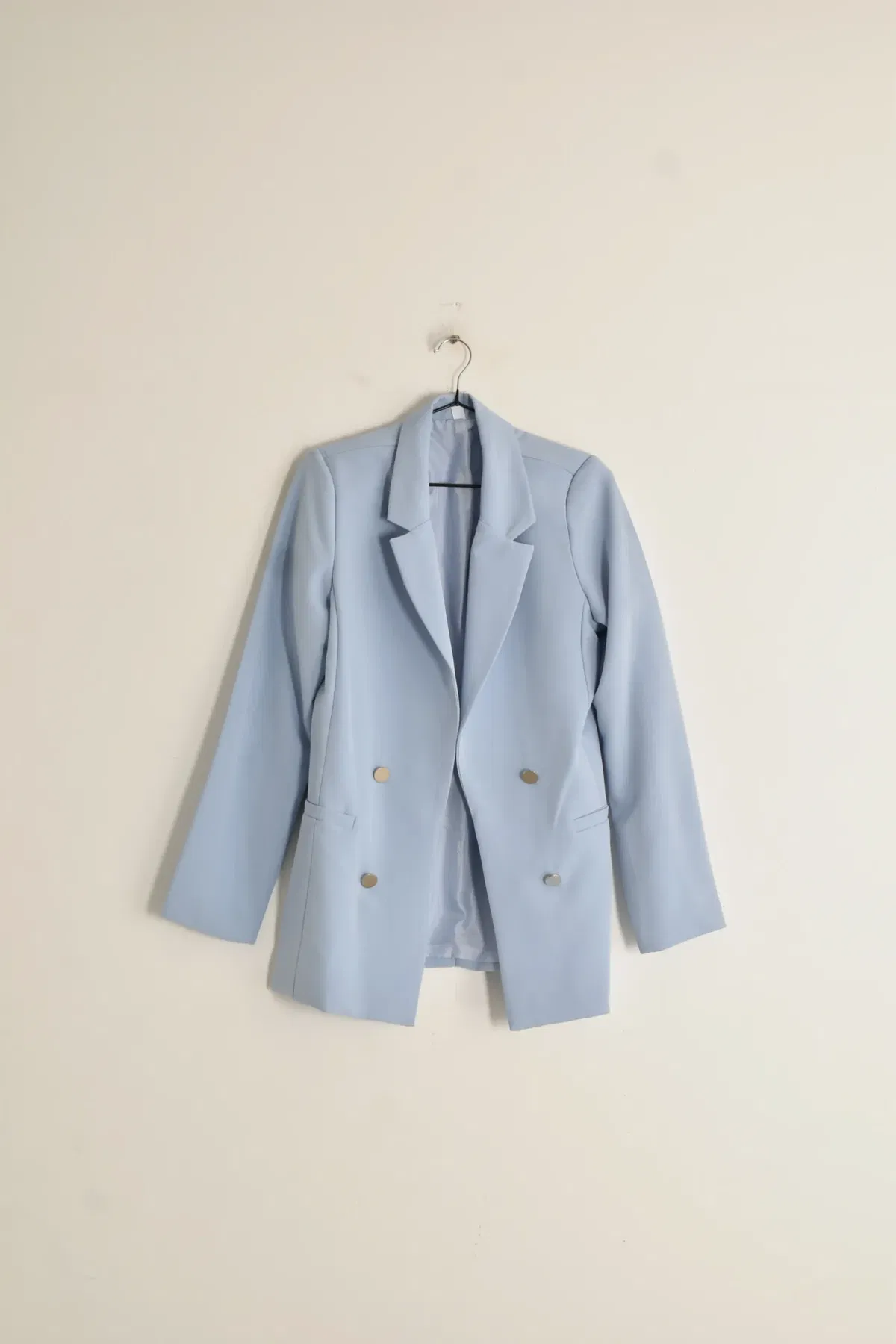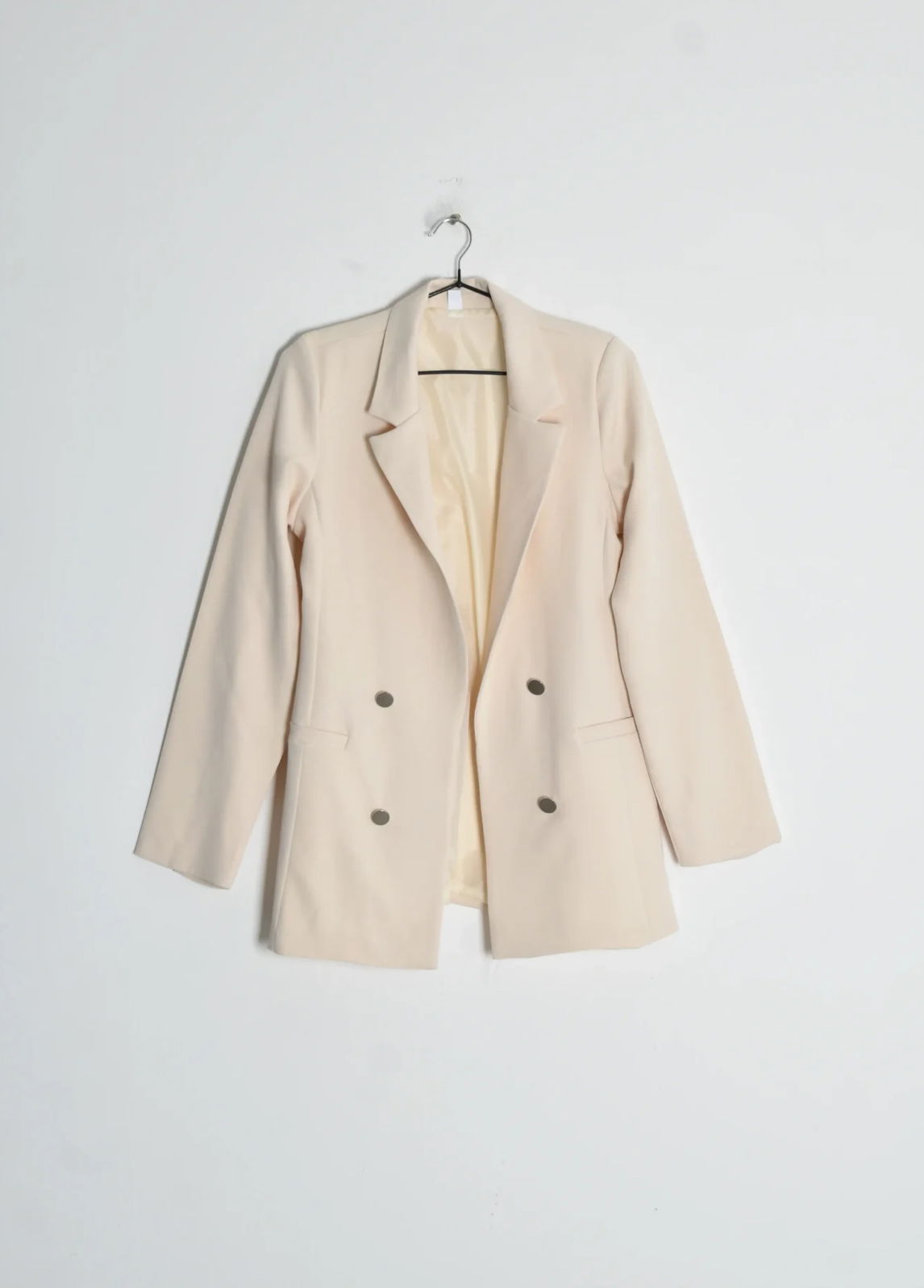 Blazer entallado largo con forreria y botones peltre, no tiene ojales para cerrar. Te recomendamos llevar uno más del que usemos! Lau está usando el talle 42 (L)