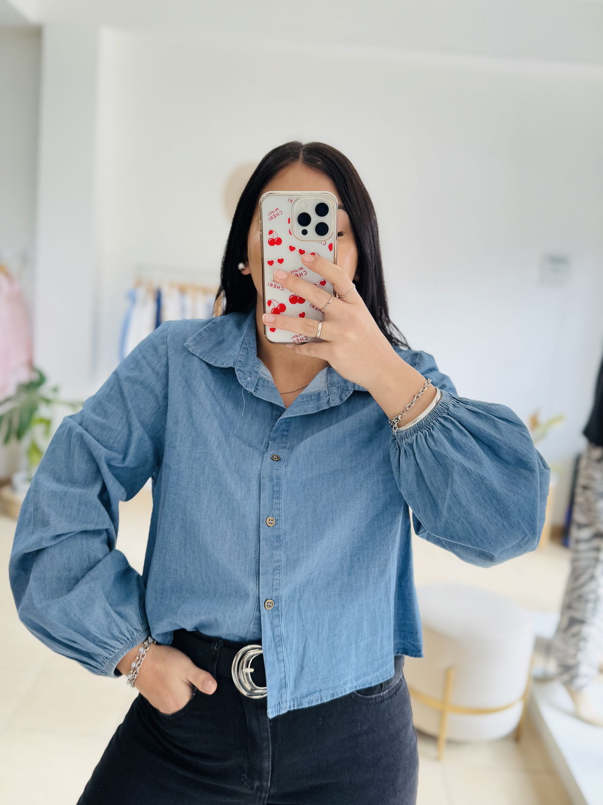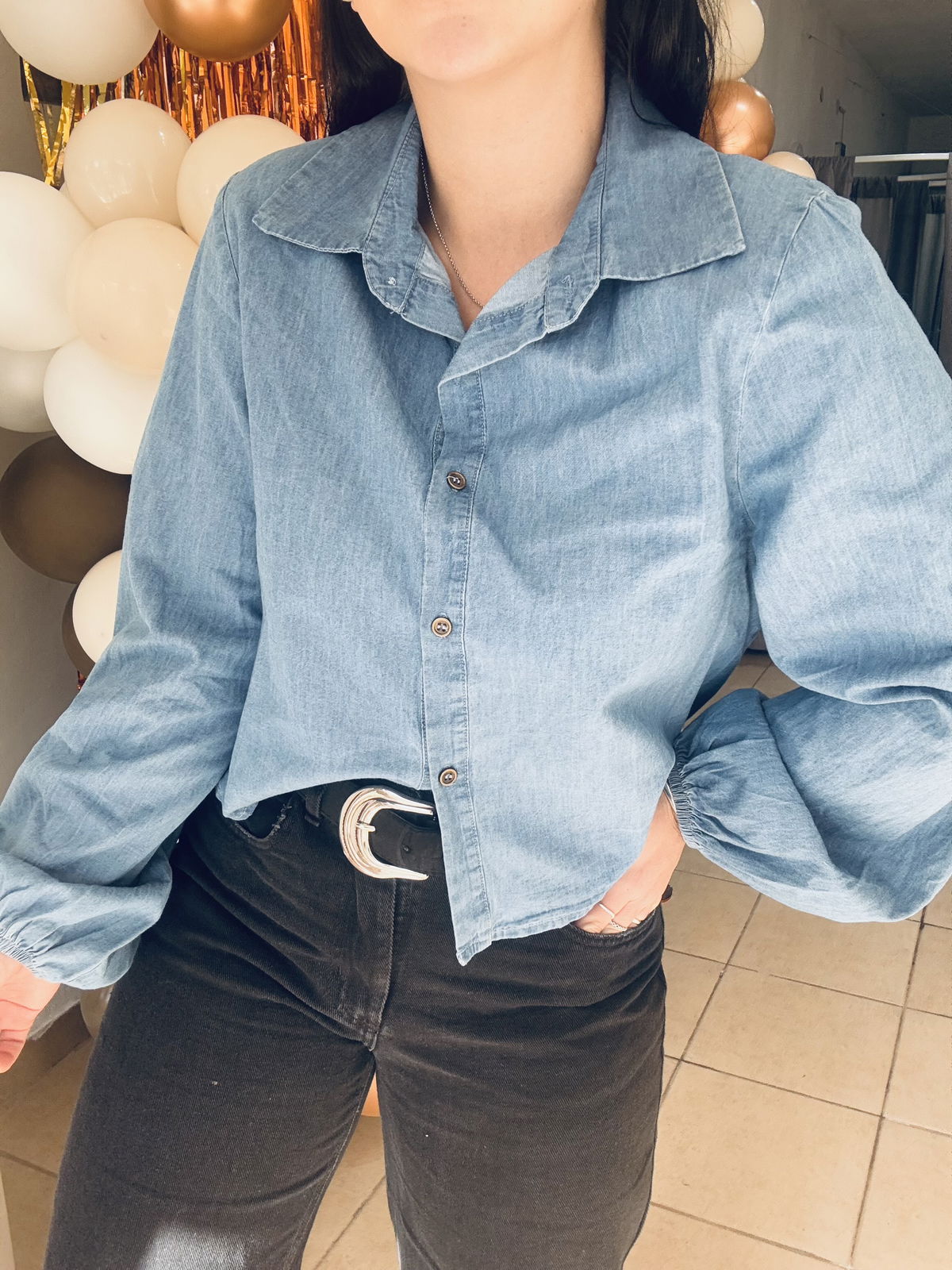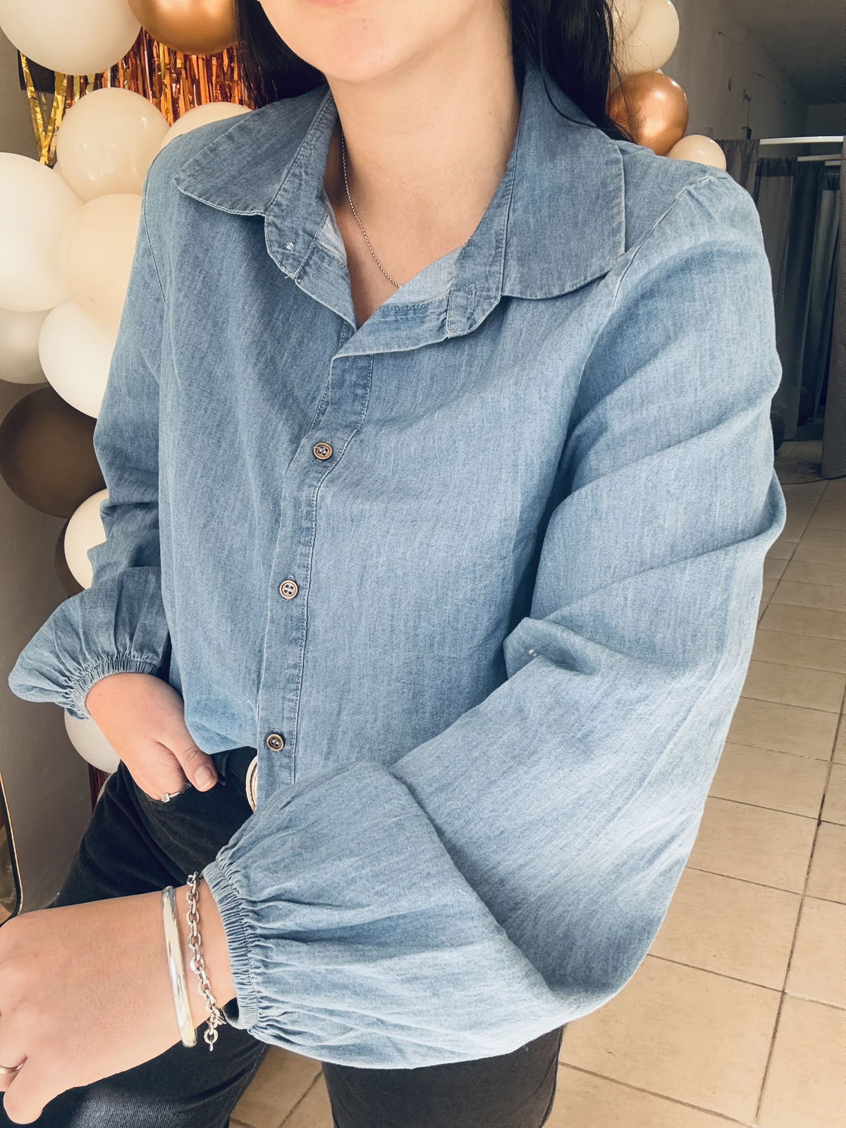 Camisa simil denim con manga globo, super liviana y fresca, la tela es super blandita.