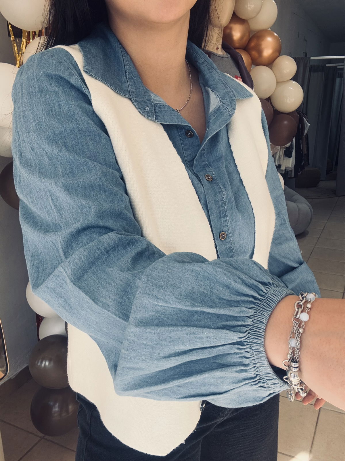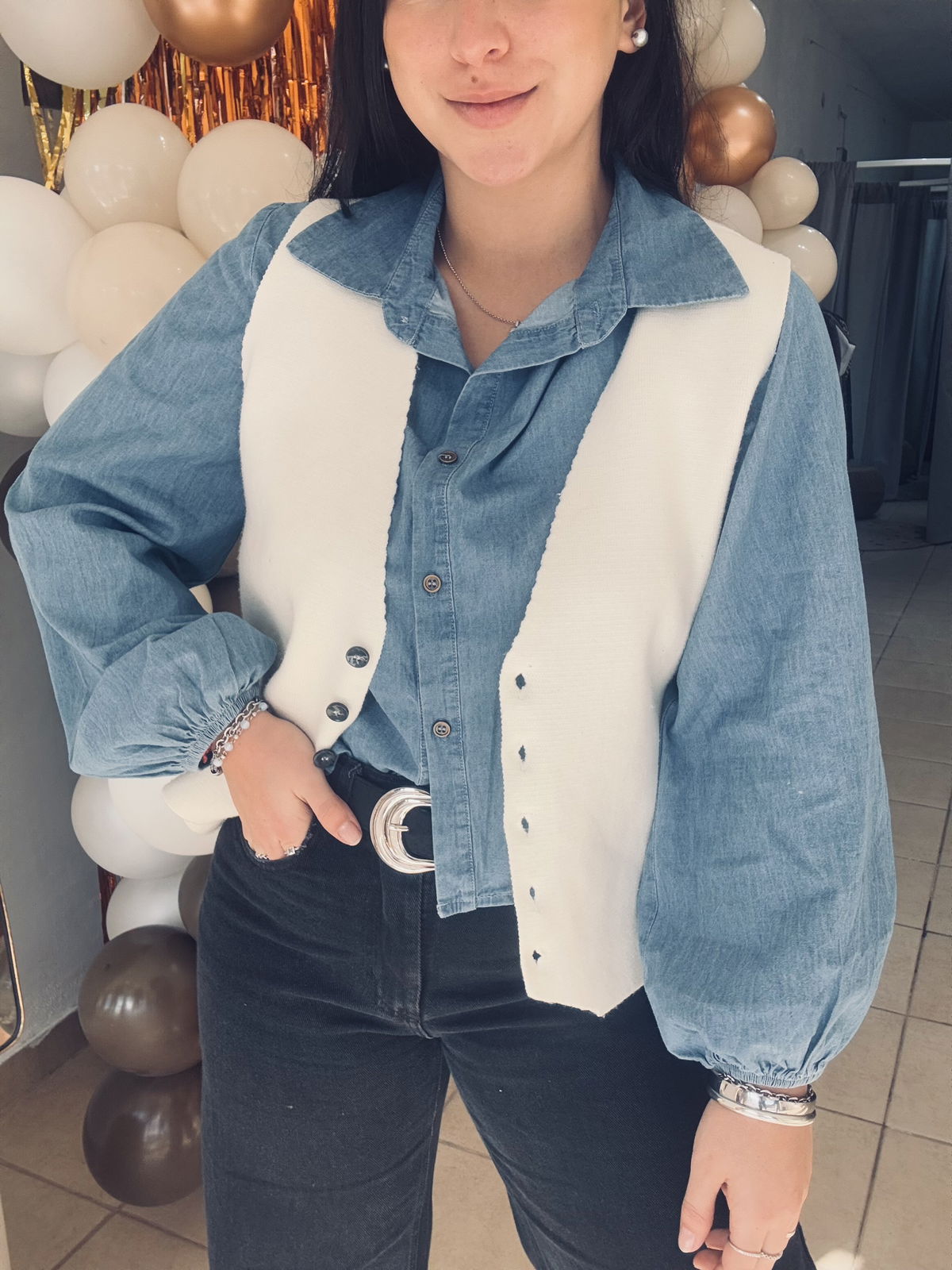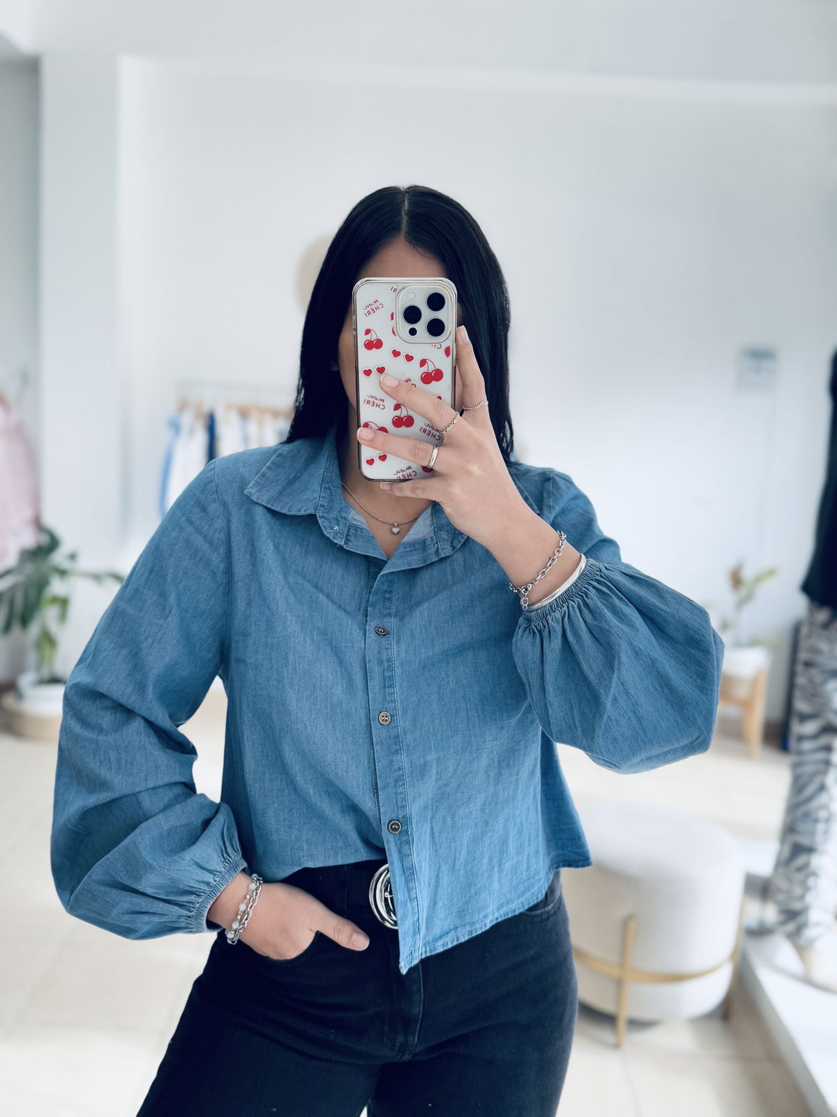 Camisa simil denim con manga globo, super liviana y fresca, la tela es super blandita.