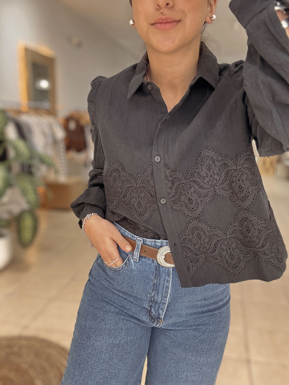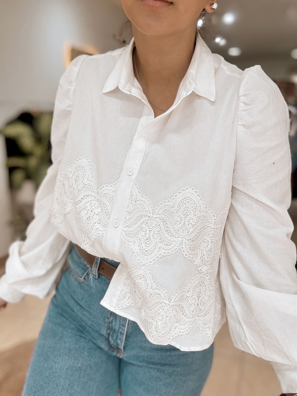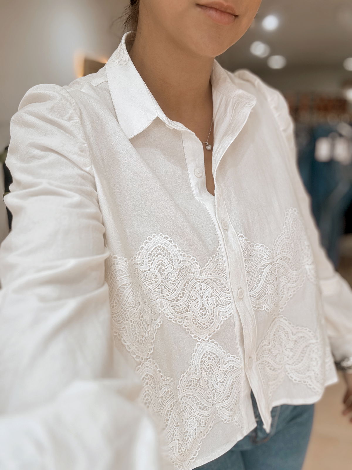 Camisa de lino premium con manga princesa, bordado en la parte inferior. Estilo romántico y fino.