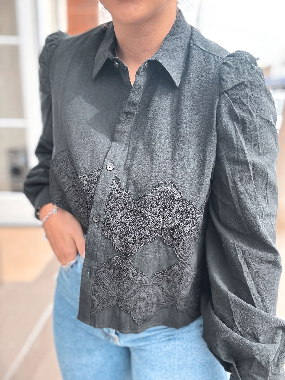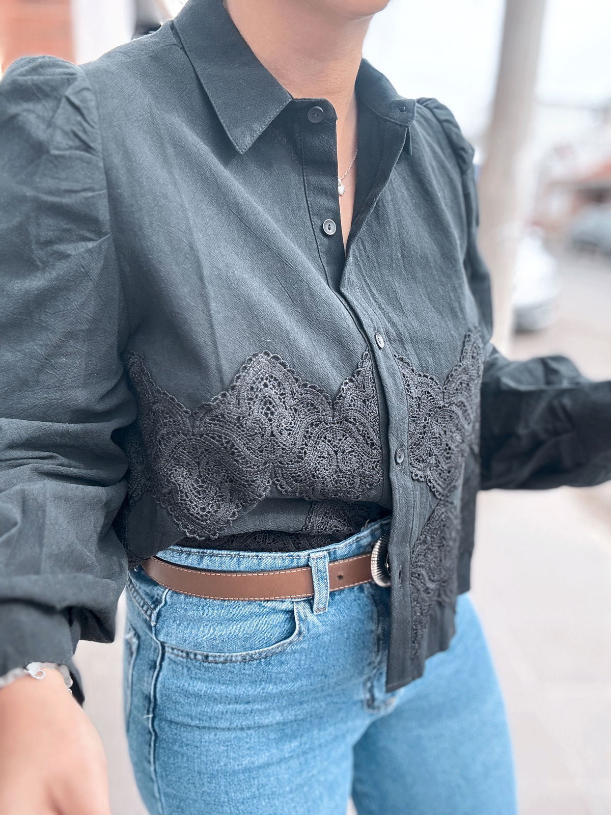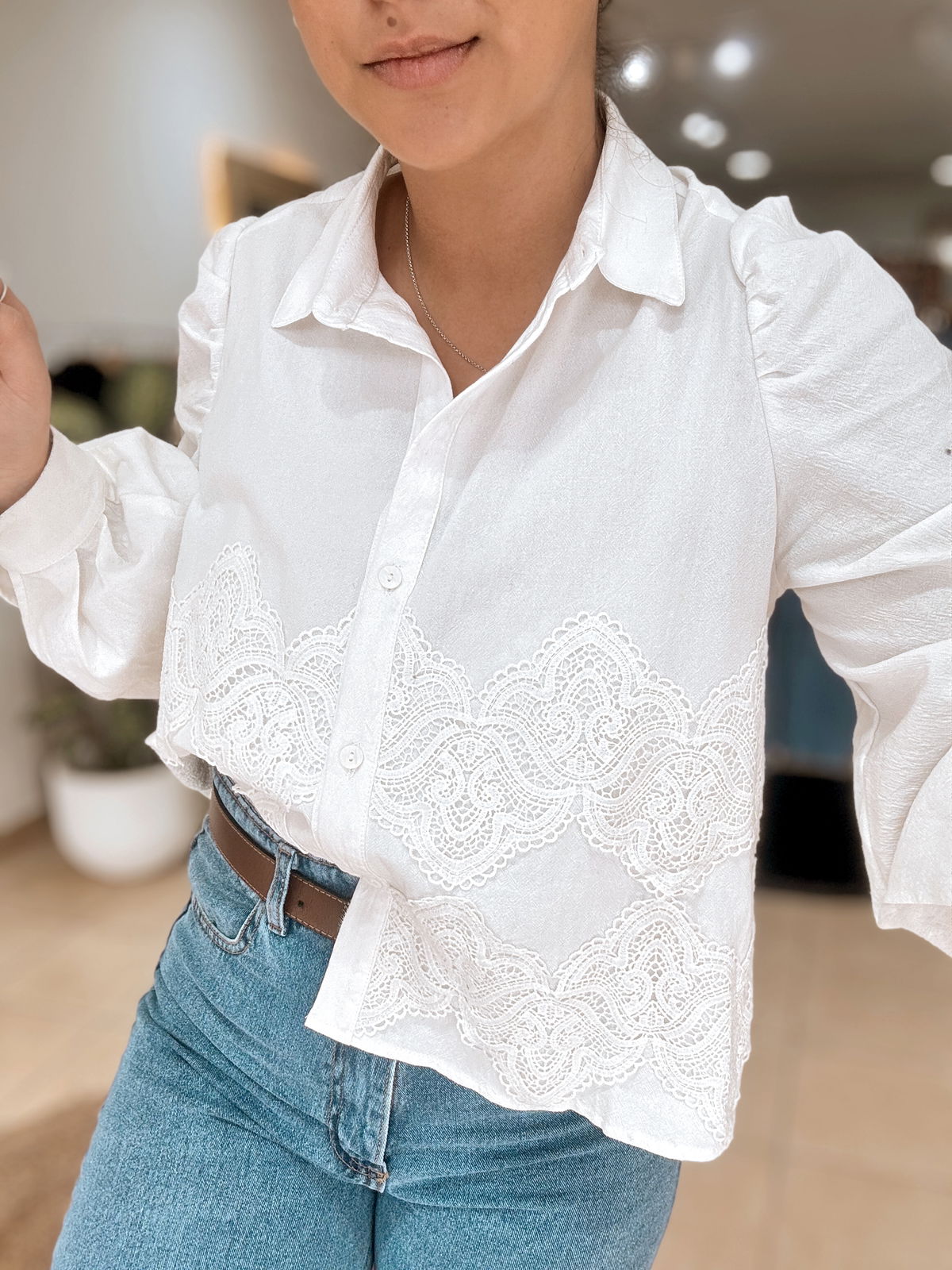 Camisa de lino premium con manga princesa, bordado en la parte inferior. Estilo romántico y fino.