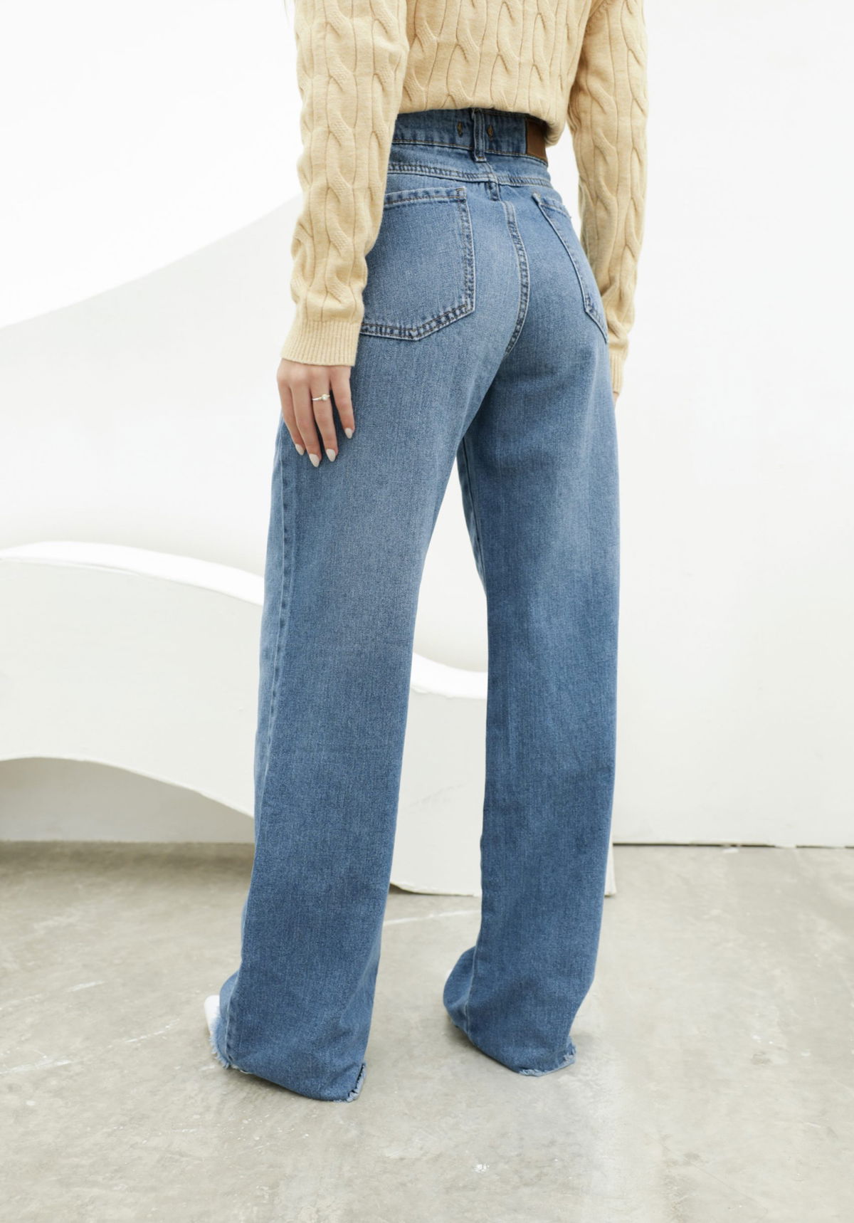 Jean wide leg rígido, semi oscuro con bigotes y desflecado en bota manga. Tiro alto, el calce es chico, recomendamos llevarte un talle más del que soles usar!