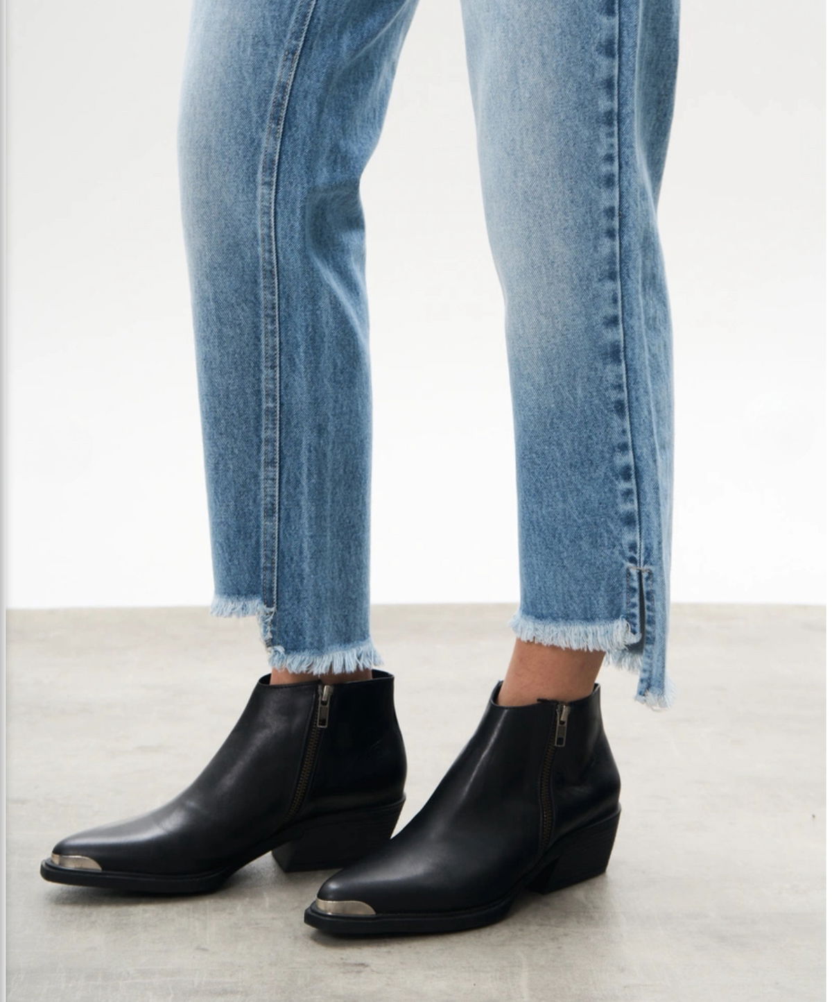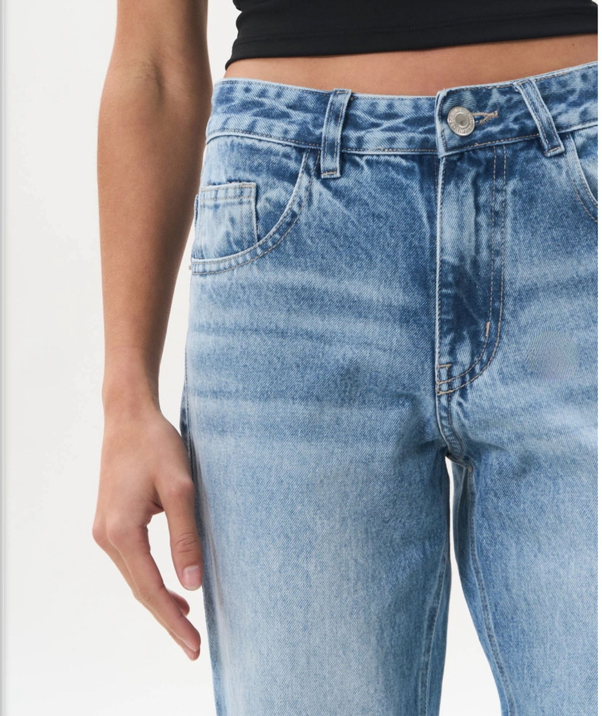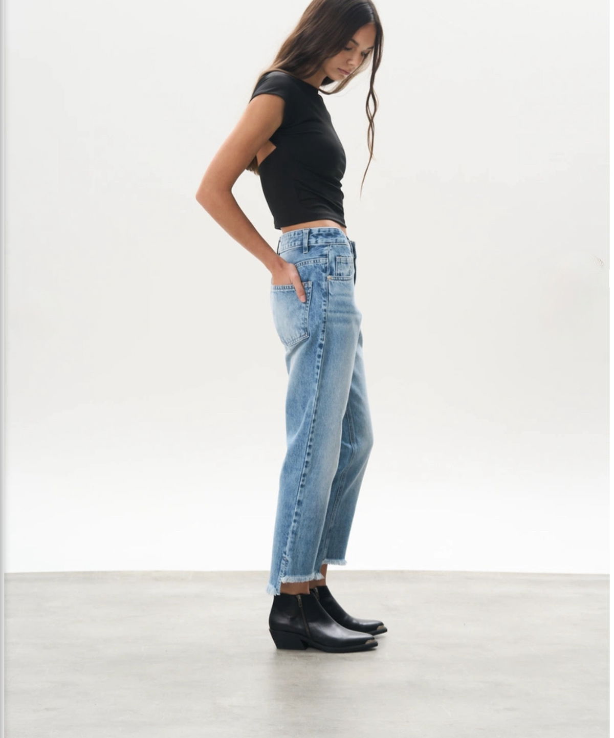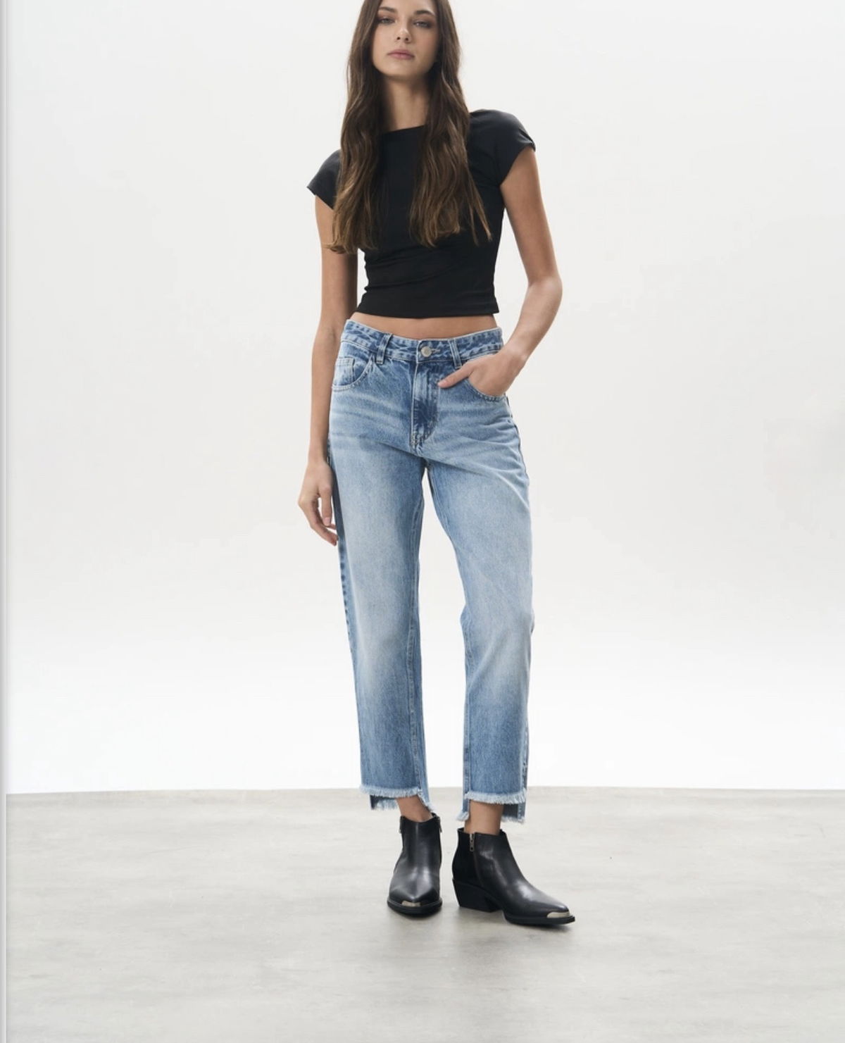 Jean Mom rígido, desflecado con corte irregular en bota manga. Jean súper relajado, canchero, ideal para lucir el calzado!
