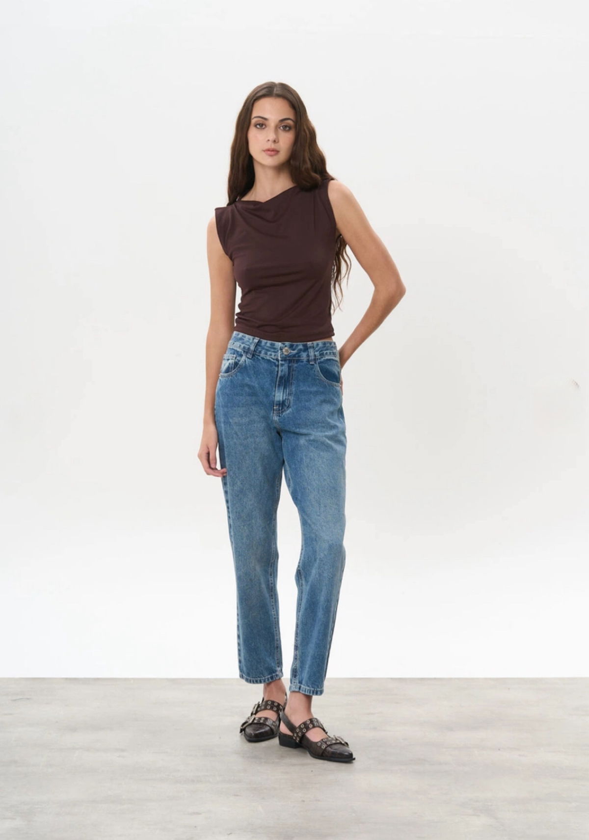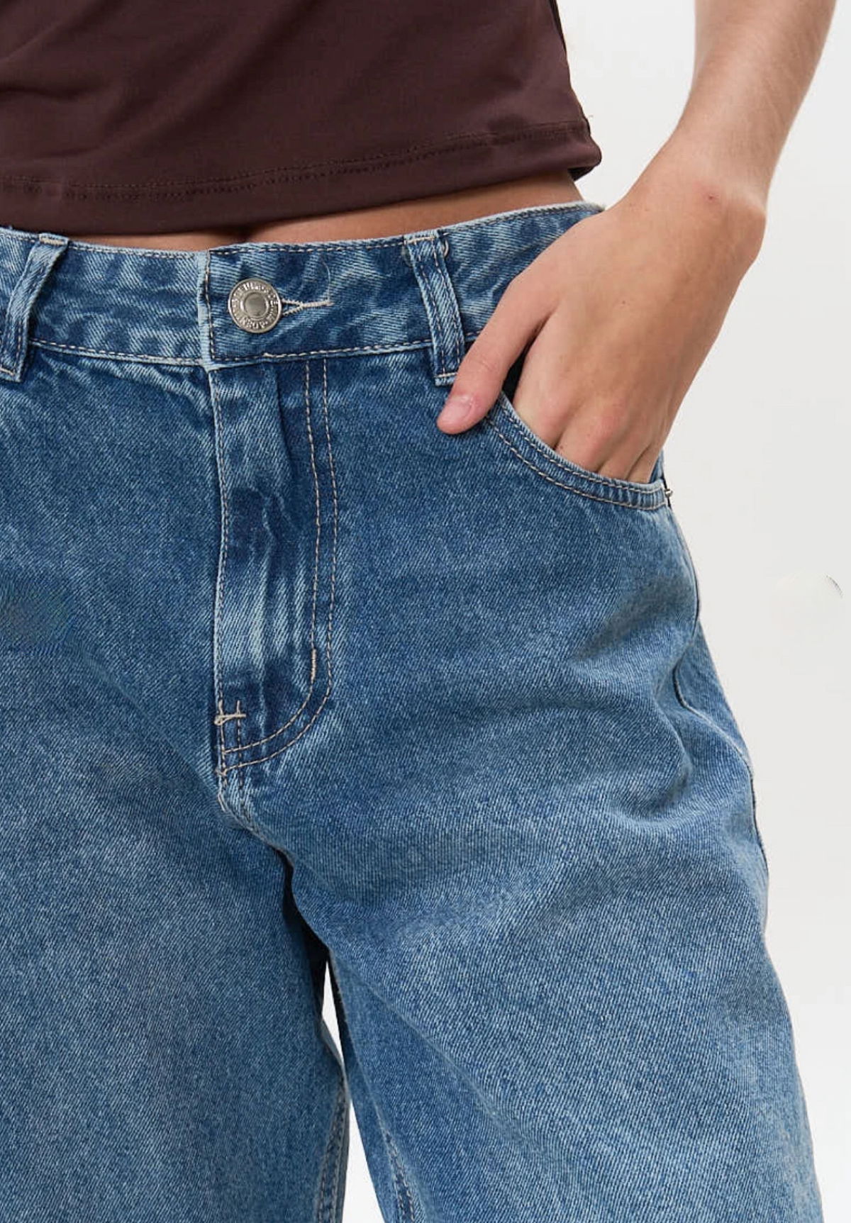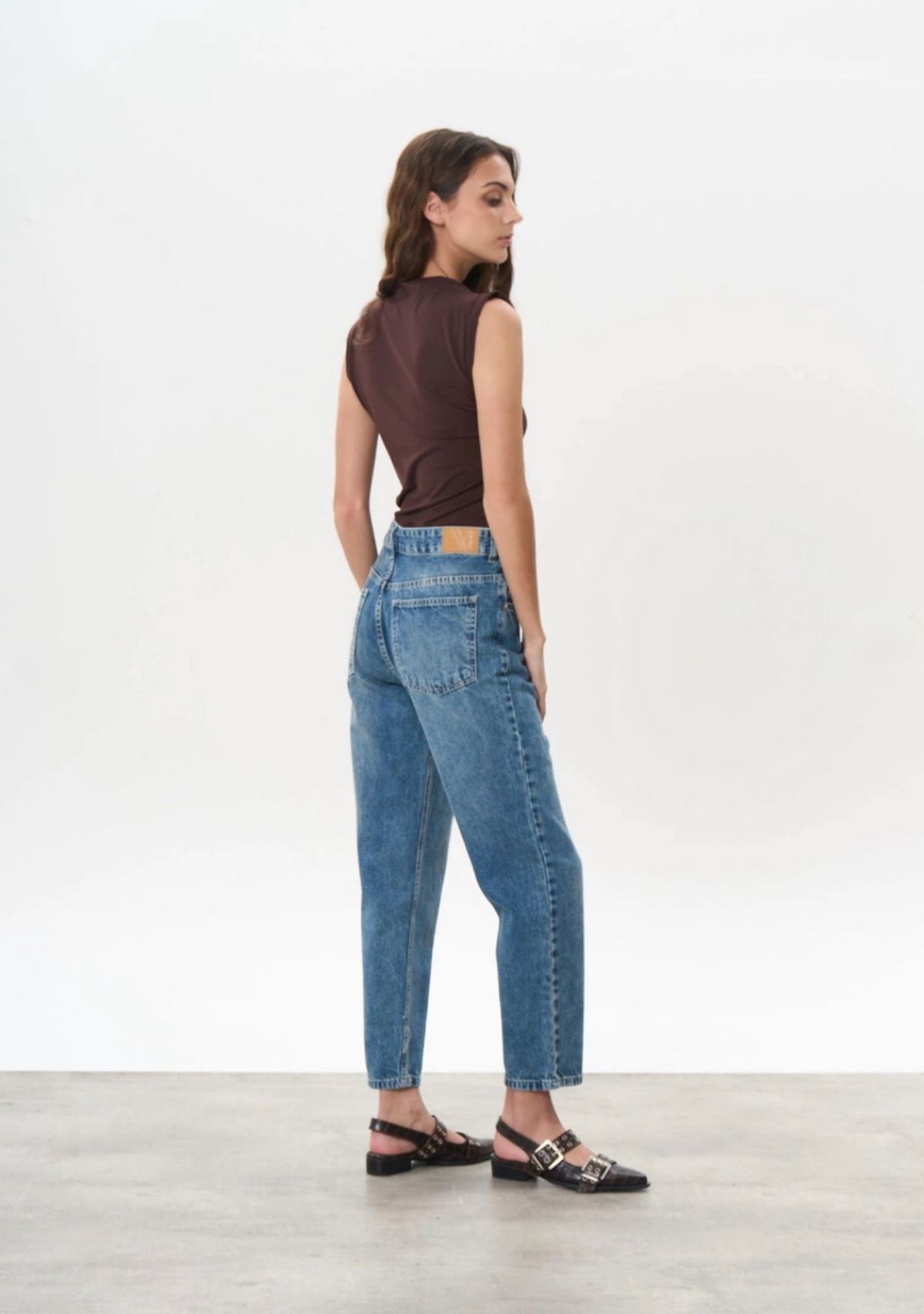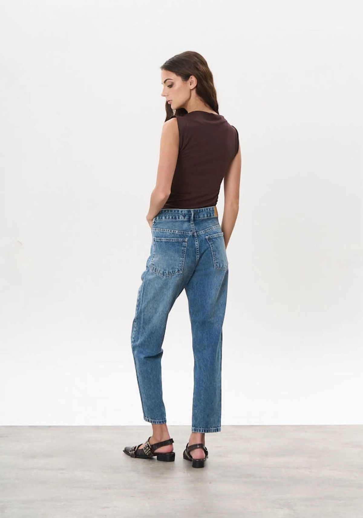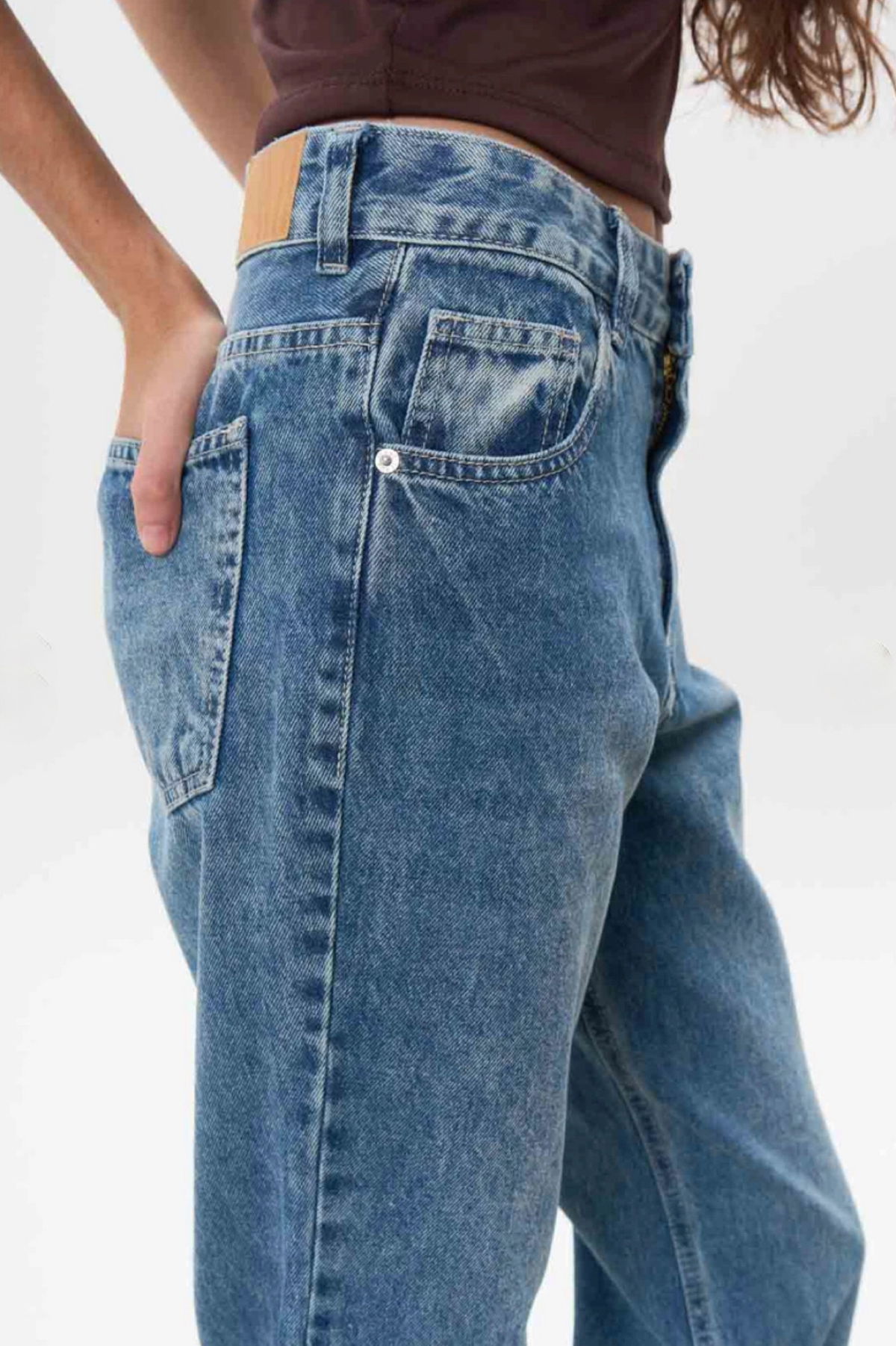 Jean mom rígido, tiro medio. Azul localizado con desgaste, un clásico del local, comodidad 100% ❤️