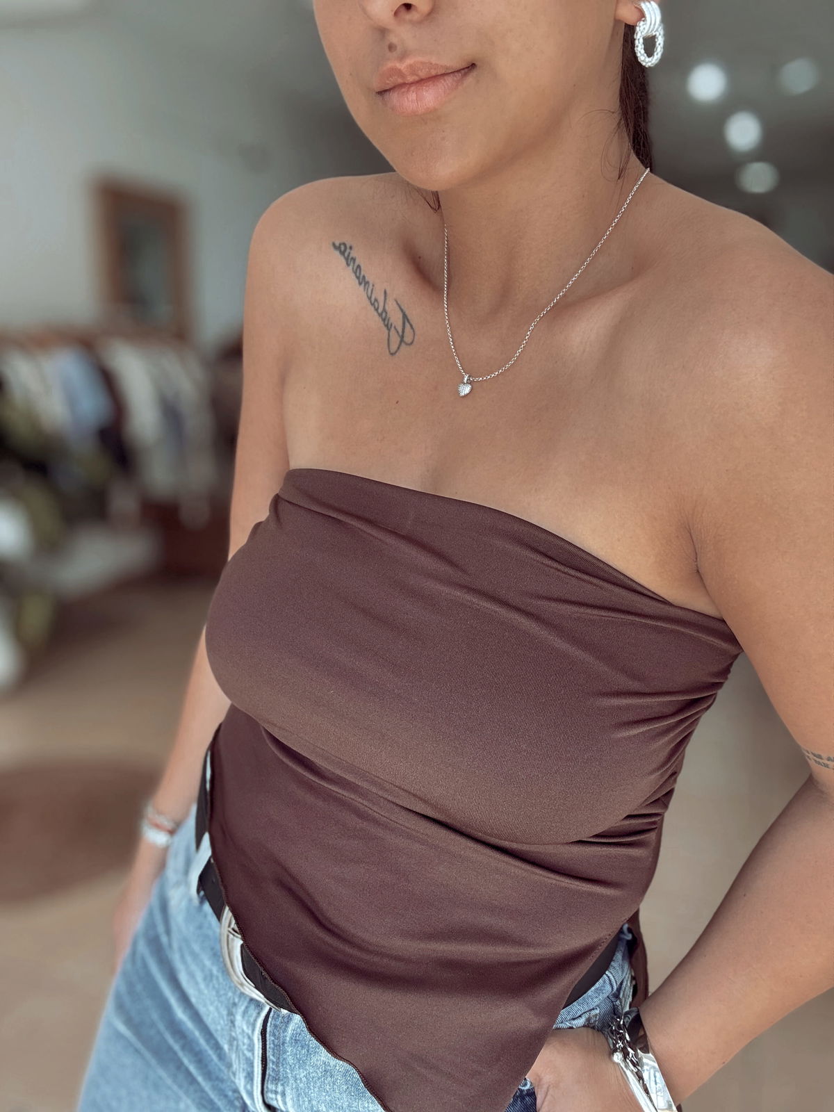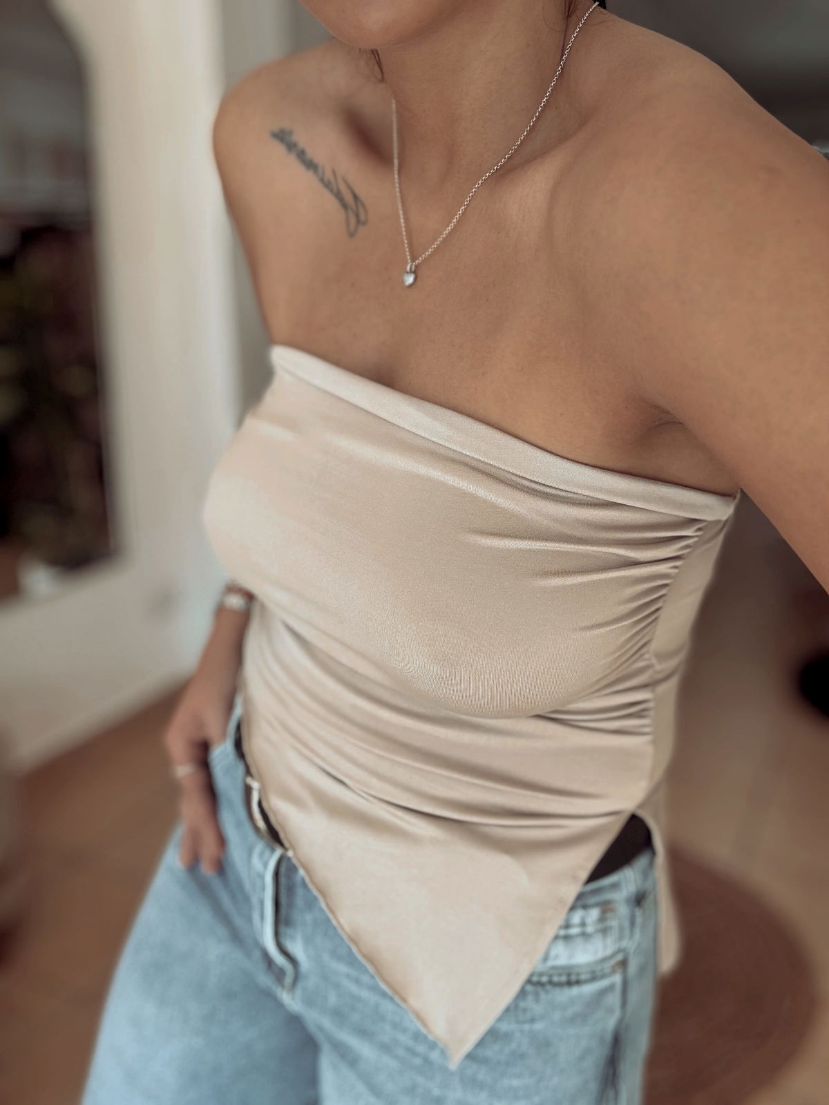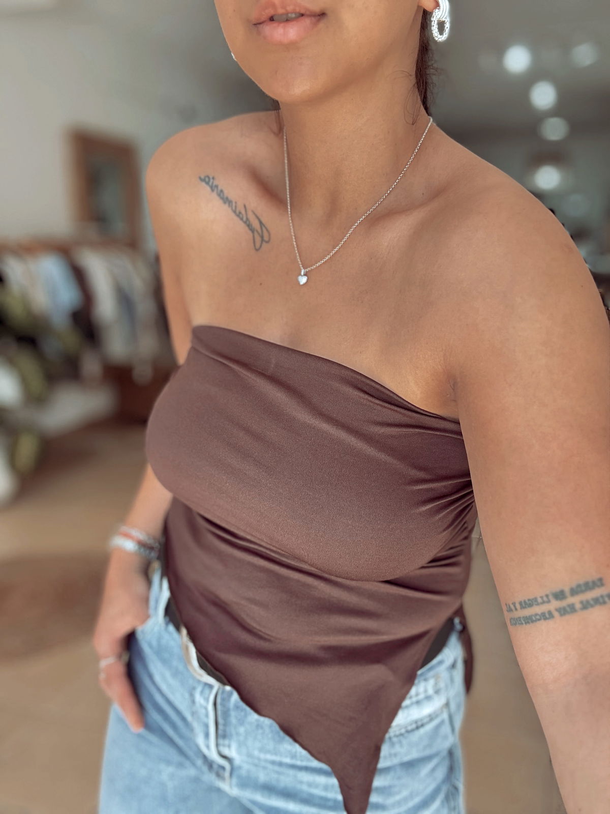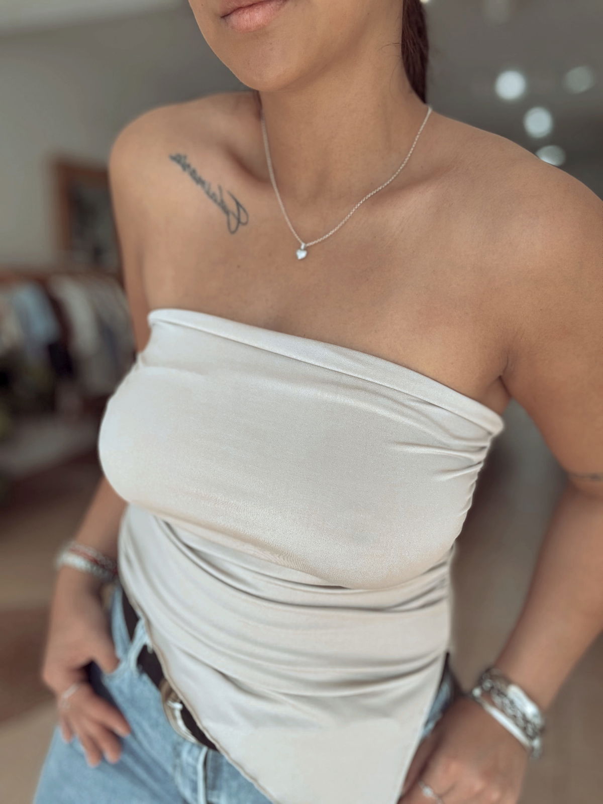 Top strapples de lycra, corte irregular en pico. Tiene frunce en los laterales, la tela es súper elastizada y va hasta un talle 100 de busto