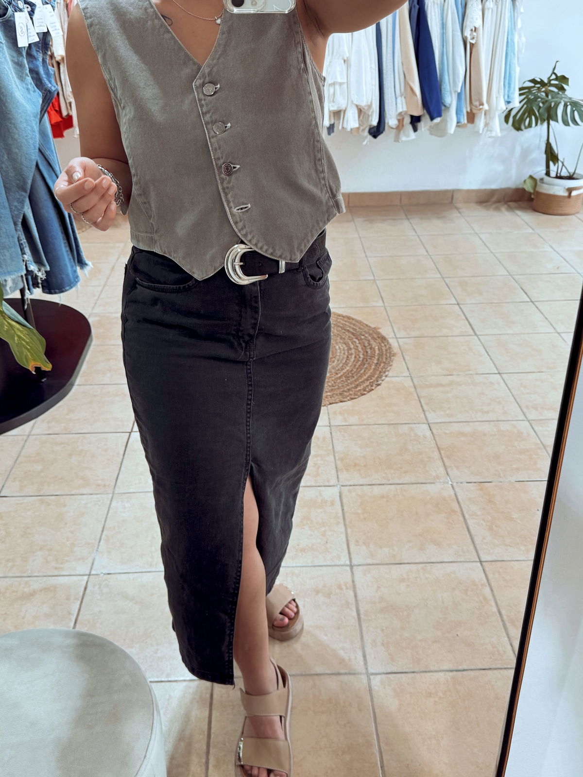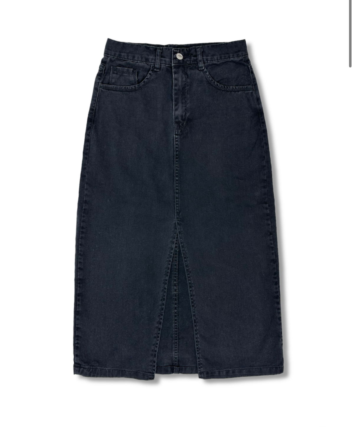 Falda denim gabardina en negro pre lavado, 100% algodón, con tajo delantero